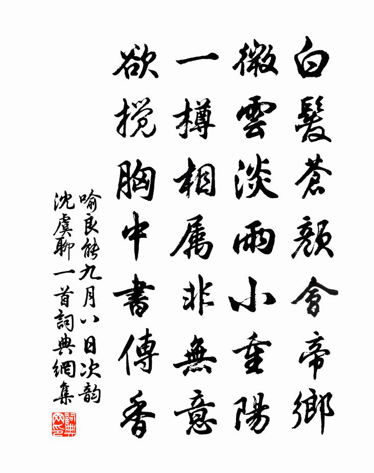 詩詞名句歷史字典書法欣賞書法字典國語詞典說文解字康熙字典古漢語字典標 題 作 者 詩 句 九月八日次韻沈虞聊一首作者:喻良能 朝代:宋代九月八日次韻沈虞聊一首原文白髮蒼顏會帝鄉,微雲淡雨小重陽。一樽相屬非無意,欲攪胸中書傳香。詩詞問答問:九月八日次韻沈虞聊一首的作者是誰?答:喻良能問:九月八日次韻沈虞聊一首寫於哪個朝代?答:宋代喻良能九月八日次韻沈虞聊一首書法欣賞九月八日次韻沈虞聊一首書法作品詩詞推薦客中遇鄉友季芳遠歸省親真山民〔宋代〕河梁邂逅話襟期,獵獵西風透裌衣。酒臉未隨紅葉醉,鄉心先逐白雲飛。客中送客難為別,山上安山胡不歸。借使苔錢趙福元〔宋代〕繞徑玲瓏撒綠錢,田田成百又成千。未知買得春多少,草帶不妨長短芊。示子周南〔宋代〕編軸初黏飾,窗堂略淨蠲。師前無脫履,弟幼與隨肩。苦柰休多食,精絺不耐撋。遲明吾語汝,欲睡更來前。讀蕭何傳有感張鎡〔宋代〕漢祖封肇炎圖,封三傑鹹輔封翼。功成封及酬賞,相國獨第一。發蹤指示語,誰曰匪其實。焉知英主心,方謹操縱次韻曹清父營生墳追和范石湖韻四首方回〔宋代〕古來奕世保松楸,八百姬周四百劉。今代未聞□□□,□時尚想引{魎兩換其}頭。干戈蒿里無完穴,□□蘭亭有人送岩桂二首姜特立〔宋代〕七月濁暑氣氤氳,天香忽墮明月輪。一枝先入西風手,洗我三伏胸中塵。贈雙文元稹〔唐代〕艷極翻含怨,憐多轉自嬌。有時還暫笑,閒坐愛無憀。曉月行看墮,春酥見欲消。何因肯垂手,不敢望回腰。夏旱三首岳珂〔宋代〕問津六輔到長安,滿目疲羸不忍觀。耕耨又孤今歲飽,蓋藏尤比去年難。綺羅有目須令見,鐵石為心方自寬。欲借哀呂東萊鞏豐〔宋代〕嗚呼呂夫子,天姿素顒昂。文獻紹家學,刻意稽虞唐。看書如月,洞照所未詳。雲霧養豹質,彝尊瑑龍章。椎鋒裹送蔣穎叔帥熙河二首秦觀〔宋代〕侍臣不合出都門,為有威名蕃漢尊。戶部左曹回妙手,匈奴右臂落清樽。揮毫珠璧生談笑,轉盼龍鸞在夢魂。瀚海和厲玄侍御題戶部李相公廬山西林草堂姚合〔唐代〕茅屋臨江起,登庸復應期。遙知歸去日,自致太平時。幽藥禪僧護,高窗宿鳥窺。行人盡歌詠,唯子獨能詩。楚江有吊寇準〔宋代〕悲風颯颯起長洲,獨吊靈均恨莫收。深岸自隨浮世變,遺魂不逐大江流。霜淒極浦幽蘭暮,波動寒沙宿雁愁。月落三川誦杜老觀水漲詩晁說之〔宋代〕平生少陵詩,佳處豈盡識。何敢窺意韻,尚且昧形跡。身到三川來,瞀瞀迷咫尺。連天穹谷句,忘飢三嘆息。高高別盈上人韓愈〔唐代〕山僧愛山出無期,俗士牽俗來何時。祝融峰下一回首,即是此生長別離。紹興以後祀五方帝六十首佚名〔宋代〕[太簇徽]昊天之氣,揫斂萬彙。涓日潔齊,有嚴厥祀。有牲維肥,有酒維旨。神之燕娭,錫茲福祉。送觀道人歸故楊億〔宋代〕跡寄浮屠教,心將汗漫遊。無眠長達曙,卻立動經秋。秘決神仙授,靈苗洞壑求。誅芭探虎穴,投仗涸龍湫。丹熟戲呈喻叔奇丈趙蕃〔宋代〕平生喻工部,許我詩盟與。邇來每見每匆匆,倚賴深春間歸路。問我自行何所去,告以吳門當小住。問公公有故人文宣王及其弟子贊宋高宗〔宋代〕邈矣子季,睢陽是伯。屏息受業,延教登席。未踐四科,困涉六籍。祀典載之,好是正直。登庾樓董嗣杲〔宋代〕千年傳說庾公游,遠戌秋塵障兩眸。往事未知誰可語,今朝聊復此登樓。淮山鳥去沖煙滅,楚澤帆歸帶日收。閒客讀秦漢間事王安石〔宋代〕秦徵天下材,入作阿房宮。宮成非一木,山谷為窮空。子羽一炬火,驪山三月紅。能令掃地盡,豈但焚人功。名句推薦小雨空簾,無人深巷,已早杏花先賣。史達祖《夜行船·正月十八日聞賣杏花有感》 畫樓洗淨鴛鴦瓦,彩繩半濕鞦韆架。王元鼎《醉太平·寒食》 莫見長安行樂處,空令歲月易蹉跎。李頎《送魏萬之京》 稚子金盆脫曉冰,彩絲穿取當銀鉦。楊萬里《稚子弄冰》 昭君拂玉鞍,上馬啼紅頰。李白《王昭君二首》 煙塵犯雪嶺,鼓角動江城。杜甫《歲暮》 逐流牽荇葉,緣岸摘蘆苗。儲光羲《江南曲四首》 策馬自沙漠,長驅登塞垣。高適《薊中作》 提三尺劍以定四海吳兢《貞觀政要·卷八·論貢賦》 最傷情、送客鹹陽,佩結西風怨。吳文英《瑣窗寒·玉蘭》