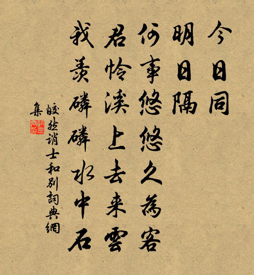 詩詞名句歷史字典書法欣賞書法字典國語詞典說文解字康熙字典古漢語字典標 題 作 者 詩 句 誚士和別作者:皎然 朝代:唐代誚士和別原文今日同,明日隔,何事悠悠久為客。君憐溪上去來雲,我羨磷磷水中石。詩詞問答問:誚士和別的作者是誰?答:皎然問:誚士和別寫於哪個朝代?答:唐代問:誚士和別是什麼體裁?答:七古皎然誚士和別書法欣賞誚士和別書法作品注釋全唐詩:卷819-64詩詞推薦周子及盬簿輓詩二首楊萬里〔宋代〕科目連雙中,聲名莫二渠。手曾攀折檻,客有淚辭車。速化非吾事,偷閒只古書。黑頭黃壤去,有昊定何如。偈頌二十五首釋普岩〔宋代〕此香堪笑又堪悲,剛把愁腸說向誰。冶父山前曾落節,午鈞之重一毫釐。閏九月重九與父老小飲四絕蘇轍〔宋代〕尉佗城下兩重陽,白酒黃雞意自長。卯飲下床虛已散,老年不似少年忙。雜興陸游〔宋代〕鰻井初生一縷雲,鮑郎山下雨昏昏。櫓聲嘔軋秋空曉,水際人家尚閉門。水梔張鎡〔宋代〕汲水埋盆便當池,水梔花旺雪盈枝。江湖萬里何曾遠,祗在先生托興時。倦客齊己〔唐代〕閉眼即開門,人間事倦聞。如何迎好客,不似看閒雲。少欲資三要,多言讓十分。疏慵本吾性,任笑早離群。詩一首李廌〔宋代〕江皋草茅軟,馬首路平寬。嘆老龍鍾態,傷春料峭寒。月檐茅影亂,風瓦竹聲乾。喜從佳公子,詩成槊在鞍。小松二首袁燮〔宋代〕初栽準擬雨如膏,無奈晴暄思鬱陶。造物見憐甘澤霈,倚天會見百尋高。和王安撫六言十首項安世〔宋代〕朅來此事盡廢,少日論功未深。欲覓仙人一指,要看月肋天心。竹枝歌七首楊萬里〔宋代〕吳儂一隊好兒郎,只要船行不要忙。著力大家齊一拽,前頭管取到丹陽。柔上人宋祁〔宋代〕行年逾八十,安坐布金園。指柏仍餘樹,栽桐遂見孫。岩泉晨自濯,經葉夜能翻。顧我生多病,勞師默遣言。韋處士郊居雍陶〔唐代〕滿庭詩境飄紅葉,繞砌琴聲滴暗泉。門外晚晴秋色老,萬條寒玉一溪煙。公子李商隱〔唐代〕一盞新羅酒,凌晨恐易消。歸應沖鼓半,去不待笙調。歌好惟愁和,香濃豈惜飄。春場鋪艾帳,下馬雉媒嬌。李良寵示牡丹長句謹賦三首傅察〔宋代〕如酥小雨壓芳塵,曲檻重來花更新。莫怪東風鍾異美,獨將仙種殿餘春。愧非阿母池邊客,喜見陽台夢裡人。猶恨山中雜興 其六王冕〔元代〕漂泊殊無定,歸來得暫安。不嫌知己少,似覺傍人難。梅屋春風細,松窗夜月寒。交遊成契闊,重檢舊書看。同正輔表兄游白水山蘇軾〔宋代〕偉哉造物真豪縱,攫土摶沙為此弄。劈開翠峽走雲雷,截破奔流作潭洞。因隨化人履巨跡,得與仙兄躡飛鞚。曳杖促拍滿路花(和純陽韻)葛長庚〔宋代〕多才夸李白,美貌說潘安。一朝成萬古,又徒閒。如何猛省,心地種仙蟠。堪嘆人間事,泡沫風燈,阿誰肯做飛仙九日僧舍偶成蔡槃〔宋代〕落帽年年學孟嘉,今年偶客梵王家。石床齋散門初掩,細雨聲中落菊花。春日登樓遇雨杜荀鶴〔唐代〕忽地晴天作雨天,全無暑氣似秋間。看看水沒來時路,漸漸雲藏望處山。風趁鷺鷥雙出葦,浪催漁父盡歸灣。一心採桑子(一名醜奴兒、羅敷媚、羅敷艷歌)李煜〔唐代〕轆轤金井梧桐晚,幾樹驚秋。晝雨如愁,百尺蝦須上玉鉤。瓊窗春斷雙蛾皺,回首邊頭。欲寄鱗游,九曲寒波不溯名句推薦一輪秋影轉金波,飛鏡又重磨。辛棄疾《太常引·建康中秋夜為呂叔潛賦》 手種堂前垂柳,別來幾度春風?歐陽修《朝中措·送劉仲原甫出守維揚》 眇眇孤舟逝,綿綿歸思紆。陶淵明《始作鎮軍參軍經曲阿作》 禍之所由生也,生自纖纖也。荀子《荀子·大略》 催促年光,舊來流水知何處。廖世美《燭影搖紅·題安陸浮雲樓》 禁菸不到粵人國,上冢亦攜龐老家。趙鼎《寒食》 位卑未敢忘憂國,事定猶須待闔棺。陸游《病起書懷》 江山如有待,花柳自無私。杜甫《後游》 翠輦不來金殿閉,宮鶯銜出上陽花雍陶《天津橋望春》 一點烽傳散關信,兩行雁帶杜陵秋。陸游《秋晚登城北樓》