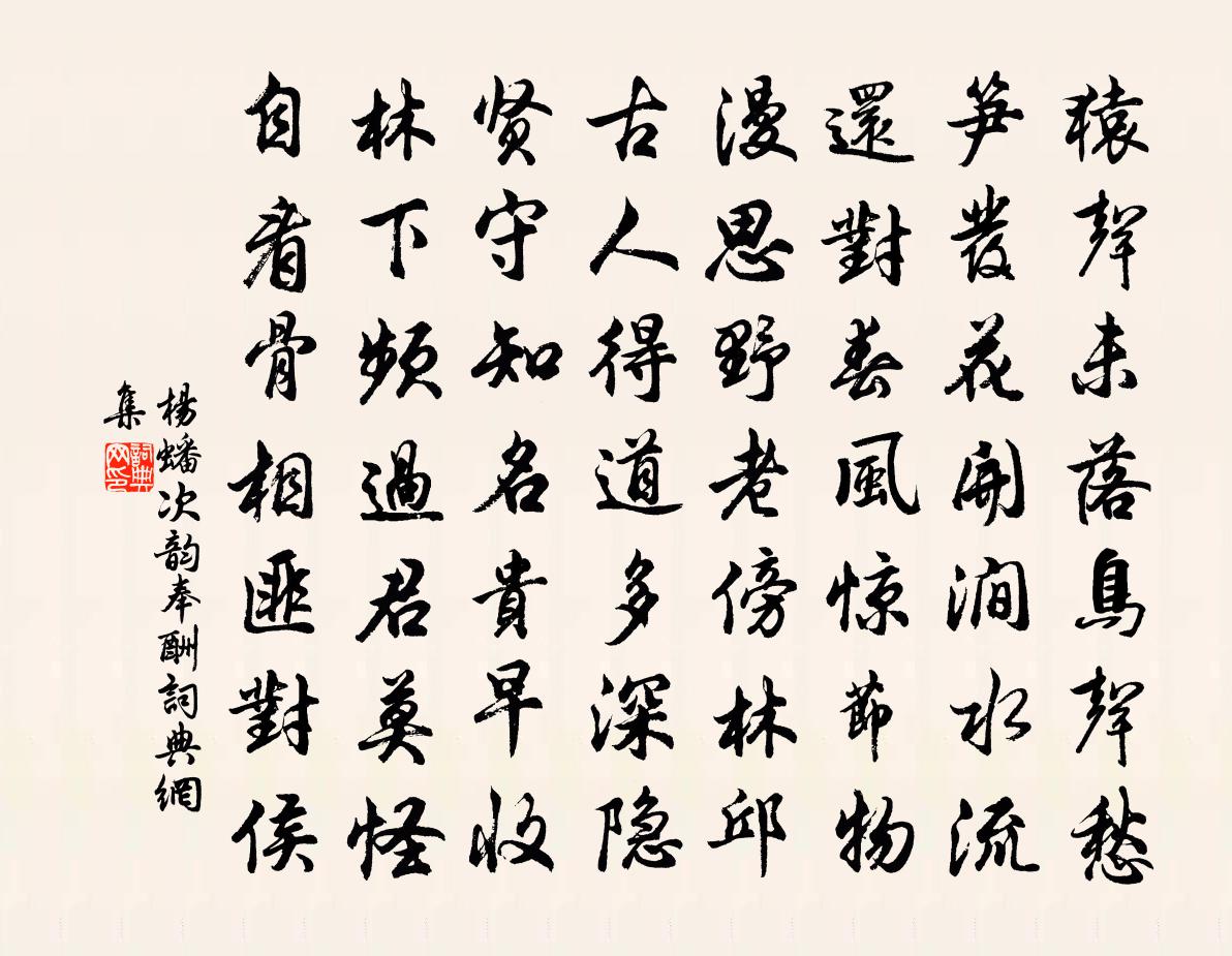 詩詞名句歷史字典書法欣賞書法字典國語詞典說文解字康熙字典古漢語字典標 題 作 者 詩 句 次韻奉酬作者:楊蟠 朝代:宋代次韻奉酬原文猿聲未落鳥聲愁,筍發花開澗水流。還對春風驚節物,漫思野老傍林邱。古人得道多深隱,賢守知名貴早收。林下頻過君莫怪,自看骨相匪對侯。詩詞問答問:次韻奉酬的作者是誰?答:楊蟠問:次韻奉酬寫於哪個朝代?答:宋代楊蟠次韻奉酬書法欣賞次韻奉酬書法作品詩詞推薦山間早春真山民〔宋代〕小桃枝上認年華,隨分紅開一兩花。將謂春風只城市,也吹春色到山家。句俞可〔宋代〕拂座好風來橘社,隔汀長笛過松江。寄鄭谷郎中(一作住襄州謁鄭谷獻詩)齊己〔唐代〕高名喧省闥,雅頌出吾唐。疊巘供秋望,無雲到夕陽。自封修藥院,別掃著僧床。幾夢中朝事,依依鵷鷺行。論誠鄭俠〔宋代〕萬事以誠立,不誠心不專。誠心非鐵石,鐵石被誠穿。送人游雍京齊己〔唐代〕君來乞詩別,聊與愴前程。九野未無事,少年何遠行。商雲盤翠險,秦甸下煙平。應見周南化,如今在雍京。別聶之美司馬光〔宋代〕客宦常漂泊,離懷徒自勞。貧無衣換酒,空有涕沾袍。木葉寒猶在,江潮暮更豪。行舟遠不見,賴有片帆高。和淨因有作王安石〔宋代〕朝紅一片墮窗塵,禪客翛然感此辰。更覺城中芳意少,不如山野早知春。挽樓樞密二首吳芾〔宋代〕憶昔登龍日,從容接勝游。軒窗臨綠野,尊俎俯清流。尚欲榮花塢,那知負釣舟。新阡何處是,極目暮雲愁。寓興十首張至龍〔宋代〕夏月灌鞠根,見花在秋日。先時不施工,臨花已何及。游龍門自潛溪過寶應精舍梅堯臣〔宋代〕遙愛夏景佳,行行清興屬。安知轉回溪,始覺來平谷。古殿藏竹間,香庵遍岩曲。雲霞弄霽暉,草樹含新綠。時鳥太寥歌張志和〔唐代〕化元靈哉,碧虛清哉,紅霞明哉。冥哉茫哉,惟化之工無疆哉。訪皇甫七白居易〔唐代〕上馬行數里,逢花傾一杯。更無停泊處,還是覓君來。示李叔時二首王安石〔宋代〕千山訪我幾摧輈,清坐來看十日留。勢利白頭何足道,古人傾蓋有綢繆。青州夏竦〔宋代〕日上西山舞鸞鶴,波翻碧海斗蛟龍。直鉤到了成何事,消得君王四履封。塞下鮑溶〔唐代〕北風號薊門,殺氣日夜興。鹹陽三千里,驛馬如飢鷹。行子久去鄉,逢山不敢登。寒日慘大野,虜雲若飛鵬。西北曉枕陸游〔宋代〕曉枕鶯聲帶夢聽,忽看淡日滿窗欞。閒愁誰遣濃如酒,醉過殘春不解醒。賦漁村晚照劉黻〔宋代〕自許同漁乾,築廬雲水鄉。利名俱是幻,鷗鷺亦相忘。古塔明秋樹,歸舟動夕陽。臨流不盡意,何必問瀟湘。奉高道中作晁說之〔宋代〕雲埋樹林遠,雨添山色重。我馬自知行,秋風更相送。悠悠鄒魯間,此意將誰共。明朝是別離,想此如殘夢。頌古九十八首釋印肅〔宋代〕覿面相呈也大奇,更無分別與遲疑。自從收得非離合,豈可虛明放過伊。精金百練方為貴,脫體靈明絕見知。檄充晉康考官舟行薄暮霞光與水相映緬懷諸幕曾豐〔宋代〕水作琉璃碧,霞為琥珀紅。因依光迭射,畢竟色俱空。鼓楫乘秋氣,掀篷納晚風。長教涼似許,判得住南中。名句推薦勞苦之事則爭先,饒樂之事則能讓。荀子《荀子·修身》 醉別復幾日,登臨遍池台。李白《魯郡東石門送杜二甫》 孤煙村際起,歸雁天邊去。孟浩然《南歸阻雪》 恐是仙家好別離,故教迢遞作佳期。李商隱《辛未七夕》 花無人戴,酒無人勸,醉也無人管。黃公紹《青玉案·年年社日停針線》 樓外垂楊千萬縷。欲系青春,少住春還去。朱淑真《蝶戀花·送春》 舉頭忽見衡陽雁。千聲萬字情何限。陳達叟《菩薩蠻·舉頭忽見衡陽雁》 無奈朝來寒雨,晚來風。李煜《相見歡·林花謝了春紅》 粽包分兩髻,艾束著危冠。陸游《乙卯重五詩》 獨睡起來情悄悄,寄愁何處好。納蘭性德《謁金門·風絲裊》