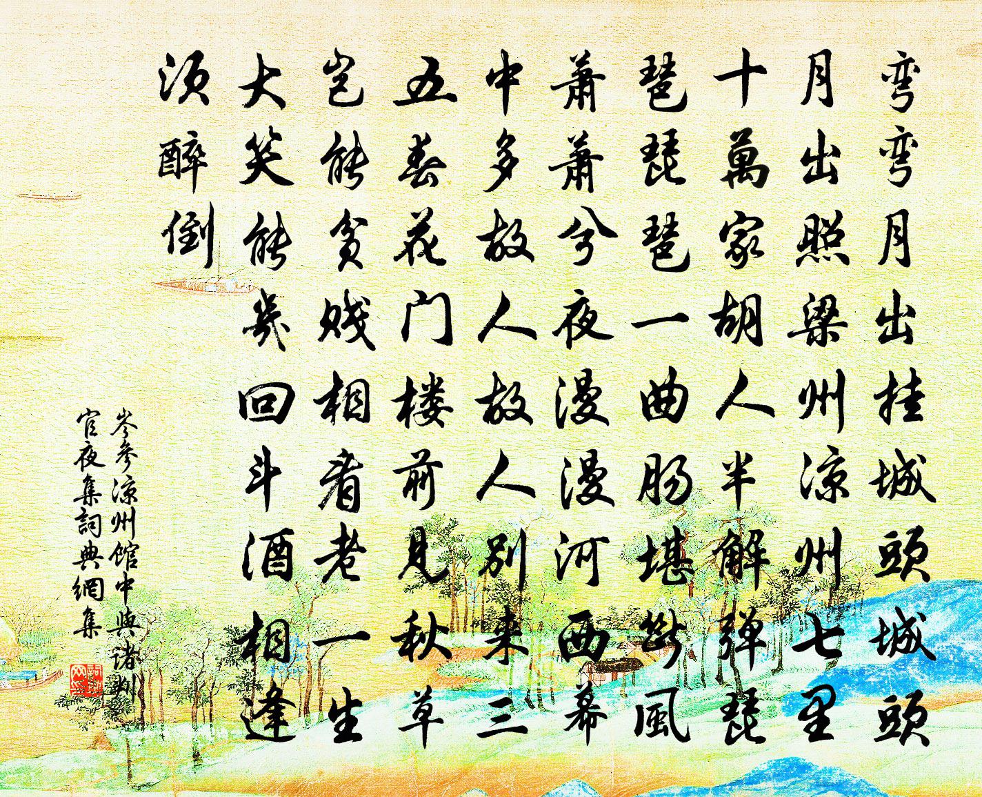 彎彎月出掛城頭,城頭月出照梁州。涼州七里十萬家,胡人半解彈琵琶。