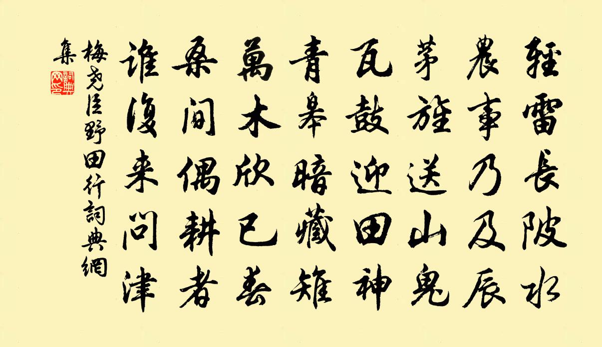 詩詞名句歷史字典書法欣賞書法字典國語詞典說文解字康熙字典古漢語字典標 題 作 者 詩 句 野田行作者:梅堯臣 朝代:宋代野田行原文輕雷長陂水,農事乃及辰。茅旌送山鬼,瓦鼓迎田神。青皋暗藏雉,萬木欣已春。桑間偶耕者,誰復來問津。詩詞問答問:野田行的作者是誰?答:梅堯臣問:野田行寫於哪個朝代?答:宋代問:梅堯臣的名句有哪些?答:梅堯臣名句大全梅堯臣野田行書法欣賞野田行書法作品詩詞推薦泛渦水二首宋祁〔宋代〕川上輕風正滿旗,幽尋不憚進舟遲。蘭橈過後汀煙合,卻見驚鷗自下時。除夜自石湖歸苕溪 其十姜夔〔宋代〕環玦隨波冷未銷,古苔留雪臥牆腰。誰家玉笛吹春怨,看見鵝黃上柳條。君馬黃李白〔唐代〕君馬黃,我馬白。馬色雖不同,人心本無隔。共作遊冶盤,雙行洛陽陌。長劍既照曜,高冠何赩赫。各有千金裘,武陵春曹勛〔宋代〕慘慘江雲渾不動,玉雪耿孤芳。萼綠仙人帶暗香。風韻冷尤長。隴信不來寒日晚,疏影照澄江。肯借橫斜伴酒觴。哨遍·高祖還鄉睢景臣〔元代〕社長排門告示,但有的差使無推故,這差使不尋俗。一壁廂納草也根,一邊又要差夫,索應付。又是言車駕,都說寒食相將諸子游翟得園十詩楊萬里〔宋代〕花木從渠取次栽,青山那肯入城隈。翟公不有驅山手,城裡松林底處來。別張袁州五首彭龜年〔宋代〕富貴不可求,名節可不修。韓公三上書,所願略不酬。柳子百世文,莫洗一日羞。要須外無累,乃免罟獲憂。青青春遊西園朱淑真〔宋代〕閒步西園裡,春風明媚天。蝶疑莊叟夢,絮憶謝娘聯。踏草青茵軟,看花紅錦鮮。徘徊月影下,欲去又依然。句周文璞〔宋代〕本是離騷國里人。挽李小溪馬廷鸞〔宋代〕三十年間借一瓻,鵠袍門外欠相攜。降霜御史風棱惡,瞎眼春官日色迷。送從叔士準赴任潤州司士盧綸〔唐代〕雲起山城暮,沈沈江上天。風吹建業雨,浪入廣陵船。久是吳門客,嘗聞謝守賢。終悲去國遠,淚盡竹林前。修真觀李道士年老貧餓無所依忽縊死因為詩以梅堯臣〔宋代〕唐室王子後,黃冠事隱淪。餐霞不滿腹,披雲不蔽身。八十不能死,縊以頭上巾。始慕老莊術,終厭道德貧。營營雜劇·破幽夢孤雁漢宮秋馬致遠〔元代〕楔子(沖末扮番王引部落上,詩云)氈帳秋風迷宿草,穹廬夜月聽悲笳。控弦百萬為君長,款塞稱藩屬漢家。某乃喜天游二十一兄至毫社時同叔夏十六兄作曾幾〔宋代〕登高望南都,雉堞疑可數。城中人不見,百里等燕楚。我無簡書畏,自笑誰縛汝。東風送兄來,下馬逼三鼓。迎門和開祖丹陽別子瞻後寄陳舜俞〔宋代〕仙舟系柳野橋東,會合情多勞謫翁。相對一樽浮蟻酒,輕寒二月小桃風。羈懷散誕謳歌里,世事縱橫醉笑中。莫恨皇帝閣端午帖子許應龍〔宋代〕離明赫赫正當中,萬物鹹欣長養風。隴麥已登蠶又熟,更多膏澤兆年豐。題共樂亭程師孟〔宋代〕千門日照珍珠市,萬心煙生碧玉城。山海是為中國藏,梯航尤見外夷情。七禽詠早耕早布劉學箕〔宋代〕早耕早巾,節物如流春色暮。金房土瘠無稻田,布耕播種種何處。一春焦涸旱無雨,麥穗藏頭猶未吐。麥穗不吐人端午帖子太上皇后閣周必大〔宋代〕池藥風煙淨,壺天日月長。寶書繙蕊笈,碧穗裊爐香。鼓腹無所思朝起暮歸眠湫明詩也以詩定韻為十滕岑〔宋代〕少習舉了業,不能中科目。暮竟為尉丞,州縣甘碌碌。四任奉真祠,一家仰雨祿。勿雲腹負予,予亦負此腹。名句推薦為近都門多送別,長條折盡減春風。白居易《青門柳》 胡蝶夢中家萬里,子規枝上月三更。崔塗《春夕》 二十四橋仍在,波心蕩、冷月無聲。姜夔《揚州慢·淮左名都》 峰巒如聚,波濤如怒,山河表里潼關路。張養浩《山坡羊·潼關懷古》 天長路遠魂飛苦,夢魂不到關山難。李白《長相思·其一》 萬里橋邊多酒家,遊人愛向誰家宿。張籍《成都曲》 紗廚藤簟,玉人羅扇輕縑。白樸《天淨沙·夏》 惜恐鏡中春。不如花草新。張先《菩薩蠻·憶郎還上層樓曲》 謫仙何處,無人伴我白螺杯。黃庭堅《水調歌頭·遊覽》 卷旗夜劫單于帳,亂斫胡兒缺寶刀。馬戴《出塞詞》