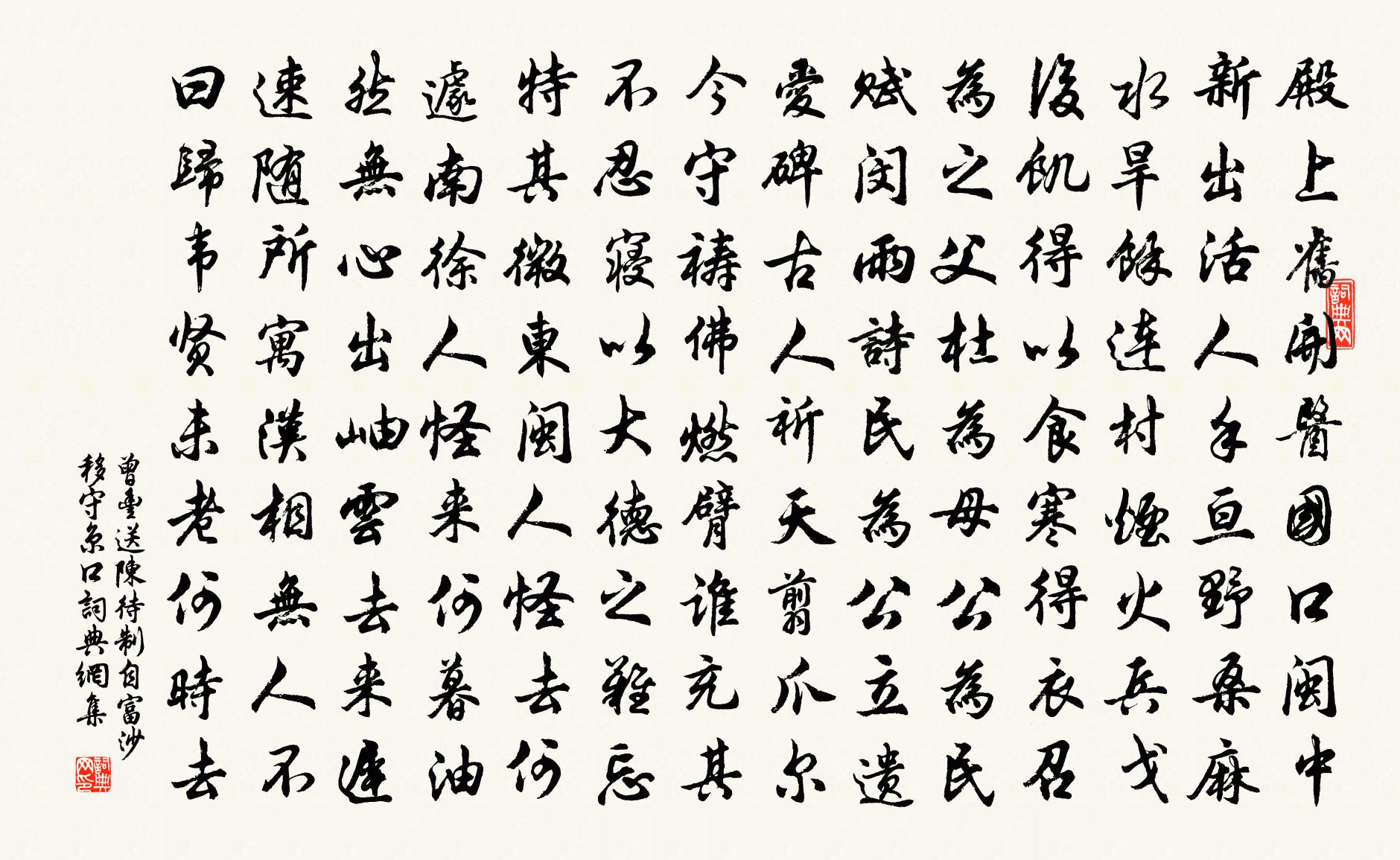 詩詞名句歷史字典書法欣賞書法字典國語詞典說文解字康熙字典古漢語字典標 題 作 者 詩 句 送陳待制自富沙移守京口作者:曾豐 朝代:宋代送陳待制自富沙移守京口原文殿上舊開醫國口,閩中新出活人手。亘野桑麻水旱余,連村煙火兵戈後。飢得以食寒得衣,召為之父杜為母。公為民賦閔雨詩,民為公立遺愛碑。古人祈天翦爪爾,今守禱佛燃臂誰。充其不忍寢以大,德之難忘特其微。東閩人怪去何遽,南徐人怪來何暮。油然無心出岫雲,去來遲速隨所寓。漢相無人不曰歸,韋賢未老何時去。詩詞問答問:送陳待制自富沙移守京口的作者是誰?答:曾豐問:送陳待制自富沙移守京口寫於哪個朝代?答:宋代曾豐送陳待制自富沙移守京口書法欣賞送陳待制自富沙移守京口書法作品詩詞推薦九日過後漫題堂前雙菊強至〔宋代〕花日金相照,條風翠競翻。誰言羞晚艷,自喜勝孤根。客土深培力,家人一溉恩。秋香真好在,未易負清樽。初歸雜詠陸游〔宋代〕窗下初收剝啄棋,疏簾窣地畫陰移。下岩石潤揮毫後,正焙茶香落磑時。癃老入朝元是錯,期年決去已為遲。天公韓仲和南窗葛紹體〔宋代〕一榻臥雲長至日,半爐宿火欲明時。年年來此南窗下,不怕風霜容易欺。相州山池作張說〔唐代〕嘗懷謝公詠,山水陶嘉月。及此年事衰,徒看眾花發。觀魚樂何在,聽鳥情都歇。星漢流不停,蓬萊去難越。鄴中某近與和叔游景愛之不足因吟短篇以贈強至〔宋代〕夫子南州傑,相逢出肺肝。平生潛聖閫,壯歲尚儒冠。鴟鷃霄垠擊,蛟龍井底蟠。恥將孤憤劍,容易向 * 。和孔純老送司法吳德聲王之道〔宋代〕舞腰回雪奏伊涼,餞設鈴齋舉別觴。如子固宜傾坐客,顧予何計挽征艎。交情舊喜推東道,歸夢先應到北堂。花柳華陽吟三十首白玉蟾〔宋代〕夢幻之身不久長,桑榆能幾耐風霜。何如跳出利名窟,贈汝長生不死方。宋玉對楚王問宋玉〔先秦〕楚襄王問於宋玉曰:“先生其有遺行與?何士民眾庶不譽之甚也!” 宋玉對曰:“唯,然,有之!願大王寬其溧水道中回寄子肅玉汝並屬李晦庵八首趙蕃〔宋代〕懷綬新括州,乘驄前御史。一州與天下,先後寧同軌。縱雲山水佳,何與於瘡{瘡倉換胡}。次韻韓毅伯別許宣教王炎〔宋代〕自說羈懷老更慵,淮山入夢碧叢叢。一尊醽醁人將別,三疊陽關曲易終。此去若無鴻雁信,相望未免馬牛風。耘雲七絕句羅公升〔宋代〕水旱關何事,兵凶孰汝憐。但尋師壁谷,莫誤客求田。江漲用過韻蘇軾〔宋代〕草木生故墟,牛羊滿空瀆。春江圍草市,夜浪浮竹屋。已連漲海白,尚帶霍山綠。坎離更休王,魚鱉橫陵陸。得非震山岩莫若晦〔宋代〕一岩孤峻出塵埃,下瞰僧坊七寶台。鴻鵠凌空無礙去,浮山供望有情來。臨風笑語飄飄遠,舉酒襟懷落落開。莫訝小重山佚名〔宋代〕水風生處小亭臨。見佳人負錢出路鄭世翼〔唐代〕獨負千金價,應從買笑來。只持難發口,經為幾人開。題李杜蘇黃像少陵洪咨夔〔宋代〕風雲慘澹豺貙吼,日憂無飯仍無酒。秋來東屯熟 * ,舉家歡呼拍銅斗。老天欲釀兒欲炊,老夫怕醒兒怕飢。商量會真詩(夏守真)雲台峰女〔唐代〕共作雲山侶,俱辭世界塵。靜思前日事,拋卻幾年身。薛殿院將赴闕先歸絳台迎覲魏野〔宋代〕不妨赴詔暫歸寧,躍馬惟消兩火程。七十嚴君千萬喜,彩衣爭似繡衣榮。和魏桐城題三瀑泉贈湯洞卿王之道〔宋代〕雨雹碎晴峰,珠璣瀉石壁。勢增九軍勇,氣壓百夫特。先生我輩人,一見願自適。壯哉三瀑泉,表表塵外物。立春日陸龜蒙〔唐代〕去年花落時,題作送春詩。自為重相見,應無今日悲。道孤逢識寡,身病買名遲。一夜東風起,開簾不敢窺。名句推薦飛雪帶春風,裴回亂繞空。劉方平《春雪》 綠楊芳草長亭路。年少拋人容易去。晏殊《玉樓春·春恨》 細雨春蕪上林苑,頹垣夜月洛陽宮。陸游《書憤五首·其二》 大鵬飛兮振八裔,中天摧兮力不濟。李白《臨路歌》 寒山轉蒼翠,秋水日潺湲。王維《輞川閒居贈裴秀才迪》 烏啼鵲噪昏喬木,清明寒食誰家哭。白居易《寒食野望吟》 鳳凋碧柳愁眉淡,露染黃花笑靨深。晏幾道《鷓鴣天·九日悲秋不到心》 坐上別愁君未見,歸來欲斷無腸。蘇軾《臨江仙·送王緘》 夢魂慣得無拘檢,又踏楊花過謝橋。晏幾道《鷓鴣天·小令尊前見玉簫》 赤日炎炎似火燒,野田禾稻半枯焦。施耐庵《水滸傳·第十六回》