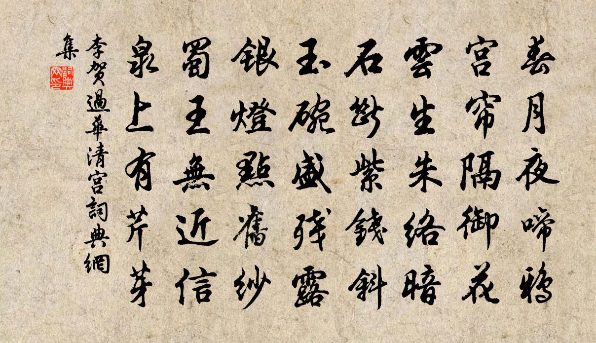 尾聯的諷刺意味更加強烈。“蜀王”指李隆基。唐玄宗逃避入蜀,故稱之,而帝不稱帝,其意自明。又說他“無近信”,即逃跑之後便毫無信息,對社稷危亡和百姓的苦難不聞不問,無所作為,連帝位也被兒子李亨奪了。這又是絕妙的嘲諷和大膽的揭露。舊時代的注家對李賀嘲笑本朝皇帝為“蜀王”這一點,或有意曲解,或予以指責。比如姚文燮說:“蜀王本梁王愔也,貞觀十年徙蜀,好游數畋弋獵,帝怒,遂削封。賀當春夜過此,追誚之。”(《昌谷集注》卷一)他們的歪曲和指斥,更說明李賀反封建的叛逆精神的可貴。結句同上句聯繫起來看,頗為纖曲,意思是說:玄宗剛奔蜀之時,華清池上便已經長滿了水芹;何況歷久經年,玄宗再也不來臨幸,泉上水芹又在春天裡萌發出嫩綠的新芽了。這個結尾,以景結情,即小見大,既表現出華清宮的淒冷、荒寂,又寄寓了詩人“黍離麥秀”之感慨,有言外之意,故頗為方扶南等注家讚賞。