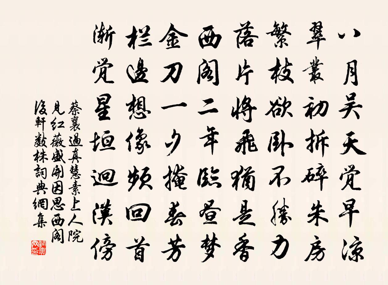 詩詞名句歷史字典書法欣賞書法字典國語詞典說文解字康熙字典古漢語字典標 題 作 者 詩 句 過真慧素上人院見紅薇盛開因思西閣後軒數株作者:蔡襄 朝代:宋代原文八月吳天覺早涼,翠叢初拆碎朱房。繁枝欲臥不勝力,落片將飛猶是香。西閣二年臨晝夢,金刀一夕掩春芳。欄邊想像頻回首,漸覺星垣迥漢傍。詩詞問答問:《過真慧素上人院見紅薇盛開因思西閣後軒數株》的作者是誰?答:蔡襄問:該詩寫於哪個朝代?答:宋代書法欣賞過真慧素上人院見紅薇盛開因思西閣後軒數株書法作品詩文賞析【原題】:過真慧素上人院見紅薇盛開因思西閣後軒數株遂成短章寄翰林原叔八丈禹玉閣長兼書真慧壁間以記所遇詩詞推薦和吳侍郎寓趙中令韓王宅宋庠〔宋代〕平昔元勛第,多年洛水頭。荒池威鳳去,高棟野鴟愁。木老爭侵日,花寒各媚秋。猶欣賓館在,臨賞寄名流。太博同年葉兄紓以詩及建茶為貺家有蜀箋二軸司馬光〔宋代〕閩山草木未全春,破類真茶採擷新。雅意不忘同臭味,先分疇昔桂堂人。出城至呂公亭按視修堤陸游〔宋代〕翠靄橫山澹日升,孤亭聊借曲欄憑。霜威漸重江初縮,農事方休役可興。重阜護城高歷歷,千夫在野築登登。寓公南康尉司射亭後軒盡見廬山為取東坡覺來滿眼項安世〔宋代〕千堆白浪卷彭湖,一葉青帆映大孤。夢裡東坡魂尚魘,岸傍梅福笑相呼。開門翠壁連天是,回首驚波一事無。推下富陽田家方回〔宋代〕自從喪亂來,懶復治生事。行行過田家,因之動幽意。早稻青已黃,晚稻亦垂穗。霅霅割稻聲,自與割草異。是時和陶詠二疏為郝夢卿畫圖盧處道題跋作方回〔宋代〕彭澤五斗米,竟為督郵去。動乾寄奴誅,孰識日涉趣。漢元潛震宮,廣受忽高舉。心已料恭顯,定至殺蕭傅。事君夏至雨霽與陳履常暮行溪上二首楊萬里〔宋代〕西山已暗隔金鉦,猶照東山一抹明。片子時間弄山色,乍黃乍紫忽全青。巴東寒食寇準〔宋代〕春雨蕭蕭寒食天,遠行猶在楚江邊。人思故國迷殘照,鳥隔深花語斷煙。薄宦未能酬壯節,良時空自感流年。因循汴河懷古杜牧〔唐代〕錦纜龍舟隋煬帝,平台復道漢梁王。遊人閒起前朝念,《折柳》孤吟斷殺腸。浣溪沙(夜飲潘舍人家,有客攜家妓來歌)韓淲〔宋代〕小雨收晴作社寒。月橋花院篆香殘。杏腮桃臉黛眉彎。歌拂燕梁牽客恨,醉臨鸞鏡怕人看。良宵春夢繞屏山。戀繡衾陳允平〔宋代〕銀鴛金鳳畫暗銷。曉簾櫳、新翠漸交。算多少、相思恨,被東風,吹上柳梢。羅窗夜夜梨花瘦,奈月明、香夢易消與故人夜坐道舊權德輿〔唐代〕笑語歡今夕,煙霞愴昔游。清羸還對月,遲暮更逢秋。勝理方自得,浮名不在求。終當制初服,相與臥林丘。黃彥昭時思閣楊時〔宋代〕孤丘鎖千岑,層閣跨雲起。永懷霜露思,時未薦醪醴。欽宗貴收族,蟄蟄神亦喜。故令傲霜根,駢枝復連理。黃侯別長安司馬光〔宋代〕暫來不復去,夢裡到長安。可惜終南色,臨行子細看。和子由寒食蘇軾〔宋代〕寒食今年二月晦,樹林深翠已生煙。繞城駿馬誰能借,到處名園意盡便。但掛酒壺那計盞,偶題詩句不須編。忽聞偈二首釋可封〔宋代〕衲僧家,端的別,脊樑鑄就渾剛鐵。有飯逢飢即便餐,有話逢人即便說。阿呵呵,如何說,今朝又是新陽節。梅花王冕〔元代〕三月東風吹雪消,湖南山色翠如滴。一聲羌管無人見,無數梅花落野橋。別持上人張良臣〔宋代〕藏竹永和字,浣花天寶詩。清江入舟楫,忍淚別僧持。次韻郭帥和楊使者張茶馬溪莊詩晁說之〔宋代〕溪莊吟興浩如神,不似逢時富貴身。雲外黃羊眠竹影,月中赤鯉戲河濱。揚雄奇字情宜密,張令清談分自親。顧我客懷黃庚〔宋代〕年年春暮客天涯,愁見東風颺柳花。自嘆身如樑上燕,營巢長傍別人家。名句推薦江東子弟今雖在,肯與君王卷土來?王安石《疊題烏江亭》 今宵樓上一尊同。雲濕紗窗。辛棄疾《一剪梅·中秋元月》 白錦無紋香爛漫,玉樹瓊葩堆雪。丘處機《無俗念·靈虛宮梨花詞》 征馬分飛日漸斜,見此空為人所嗟。孟浩然《高陽池送朱二》 為人若此,庶乎近焉。朱柏廬《朱子家訓·全文》 安得五彩虹,駕天作長橋。李白《焦山望寥山》 空山不見人,但聞人語響。王維《鹿柴》 月色燈山滿帝都,香車寶蓋隘通衢。李商隱《觀燈樂行》 重唱梅邊新度曲,催發寒梢凍蕊。吳文英《金縷歌·陪履齋先生滄浪看梅》 愛之欲其生,惡之欲其死。釋原妙《偈頌六十七首》