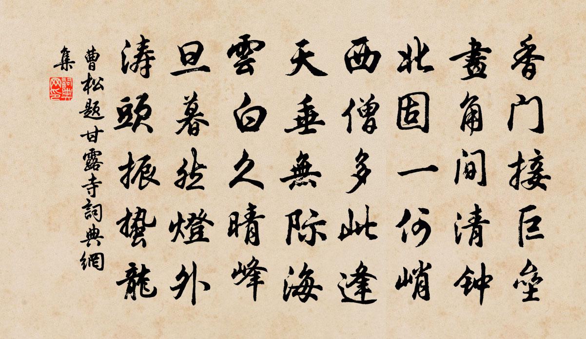詩詞名句歷史字典書法欣賞書法字典國語詞典說文解字康熙字典古漢語字典標 題 作 者 詩 句 題甘露寺作者:曹松 朝代:唐代題甘露寺原文香門接巨壘,畫角間清鍾。北固一何峭,西僧多此逢。天垂無際海,雲白久晴峰。旦暮然燈外,濤頭振蟄龍。詩詞問答問:題甘露寺的作者是誰?答:曹松問:題甘露寺寫於哪個朝代?答:唐代問:題甘露寺是什麼體裁?答:五律曹松題甘露寺書法欣賞題甘露寺書法作品注釋全唐詩:卷716-62詩詞推薦勸石集賢飲劉筠〔宋代〕豪家抱瓮擅風流,更燎薰爐白雪樓。魯筆休分科斗字,蜀都且換鷫鸘裘。仰天拊髀真為樂,倒載穿腸肯易愁。欲鱠寧江僑人劉生徽宗時以畫供奉翰林中近過元汝晁公溯〔宋代〕劉生待詔蓬萊宮,和鉛舐墨稱良工。自從八駿狩西極,萬里流落巴山中。老來摹寫益神妙,指麾草木回春風。時將頌古二十首釋了一〔宋代〕清源佛法意如何,米價酬來老太婆。眨上眉毛行大道,莫於平地起風波。吟贈夢英大師王著〔宋代〕到處聞人乞篆蹤,學來年久有深功。墨池闊類湘江水,筆塚高齊太華峰。金錫罷飛新解虎,鐵盂收掌舊降龍。知師雪竇顯禪師贊釋智遇〔宋代〕凝而不結,混而常清。挺然岳立,卒乎砥平。擬師這道兮虛空釘橛,美師之德兮色重里膠青。妙高萬疊兮春歸錦鏡經慈澗題鄭繇〔唐代〕岸與恩同廣,波將慈共深。涓涓勞日夜,長似下流心。第一百一十一卷偈釋法明〔宋代〕資福別無所補,五日一參擊鼓。何曾說妙談玄,只是粗言直語。甘草自來甜,黃連依舊苦。忽若鼻孔遼天,逢人世賦得浮雲起離色,送鄭述誠韋應物〔唐代〕遊子欲言去,浮雲那得知。偏能見行色,自是獨傷離。晚帶城遙暗,秋生峰尚奇。還因朔吹斷,匹馬與相隨。和留守令狐相公答白賓客劉禹錫〔唐代〕麥隴和風吹樹枝,商山逸客出關時。身無拘束起長晚,路 * 親行自遲。官拂象筵終日待,私將雞黍幾人期。君來五絕呈李惟學山長王奕〔宋代〕鑄金為蠡聲猶泯,磨石為碑字亦漫。雜雜萬形歸五化,燼餘方策更長存。韓玉汝遺油梅堯臣〔宋代〕朝讀百紙書,夜成幾篇書。明明白晝有陽烏,黕黕暗室無蟾蜍。目睛須藉外物光,日月不到卑蔀居。君能置以清油默坐鄧深〔宋代〕默坐形如槁,清閒智養恬。飛蟲黏密網,斗雀墮虛檐。卻暑寧須扇,留香略下簾。無人撓清思,至夜待明蟾。八月十四月食中秋遂無月方岳〔宋代〕妖蟆不為中秋地,老兔先奔昨夜寒。世事相違劇晴雨,人生何苦許悲歡。雲窗自照青藜杖,月戶重修白玉盤。坐想禪人並化主寫真求贊釋正覺〔宋代〕雲水老身,叢林陳人。發毛已雪,鼻氣猶春。平等應緣也心心佛佛,自然說法也剎剎塵塵。回途復妙,弄假像真。【雙調】新水令_楚台雲雨會關漢卿〔元代〕楚台雲雨會巫峽,赴昨宵約來的期話。樓頭棲燕子,庭院已聞鴉,料想他家,收針指晚妝罷。【喬牌兒】款將花徑老翁陸游〔宋代〕老翁睡少知遙夜,貧士衾單怯苦寒。悶里不嫌村酒薄,瘦來偏覺舊衣寬。籬門遇健時能出,書卷乘閒亦取看。深愧減字木蘭花 一道士出示杜甫遊春詩卷尹志平〔元代〕遊春暢飲。萬物熙熙花似錦。暢飲遊春。迷了從來多少人。儒流道士。幾個能通天外志。道士儒流。誰肯忘情言下次韻陳彥博梅飲之什李流謙〔宋代〕又向疎梅檢校春,乾坤浩蕩日趨新。一樽樹下喚深酌,數歲天涯思遠人。正倚交情論晚暮,直因臭味作疎親。淵明苕溪杜耒〔宋代〕風掠篷窗雨鬢秋,生涯無歲不扁舟。吟詩本欲相消遣,及到吟成字字愁。陳頵徐鈞〔宋代〕中華傾弊無他故,習尚淡談出望門。奏議救時翻見黜,搜揚隱逸更誰論。名句推薦志不可不高,志不高,則同流合污,無足有為矣王永彬《圍爐夜話·第三十則》 劍外忽傳收薊北,初聞涕淚滿衣裳。杜甫《聞官軍收河南河北》 不辭山路遠,踏雪也相過。張九齡《答陸澧》 北風夜卷赤亭口,一夜天山雪更厚。岑參《天山雪歌送蕭治歸京》 妾身悔作商人婦,妾命當逢薄倖夫。徐再思《陽春曲·閨怨》 快上西樓,怕天放、浮雲遮月。辛棄疾《滿江紅·中秋寄遠》 雨橫風狂三月暮,門掩黃昏,無計留春住。歐陽修《蝶戀花·庭院深深深幾許》 暮雨相呼失,寒塘欲下遲。崔塗《孤雁二首·其二》 暗昧處見光明世界,此心即白日青天。王永彬《圍爐夜話·第七八則》 懷舊空吟聞笛賦,到鄉翻似爛柯人。劉禹錫《酬樂天揚州初逢席上見贈》