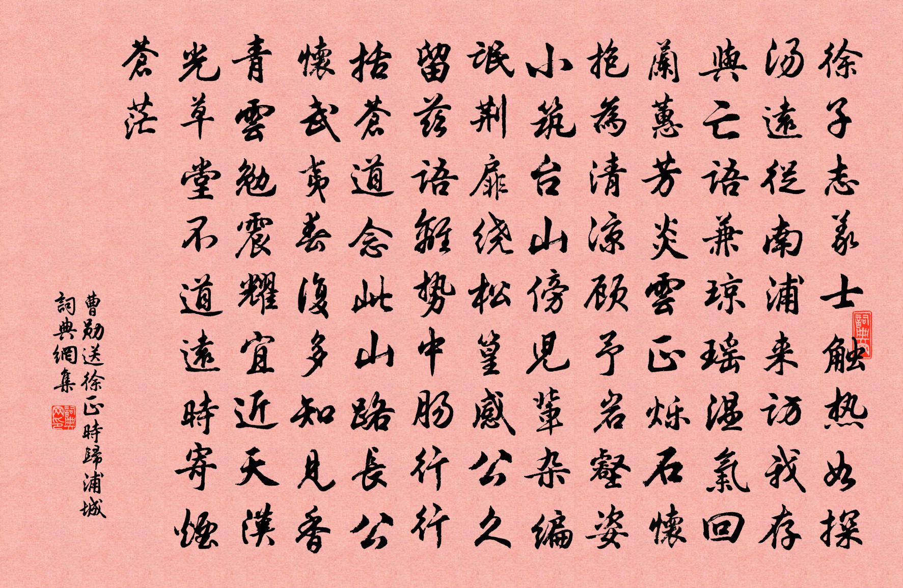 詩詞名句歷史字典書法欣賞書法字典國語詞典說文解字康熙字典古漢語字典標 題 作 者 詩 句 送徐正時歸浦城作者:曹勛 朝代:宋代送徐正時歸浦城原文徐子志義士,觸熱如探湯。遠從南浦來,訪我存與亡。語兼瓊瑤溫,氣回蘭蕙芳。炎雲正爍石,懷抱為清涼。顧予岩壑姿,小築台山傍。兒輩雜編氓,荊扉繞松篁。感公久留茲,語離勢中腸。行行括蒼道,念此山路長。公懷武夷春,復多知見香。青雲勉震耀,宜近天漢光。草堂不道遠,時寄煙蒼茫。詩詞問答問:送徐正時歸浦城的作者是誰?答:曹勛問:送徐正時歸浦城寫於哪個朝代?答:宋代曹勛送徐正時歸浦城書法欣賞送徐正時歸浦城書法作品詩詞推薦禪房十事蒲龕釋紹曇〔宋代〕百匝千重包裹,未免黑山里坐。古今多少生盲,引得全身入草。南嶽張舜民〔宋代〕它國西南隅,亘地{左山右勾}嶁外。奇峰七十二,主客雅相對。轍在想虔游,銘知知禹會。後天易吟三十首方回〔宋代〕彖辭六十四,三十四方貞。幹事匪正固,難求心外亨。秋晚雜書三十首方回〔宋代〕世稱陶謝詩,陶豈謝可比。池草固未雕,階藥已頗綺。如唐號元白,白豈元可擬。中有不同處,要與分朴詭。鄭圃七夕薛秉〔宋代〕紅蕖爛漫碧池香,羅綺三千侍漢皇。阿母暫來成底事,茂陵宮樹已蒼蒼。昭君怨(題春波獨載圖)高觀國〔宋代〕一棹莫愁煙艇。飛破玉壺清影。水濺粉綃寒。渺雲鬟。不肯凌波微步。卻載春愁歸去。風澹楚魂驚。隔瑤京。耒病臂比已平獨挽弓無力客言君為史官何事挽張耒〔宋代〕君不見吾鄉少年曹子桓,文章七步相後先。有時擲筆事弋獵,邀輕截駿馳平原。濊貊名弓燕代馬,射雉歸來燕清夜霍童山余復〔宋代〕霍童山峰凡六六,不知仙子在何山。秋風萬里一黃鶴,返照半林雙白鷳。長劍氣橫霄漢外,飛泉影落畫圖間。自憐訪隱者不遇宋祁〔宋代〕青蘿白石扉,霞薄動春暉。鶴去書空在,鳧閒舄自飛。驂鸞仙馭遠,出岫昔心違。拂衽雄風動,猶疑禦寇歸。賢者之孝二百四十首張歆林同〔宋代〕去官因脫囚,為感戴天讎。史氏乃失實,卻雲逃報仇。偈頌一百二十三首釋崇岳〔宋代〕達磨達磨,不識這個。直指單傳,胡揮亂做。郴江百詠並序山陰堂阮閱〔宋代〕修竹蒼蒼似剡川,浮觴可繼永和年。不知誰有羲之筆,欲寫蘭亭第二篇。分司洛中多暇數與諸客宴遊醉後狂吟偶成十韻…奇章公白居易〔唐代〕性與時相遠,身將世兩忘。寄名朝士籍,寓興少年場。老豈無談笑,貧猶有酒漿。隨時來伴侶,逐日用風光。數數偈頌十八首釋道璨〔宋代〕登芝山,望五老。雲靜日月正,眼高天地小。達磨大師脊骨等閒踏折,釋迦老子心肝五臟一時見了。因思擾擾塵寰題都城南莊崔護〔唐代〕去年今日此門中,人面桃花相映紅。人面不知何處去,桃花依舊笑春風。崇勝寺夏竦〔宋代〕山當廬阜五峰邊,地占侯谿好習禪。杳藹峰巒雲蔽日,參差樓殿瓦生煙。僧房宿鳥栖簾外,客館鳴泉過枕前。但可半雲庵林景熙〔宋代〕天地等蘧廬,結廬復何事。一間亦寄耳,況乃寄所寄,我身正似雲,於此適相值。買鄰不用錢,平分有餘地。豈不縣齋秋懷程公許〔宋代〕古人日以遠,古心誰與共。陳編如有覿,整袂神自竦。書短疲眾喧,夜永息群動。賴此一炷膏,假我數行誦。古今蔣觀文錢塘天府二帖贊岳珂〔宋代〕尺瑜瑕,工所不棄。如公平生,抑有清議。雖翰墨之僅存,亦世俗之共毖。予獨區區於別白,是亦或出於有意。昔奉和趙大本教授何處春深好二首喻良能〔宋代〕何處春深好,春深泮水家。不妨頻折角。寧復誤隨車。已見傾三峽,行看判五花。日邊催覲速,芝檢紫泥斜。名句推薦百畝庭中半是苔,桃花淨盡菜花開。劉禹錫《再游玄都觀》 歲暮遠為客,邊隅還用兵。杜甫《歲暮》 桃花仙人種桃樹,又摘桃花換酒錢。唐寅《桃花庵歌》 孤雁飛南遊,過庭長哀吟。曹植《雜詩六首·其一》 念月榭攜手,露橋聞笛。周邦彥《蘭陵王·柳》 欺君為大,加諸罪無可免;枉法不容,縱其為禍方懲。來俊臣《羅織經·謀劃卷第九》 愛故不二,威故不犯。 故善將者,愛與威而已。尉繚《尉繚子·攻權》 簾外雨潺潺,春意闌珊。李煜《浪淘沙令·簾外雨潺潺》 地白風色寒,雪花大如手。李白《嘲王歷陽不肯飲酒》 夢中未比丹青見,暗裡忽驚山鳥啼。姜夔《鷓鴣天·元夕有所夢》