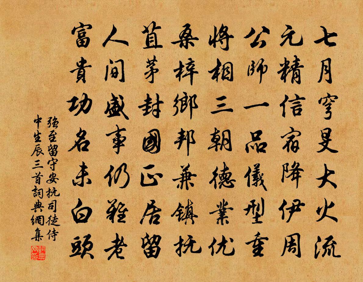 詩詞名句歷史字典書法欣賞書法字典國語詞典說文解字康熙字典古漢語字典標 題 作 者 詩 句 留守安撫司徒侍中生辰三首作者:強至 朝代:宋代留守安撫司徒侍中生辰三首原文七月穹旻大火流,元精信宿降伊周。公師一品儀型重,將相三朝德業優。桑梓鄉邦兼鎮撫,苴茅封國正居留。人間盛事仍難老,富貴功名未白頭。詩詞問答問:留守安撫司徒侍中生辰三首的作者是誰?答:強至問:留守安撫司徒侍中生辰三首寫於哪個朝代?答:宋代強至留守安撫司徒侍中生辰三首書法欣賞留守安撫司徒侍中生辰三首書法作品詩詞推薦送證侍者歸里釋可湘〔宋代〕臨老三回住雪山,無弦琴子逐時彈。夜來一曲最高韻,瀉作西江十八灘。隱者居王建〔唐代〕山人住處高,看日上蟠桃。雪縷青山脈,雲生白鶴毛。朱書護身咒,水噀斷邪刀。何物中長食,胡麻慢火熬。哭同年友馮校書周南〔宋代〕病父沈攣久,扶行未有孫。寡妻持酹酒,巴月旅歸魂。摧落收威暑,克危過峽門。銘旌今遠近,到日敗垣存。耕圖二十一首灌溉樓璹〔宋代〕揠苗鄙宋人,抱瓮慚蒙莊。何如銜尾鴉,倒流竭池塘。{左禾右罷}稏舞翠浪,籧篨生晝涼。斜陽耿衰柳,笑歌閒次韻謝程帥復游習池見寄二首陳造〔宋代〕名園壯觀還前日,禊事追游可後時。試問繡筵張綠野,何如詩客到昆池。綺羅香外鶯偷眼,花柳稀間鳥哢兒。定許壽鄉守張秘閣方大琮〔宋代〕家寧源流今吏師,寬嚴殊劑亦殊施。豪宗鹹服薤一本,野老齊歌麥兩岐。最課休聲無地看,芳名姱節有天知。請將讀漢書洪咨夔〔宋代〕漢衰元帝為優遊,成帝荒淫更可憂。論說金華風過耳,山河大柄醉中體。已亥雜詩 55龔自珍〔清代〕手校斜方百葉圖,官書似此古今無。只今絕學真成絕,冊府蒼涼六幕孤。崇禧給事同年馬兄輓辭二首王安石〔宋代〕慶曆公偕起,元豐我獨傷。兩楹終昔夢,五鼎繼前喪。薰歇曾攀桂,甘留所憩棠。素風知不墜,能世有諸郎。偶讀戲書方回〔宋代〕萬物乾坤判女男,始張玄理要精探。九還七返無成說,一守三存亦浪談。未必陽神正解出,可憐痴計謾多貪。誰能巴丘書事陳與義〔宋代〕三分書里識巴丘,臨老避胡初一游。晚木聲酣洞庭野,晴天影抱岳陽樓。四年風露侵遊子,十月江湖吐亂洲。未必九和劉克莊〔宋代〕群兒孰敢比肩隨,翻水成文出愈奇。人慾關弓戕后羿,天寧飛箭中王羆。愛材不忍淹叢棘,去惡真如斬亂絲。珍重東湖感事二首李石〔宋代〕桃李洲中別一春,雪山肯為障紅塵。鬼神半夜應憐我,魑魅今朝不喜人。煙雨晦明窗外眼,風霜來去樹邊身。細思次韻苗彥先題薛獻可新居四首林季仲〔宋代〕仙隱深深竹徑中,杖藜還許我相從。君能惜取清陰在,斤斧須令赦籜龍。讀陸放翁集梁啓超〔清代〕詩界千年靡靡風,兵魂銷盡國魂空。詩中什九從軍樂,亘古男兒一放翁。北窗偶成呈遺逸李新〔宋代〕北窗冰研碎魚鱗,未伏徐翁筆有神。止酒詩成三逕曉,買山錢就一家春。飢鼯如市莫欺客,窮鬼作朋終笑人。未敢詠孫常州飛蓬亭陳著〔宋代〕藕花池上竹梅陰,一艤中閒用意深。畫舫規模供燕適,虛舟世界看浮沉。快風未信千帆福,逆水難憑百丈心。惟有贈先輩令狐補闕羅隱〔唐代〕中間聲跡早薰然,阻避鈞衡過十年。碧海浪高終濟物,蒼梧雲好已歸天。花迎彩服離鶯谷,柳傍東風觸馬鞭。應念予未冠即交諸名勝今無復在者感嘆有作陸游〔宋代〕早歲鄉閭接勝流,老來零落嘆山丘。欲尋共語人難得,卻是封侯印易求。數酌不能成兀兀,一枰且復寄悠悠。世間長亭怨慢·雁朱彝尊〔清代〕結多少悲秋儔侶,特地年年,北風吹度。紫塞門孤,金河月冷,恨誰訴?回汀枉渚,也只戀江南住。隨意落平沙,名句推薦嘆寄與路遙,夜雪初積。姜夔《暗香疏影》 天子,兵強馬壯者當為之,寧有種耶!薛居正《舊五代史·後晉·列傳十三》 天憐客子鄉關遠。借與花消遣。蔣捷《虞美人·梳樓》 思爾為雛日,高飛背母時。白居易《燕詩示劉叟》 書無不可讀者!魏徵《隋書·列傳·卷四十一》 博學之,審問之,慎思之,明辨之,篤行之。子思《中庸·第二十章》 陰陰溪曲綠交加,小雨翻萍上淺沙。晁沖之《春日·陰陰溪曲綠交加》 論如析薪,貴能破理。劉勰《文心雕龍·論說》 落花水香茅舍晚,斷橋頭賣魚人散。馬致遠《壽陽曲·遠浦帆歸》 堪笑楚江空渺渺,不能洗得直臣冤。文秀《端午》