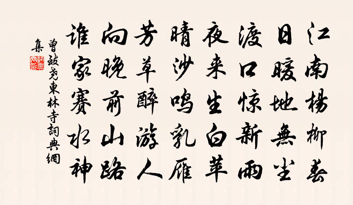 詩詞名句歷史字典書法欣賞書法字典國語詞典說文解字康熙字典古漢語字典標 題 作 者 詩 句 東林寺作者:曾致堯 朝代:宋代東林寺原文江南楊柳春,日暖地無塵。渡口驚新雨,夜來生白苹。晴沙鳴乳雁,芳草醉遊人。向晚前山路,誰家賽水神。詩詞問答問:東林寺的作者是誰?答:曾致堯問:東林寺寫於哪個朝代?答:宋代曾致堯東林寺書法欣賞東林寺書法作品詩詞推薦挽李秀岩二首劉克莊〔宋代〕耆舊凋零尚秀岩,可堪華表揭新銜。甘泉頌就拋荷橐,寶苑方收入枕函。宿昔山人來少室,暮年太史滯周南。嗟余次綱官王簿韻兼簡伯潛二首廖行之〔宋代〕柳岸流鶯兩兩黃,風光渾在一簾香。休辭老去追隨懶,莫遣春歸倥傯忙。滿地芳茵猶勝踐,漫天飛絮漫輕狂。溪園連日有雪意戲書陸游〔宋代〕壯歲羈游半九州,即今憔悴老菟裘。狂心那復繳鴻鵠,世事已如風馬牛。雪作未成增慘澹,葉飛欲盡更颼飀。聊將毛希元隱居廬山臥龍瀑葉適〔宋代〕毛子罵吳曦,蜀山眇孤墳。五老急招聘,延留如大賓。龍分自眠地,蕙帳饒珠蠙。岩花開恨晚,谷鳥鳴行詹。弔古寄泰山孫復祖無擇〔宋代〕先生心與白雲閒,五十秋風髩不斑。自有清名滿天下,更無塵跡到人間。朱鉛樂外非攸好,貪懦聞風合厚顏。不待寒澗劉子翬〔宋代〕林間幽鳥吸枯槎,落盡寒潮一澗沙。獨林橋西遊子宿,酒旗斜日兩三家。遺安堂任希夷〔宋代〕苴茅動龔勝,屠書恐王蠋。二君夭天年,千載歡莫贖。今代史伯存,危行光往躅。繄昔開禧年,狂童叛吾蜀。非招又五言徐鉉〔唐代〕彩仗映花韉,春庭散曙煙。毬飛皆應手,馬駿不須鞭。仙樂飄雲外,祥風近日邊。籌多不虛發,制生在機先。洛州語佚名〔唐代〕洛州有前賈后張,可敵京兆三王。減字木蘭花元好問〔金代〕瑞雲仙霧。指曉重重遮繡戶。一炷清香。千尺流霞入壽觴。家門轉好。從此自應長不老。來歲春風。看□西□小令明日復賦蘇轍〔宋代〕放舟城西南,卻向東南泊。朝來雨新霽,白水浸城腳。古汴多流苴,清泗亦浮沫。平吞百澗暴,滅盡三洪惡。遊人朝謁太清宮九首真宗〔宋代〕上旻降監,介祉實繁。邦家修報,妙道歸尊。增名霄極,奉冊靈軒。茂宣聖典,永祐黎元。贈劉靜翁頌四首黃庭堅〔宋代〕念念皆空更莫疑,心王本自絕多知。艱勤長向途中覓,掉卻甜桃摘醋梨。石灶孫應時〔宋代〕石灶滄潭上,烹茶定幾回。舟人因記得,俗客未經來。滿庭芳(伯父仲球生日)王之道〔宋代〕紫角初繁,青裳正好,充閭清露飄香。懸弧何早,烏轡上扶桑。試問椿齡幾許,逾萬計、才滿三章。佳辰樂,林塘寄神光末宗和尚釋可湘〔宋代〕萬太神光滌世昏,莫知誰信有乾坤。三山眼底多尊宿,那個來敲老觀門。招湖上兄弟齊己〔唐代〕去歲得君訊息在,兩憑人信過重湖。忍貪風月當年少,不寄音書慰老夫。藥鼎近聞傳秘訣,詩門曾說擁寒爐。漢江盆池杜牧〔唐代〕鑿破蒼苔地,偷他一片天。白雲生鏡里,明月落階前。寄梁佾兄弟趙嘏〔唐代〕桃李春多翠影重,竹樓當月夜無風。荀家兄弟來還去,獨倚欄乾花露中。句元絳〔宋代〕何人更得通天帶,謀合君心只晉公。名句推薦我家洗硯池邊樹,朵朵花開淡墨痕。王冕《墨梅》 有花堪折直須折,莫待無花空折枝。無名氏《雜詩》 孤村落日殘霞,輕煙老樹寒鴉,一點飛鴻影下。白樸《天淨沙·秋》 一月可曾閒幾日,百年難得閏中秋。慧霖《閏中秋玩月》 當時輕別意中人,山長水遠知何處。晏殊《踏莎行·碧海無波》 聽君一席話,勝讀十年書。佚名《增廣賢文·上集》 夫大寒至,霜雪降,然後知松柏之茂也。劉安及其門客《淮南子·俶真訓》 銅華滄海,愁霾重嶂,燕北雁南天外。吳文英《永遇樂·乙巳中秋風雨》 誰向若耶溪上,倩美人西去,麋鹿姑蘇。辛棄疾《漢宮春·會稽蓬萊閣懷古》 尋常百種花齊發,偏摘梨花與白人。元稹《離思五首》