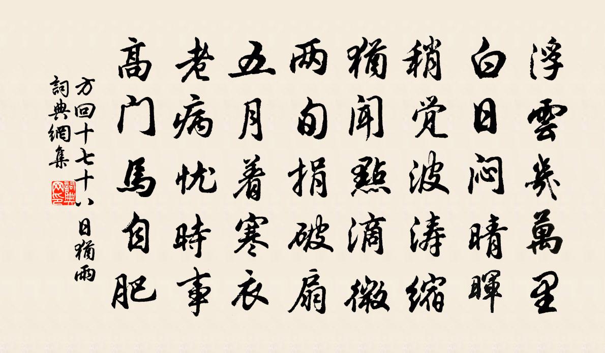 詩詞名句歷史字典書法欣賞書法字典國語詞典說文解字康熙字典古漢語字典標 題 作 者 詩 句 十七十八日猶雨作者:方回 朝代:宋代十七十八日猶雨原文浮雲幾萬里,白日悶晴暉。稍覺波濤縮,猶聞點滴微。兩旬捐破扇,五月著寒衣。老病憂時事,高門馬自肥。詩詞問答問:十七十八日猶雨的作者是誰?答:方回問:十七十八日猶雨寫於哪個朝代?答:宋代方回十七十八日猶雨書法欣賞十七十八日猶雨書法作品詩詞推薦陳和叔內翰得莊生觀魚圖於濠梁出以相示且邀蘇頌〔宋代〕公堂四合臨中衢,翰林壁掛觀魚圖。傳之近自濠梁客,雲是蒙邑先生居。先生昔仕楚園吏,傲世不蘄卿大夫。逍遙輓歌詞范祖禹〔宋代〕彩旆籃輿訪隱扃,雲松雪竹想儀形。函關應望真人氣,傅野今無處士星。猶憶九皋聞鶴唳,徒勞雙目送鴻冥。將回紹興祀高禖十首佚名〔宋代〕[太簇為徽]猗歟禖宮,祀典所貴。備自艱難,禮工弗備。以迄於今,始建壇壝。顧武雲車,歆此誠意。鷙鵲詩陳師道〔宋代〕若奚不鸇,吾知避而遷。汝胡不狸,吾知遠而馳。宵邇吾巢,晨並吾枝。懷毒妊凶,初不汝期。莽莽拳拳,甫笑嬉和段成式周繇〔唐代〕回簪轉黛喜猜防,粉署裁詩助酒狂。若遇仙丹偕羽化,但隨蕭史亦何傷。玉樹瓊筵映彩霞,澄虛樓閣似仙家。只緣雜詠一百首史蘇劉克莊〔宋代〕繇語幾於讖,流傳信有諸。王何謾辛苦,易自是占書。葛仙山熊克〔宋代〕秋風吹我衣,秋水洗我心。乘風直上葛仙頂,仙家樓閣煙霞深。蓬萊何曾弱水隔,兜率有天才咫尺。等閒拍手倚闌賜賦元亨宋仁宗〔宋代〕只向身邊有大還,胎神月殿在秋天。三靈密像誰分別,尺質清虛本自然。綠水王冕〔元代〕綠水流洙泗,青山出魯鄒。憑高殊有興,弔古不勝愁。日落江花重,風生野樹秋。掀髯一長笑,不負壯年游。題闖山亭毛幵〔宋代〕捲簾新雨霽,伏檻孤雲沒。心賞信無同,佳人眇天末。題少陵畫像陸游〔宋代〕長安落葉紛可掃,九陌北風吹馬倒。杜公四十不成名,袖裡空餘三賦草。車聲馬聲喧客枕,三百青銅市樓飲。杯殘新秋以窗里人將老門前樹欲秋為韻作小詩陸游〔宋代〕少年雖婚宦,淡然本無欲。婆娑三畝園,自嘆不啻足。送元晦劉珙〔宋代〕翩翩雙黃鶴,結巢相因依。一為天風便,矯翮西北飛。歲華及晼晚,霜露侵征衣。此行亦良苦,千里以為期。堂上湖頭別墅三首貫休〔唐代〕梨栗鳥啾啾,高歌若自由。人誰知此意,舊業在湖頭。飢鼠掀菱殼,新蟬避栗皺。不知江海上,戈甲幾時休。桑柘紹興親享明堂二十六首佚名〔宋代〕誠一為專,禮三而稱。孰陪邦祠,惟我同姓。金絲屢調,圭玉交映。是謂熙成,福來神聽。效進士作觀成都石經黃庭堅〔宋代〕成都九經石,歲久麝煤寒。字畫參工拙,文章可鑑觀。危邦猶勸講,相國校雕刊。群盜煙塵後,諸生竹帛殘。王春頌古一百首釋智愚〔宋代〕始見春花歸閬苑,又逢秋葉墮宮牆。思量世事如翻掌,誰得長生不死方。芙蕖李漁〔清代〕 芙蕖與草本諸花似覺稍異,然有根無花,一歲一生,其性同也。譜云:“產於水者曰草芙蓉,產於陸者曰旱蓮到郡一年曾鞏〔宋代〕薄材何幸擁朱軒,空食東州已一年。隴上雨余看麥秀,桑間日永問蠶眠。官名雖冗身無累,心事長閒地自偏。只恐水調歌頭(嚴子文同傳安道和盟鷗韻,和以謝之辛棄疾)辛棄疾〔宋代〕寄我五雲字,恰向酒邊來。東風過盡歸雁,不見客星回。聞道瑣窗風月,更著詩翁杖屨,合作雪堂猜。歲旱莫留客名句推薦忠告而善道之,不可則止,毋自辱焉。孔子弟子《論語·顏淵篇》 言不過行,行不過道戴聖《大戴禮記·文王官人第七十二》 聲無小而不聞,行無隱而不形。荀子《荀子·勸學》 重五山村好,榴花忽已繁。陸游《乙卯重五詩》 秋陰不散霜飛晚,留得枯荷聽雨聲。李商隱《宿駱氏亭寄懷崔雍崔袞》 時人不識農家苦,將謂田中谷自生。顏仁郁《農家》 草色青青柳色黃,桃花歷亂李花香。賈至《春思二首·其一》 佇久河橋欲去,斜陽淚滿。吳文英《三姝媚·過都城舊居有感》 生年不滿百,常懷千歲憂。佚名《生年不滿百》 悵然孤嘯,青山故國,喬木蒼苔。倪瓚《人月圓·傷心莫問前朝事》