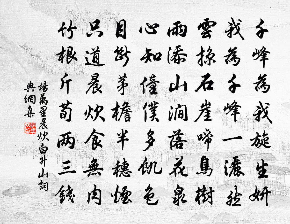 詩詞名句歷史字典書法欣賞書法字典國語詞典說文解字康熙字典古漢語字典標 題 作 者 詩 句 晨炊白升山作者:楊萬里 朝代:宋代晨炊白升山原文千峰為我旋生妍,我為千峰一洒然。雲掠石崖啼鳥樹,雨添山澗落花泉。心知僮僕多飢色,目斷茅檐半穗煙。只道晨炊食無肉,竹根斤荀兩三錢。詩詞問答問:晨炊白升山的作者是誰?答:楊萬里問:晨炊白升山寫於哪個朝代?答:宋代問:楊萬里的名句有哪些?答:楊萬里名句大全楊萬里晨炊白升山書法欣賞晨炊白升山書法作品詩詞推薦存沒口號蘇泂〔宋代〕陶山松柏日夜長,屋下兒孫漸滿堂。當時侍傍五男子,考叔之羹曾未嘗。下章安杜瀆七首姚寬〔宋代〕京洛風塵久不開,晚尋雲水到天台。如何更下章安浦,縹緲山城首重回。頌古四首釋梵琮〔宋代〕東山水上行,乾元利貞亨。譊訛一個字,才子競頭爭。茱萸菊史鑄〔宋代〕品出陶家花品外,名存吳地藥名中。若將泛人重陽酒,不用分香摘兩叢。又次蔣甥仲愚韻樓鑰〔宋代〕山色空濛雪更奇,滿空擊碎吠琉璃。寒侵茅屋春無寐,凍合梅花夜不知。泛泛輕舟勝路滑,洋洋流水樂人飢。興來用仙宮鋪壁上諸人韻作晁說之〔宋代〕香霧漫空玉作塵,五龍雙鳳細扶輪。君王不得須臾語,只有輪台哀痛身。題畫蘭鄭起〔宋代〕向來俯首問羲皇,汝是何人到此鄉。未有畫前開鼻孔,滿天浮動古馨香。與故人夜坐道舊權德輿〔唐代〕笑語歡今夕,煙霞愴昔游。清羸還對月,遲暮更逢秋。勝理方自得,浮名不在求。終當制初服,相與臥林丘。蘇幕遮 到萊州,復歸寧海辭墳馬鈺〔元代〕此回來,緣甚故。不謂營生,不為兒和女。不謂榮華夸五褲。思憶劬勞,特地辭墳墓。奠酒時,開地府。九祖生天偈頌二十二首釋道生〔宋代〕兩曜劈箭急,一年彈指間。始見大暑小暑,又是小寒大寒。通身寒暑無回互,笑倒當年老洞山。同李漢老登高齋劉子翬〔宋代〕飛梯百級轉層巒,政喜登臨著眼寬。海上波濤連閬苑,日邊塵土暗長安。亂來世事終無定,春盡羈愁豈一端。賴有雄楚亭袁說友〔宋代〕江山萬里接西東,吳蜀咽喉此地中。奄宅荊州夸楚勢,此亭所以得稱雄。鷓鴣天郭應祥〔宋代〕前數重陽後小春。中間十日是生辰。二年穩作棲鸞客,百里誰非賀燕人。無一事,擾天真。年登八八愈精神。句稽贈僧賈島〔唐代〕從來多是游山水,省泊禪舟月下濤。初過石橋年尚少,久辭天柱臘應高。青松帶雪懸銅錫,白髮如霜落鐵刀。常恐閏月晦日宋祁〔宋代〕春物都城晚,歡游一倍慵。輕風生樹態,暖日淡雲容。小閣時翻燕,閒花更少蜂。幽襟真滬落,所得是無悰。又次韻馮文度春晚二首陳棣〔宋代〕春到窮檐分外和,典衣日日飲無何。未陪蠟屐尋幽欒,已覺詩囊得句多。頗喜醉鄉無畔岸,從教平地有風波。脫巾赤石庵錢時〔宋代〕野花啼鳥日初遲,指面和風一卮。草草山房終勝俗,堂堂春色易成詩。偶至東堂范成大〔宋代〕岸幘蕭騷雪滿簪,一閒真是直千金。歸來栗里多情話,病後香山少醉吟。久坐 * 焦葉放,閒拖藜杖蘚花深。飢時綠陰亭自唐時有之到今五百年盧肇二三公題詩戴復古〔宋代〕遠山橫碧一溪清,白鳥飛邊落照明。吏散庭階一無事,綠陰亭上又詩成。奉使契丹二十八首其二十二學士院端午帖子二蘇轍〔宋代〕御溝繞殿細無聲,飛灑彤墀曉氣清。開到石榴花欲盡,陰陰高柳一蟬鳴。名句推薦拋家傍路,思量卻是,無情有思。蘇軾《水龍吟·次韻章質夫楊花詞》 念天地之悠悠,獨愴然而涕下。陳子昂《登幽州台歌》 更無柳絮因風起,惟有葵花向日傾。司馬光《客中初夏》 欸乃一聲山水綠。回看天際下中流,岩上無心雲相逐柳宗元《漁翁》 青山一道同雲雨,明月何曾是兩鄉。王昌齡《送柴侍御》 失意還獨語,多愁只自知。張籍《薊北旅思 / 送遠人》 君子有三惜:此生不學,一可惜。此日閒過,二可惜。此身一敗,三可惜。張廷玉《明史·列傳·卷四十九》 人異而心異,擇其弱者以攻之,其神必潰。來俊臣《羅織經·問罪卷第十》 鴻雁不堪愁里聽,雲山況是客中過。李頎《送魏萬之京》 婦姑相喚浴蠶去,閒看中庭梔子花。王建《雨過山村》