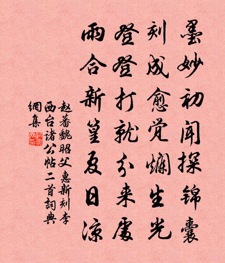 詩詞名句歷史字典書法欣賞書法字典國語詞典說文解字康熙字典古漢語字典標 題 作 者 詩 句 魏昭父惠新刻李西台諸公帖二首作者:趙蕃 朝代:宋代原文墨妙初聞探錦囊,刻成愈覺爛生光。登登打就分來處,雨合新篁夏日涼。詩詞問答問:《魏昭父惠新刻李西台諸公帖二首》的作者是誰?答:趙蕃問:該詩寫於哪個朝代?答:宋代書法欣賞魏昭父惠新刻李西台諸公帖二首書法作品詩詞推薦錦堂春/錦堂春慢王沂孫〔宋代〕桂嫩傳香,榆高送影,輕羅小扇涼生。正鴛機梭靜,鳳渚橋成。穿線人來月底,曝衣花入風庭。看星殘靨碎,露滴一翦梅 壽安玄卿謝應芳〔元代〕一色蒼然兩河翁。年也相同。月也相同。六年湖海共飄蓬。煙也溟濛。雨也溟濛。移家今住葑門東。朝也相從。暮將離澧浦置酒野嶼奉懷沈正字昆弟三人聯登高第李群玉〔唐代〕春月三改兔,花枝成綠陰。年光東流水,浩嘆傷羈心。酌桂煙嶼晚,鴂鳴江草深。良圖一超忽,萬恨空相尋。上國訪謂陽許月卿六〔宋代〕舅待甥如待大賓,玳筵致語厚詞人。玉堂金馬和風月,應有佳篇繼後塵。送雲岩老住天寧寺陳造〔宋代〕道人兀坐雲岩山,雲岩之雲是知己。風噓岫吸漫不知,道人之心亦如此。從地湧出煥金碧,信手拈來自奇偉。門施雪中梅鄭獬〔宋代〕臘雪欺梅飄玉塵,早梅鬧巧雪中春。更無俗艷能相雜,惟有清香可辨真。姑射仙人冰作體,秦家公主粉為身。素娥雨後孫介〔宋代〕落日矯烏雲,疾風豗白浪。雨聲西南來,勢劇萬馬壯。題舒氏難老亭二首白玉蟾〔宋代〕三十三天第一天,玉皇殿下裊輕煙。不知劫數今何代,方是延康第二年。弱水無船歸似箭,華胥有夢且遊仙。攜筇古漁父詞十二首王銍〔宋代〕漁父家風我所知,家風要與道相宜。不懷貪餌知鉤意,常似絲綸未下時。嫦娥李商隱〔唐代〕雲母屏風燭影深,長河漸落曉星沉。嫦娥應悔偷靈藥,碧海青天夜夜心。寄張達道曹勛〔宋代〕茅峰何山亦何好,瑤木琪華並三島。其間岩洞邃且深,隱居仙人得窮討。遠業已跨雪色驢,諸孫何能玉顏老。黑虎次韻元發弟秋日德余庵書事二首王之道〔宋代〕飽諳世事轉疏慵,投老猶能向佛宮。危坐遂移桑蔭日,清談仍對菊花風。憑君為我追歡伯,自此游山作醉翁。聞說啄木兒王哲〔元代〕觀浮世。為人貴。舍榮華、全神氣。保養丹田絕滋味。便將來、免不諱。自諳自諱。修取長生計。自誓自誓。今朝偈頌一百一十七首釋紹曇〔宋代〕沒弦琴,有遺音。調高流水,聲振緇林。碧眼黃頭爭品弄,無端花擘祖師心。瑞岩素非妙手,效顰彈一曲看。叮噹戲贈姬人(一作張祜與杜牧聯句詩)李群玉〔唐代〕骰子巡拋裹手拈,無因得見玉纖纖。但知謔道金釵落,圖向人前露指尖。別李季友王季友〔唐代〕棲鳥不戀枝,喈喈在同聲。行子馳出戶,依依主人情。昔時霜台鏡,醜婦羞爾形。閉匣二十年,皎潔常獨明。今日次韻王將仕二首白玉蟾〔宋代〕白霧重重山復山,山光樹色有無間。是中紫翠皆詩料,病起無聊著句難。再和楊萬里〔宋代〕太空無壁不可幄,顛風莫動花肌薄。一春才有一日晴,帝里遊人爭出城。青天如水綠煙滅,晴與海棠成兩絕。坐中滿江紅(壽韓尚書)佚名〔宋代〕五嶽三光,鍾秀氣、篤生人傑。天付與、心腸錦繡,精神冰雪。姓字早登龍虎榜,文書夜直絲綸閣。謝君王、特地浣溪沙(寓意)蘇軾〔宋代〕炙手無人傍屋頭。蕭蕭晚雨脫梧楸。誰憐季子敞貂裘。顧我已無當世望,似君須向古人求。歲寒松柏肯驚秋。名句推薦五更櫪馬靜無聲。鄰雞猶怕驚。吳文英《醉桃源·元日》 今夜鄜州月,閨中只獨看。杜甫《月夜》 清濁,小大,短長,疾徐,哀樂,剛柔,遲速,高下,出入,周疏,以相濟也。左丘明《左傳·昭公·昭公二十年》 知者不言,言者不知。老子《老子·德經·第五十六章》 心既托聲於言,言亦寄形於字劉勰《文心雕龍·練字》 春愁凝思結眉心,綠綺懶調紅錦薦。顧敻《玉樓春·拂水雙飛來去燕》 淮南秋雨夜,高齋聞雁來。韋應物《聞雁》 巧偽不如拙誠顏之推《顏氏家訓·名實篇》 奇外無奇更出奇,一波才動萬波隨。元好問《論詩三十首·二十二》 東船西舫悄無言,唯見江心秋月白。白居易《琵琶行 / 琵琶引》