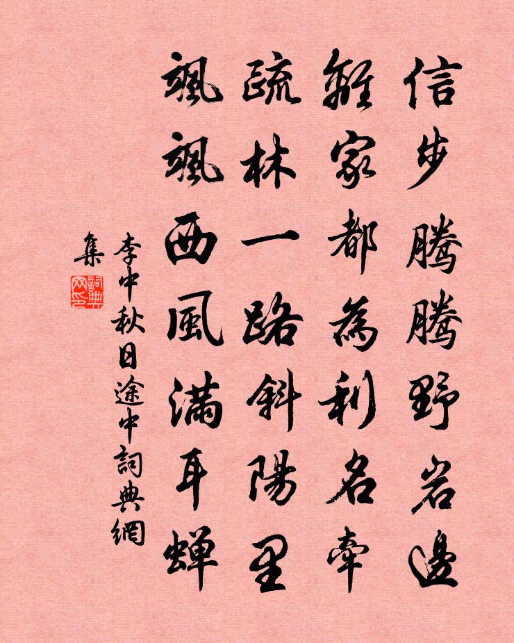 詩詞名句歷史字典書法欣賞書法字典國語詞典說文解字康熙字典古漢語字典標 題 作 者 詩 句 秋日途中作者:李中 朝代:唐代秋日途中原文信步騰騰野岩邊,離家都為利名牽。疏林一路斜陽里,颯颯西風滿耳蟬。詩詞問答問:秋日途中的作者是誰?答:李中問:秋日途中寫於哪個朝代?答:唐代李中秋日途中書法欣賞秋日途中書法作品注釋全唐詩:卷749-12詩詞推薦五貺詩華頂杖皮日休〔唐代〕金庭仙樹枝,道客自攜持。探洞求丹粟,挑雲覓白芝。量泉將濯足,闌鶴把支頤。以此將為贈,惟君盡得知。和永叔六篇其四禁中鞓紅牡丹梅堯臣〔宋代〕與公同是洛陽客,今日論年皆作翁。一見此花知有感,衰顏不似舊時紅。減字木蘭花(二勸)沈瀛〔宋代〕酒巡未止。聽說二疏歸可喜。隨意乘風。拄杖深村狹巷通。淵明漉酒。更與龐公龐媼壽。切莫譏何||。喚取同來朝中措張掄〔宋代〕慕名人似蟻貪膻。擾擾幾時閒。輸我吳松江上,一帆點破晴煙。青莎臥月,紅鱗薦酒,一醉陶然。此是人間蓬島,送李季允侍郎歸蜀五絕用禪房花竹幽為韻劉宰〔宋代〕密葉秋逾潤,幽花晚更妍。去來誰是主,試問白頭禪。減蘭十梅(月)李子正〔宋代〕寒蟾初滿。正是枝頭開爛熳。素質籠明。多少風姿無限情。暗香疏影。冰麝蕭蕭山驛靜。淺蕊輕枝。酒醒更闌夢斷夜讀馬援感測少游語黎廷瑞〔宋代〕生人有恆道,衣食固其須。裁足諒已難,況復求贏餘。所以古怪賢,守道甘窮居。緼袍敝弗厭,簞瓢飢自娛。徐行虞美人(城山堂試燈)劉辰翁〔宋代〕黃柑擘破傳春霧。新酒如清露。城中也是幾分燈。自愛城山堂上、兩三星。枝頭未便風和雨。寂寞無歌舞。天公肯學古詩鮑照〔南北朝〕北風十二月。雪下如亂巾。實是愁苦節。惆悵憶情親。會得兩少妾。同是洛陽人。嬛綿好眉目。閒麗美腰身。凝膚荊南席上詠胡琴妓二首王仁裕〔唐代〕紅妝齊抱紫檀槽,一抹朱弦四十條。湘水凌波慚鼓瑟,秦樓明月罷 * 。寒敲白玉聲偏婉,暖逼黃鶯語自嬌。丹禁上巳日祓禊渭濱應制韋嗣立〔唐代〕乘春祓禊逐風光,扈蹕陪鑾渭渚傍。還笑當時水濱老,衰年八十待文王。落花圖詠唐寅〔明代〕春盡愁中與病中,花枝遭雨又遭風。鬢邊舊白增新白,樹底深紅換淺紅。漏刻已隨香篆了,錢囊甘為酒杯空。向來眉州郡燕大醉中間道馳出城宿石佛院陸游〔宋代〕玻璃春作江水清,紫玉簫如雛鳳鳴。漏聲不聞看灺燭,俠氣未減欺飛觥。腳踏車萬里信有數,二年三過寧忘情。釵頭滿庭芳陳瓘〔宋代〕槁木形骸,浮雲身世,一年兩到京華。又還乘興,閒看洛陽花。聞道鞓紅最好,春歸後、終委泥沙。忘言處,花開古意六首艾性夫〔宋代〕匆匆採桑女,花雨濕襜袖。春風十二弦,生世未觸手。玉洞齊唐〔宋代〕白石洞間路,吾家在其中。琴窗與書閣,一半是雲封。晏坐岩陳岩〔宋代〕掠地霜風黃葉飛,山人晏坐已多時。但知六鑿俱通透,不省支床舊有龜。賤生之日邀正仲子堂小酌舒岳祥〔宋代〕開歲恰七十,吾衰病已頻。從今數正旦,一月有三晨。甲子添新志,乾坤寄老身。晚年方學易,此意為誰陳。相送行效張籍王安石〔宋代〕一車南,一車北,身世匆匆俱有役。憶昔論心兩綢繆,那知相送不得留。但聞馬嘶覺已遠,欲望應須上前坂。秋風癖武衍〔宋代〕剩欲收神省費心,三生痴癖本來深。典衣尋訪晉朝畫,折簡借觀雷氏琴。帖字逼真嘗細搨,詩聯敲穩每長吟。鏡中名句推薦大器晚成;大音希聲老子《老子·德經·第四十一章》 止戈為武。左丘明《左傳·宣公·宣公十二年》 朔方正月雪澌澌,單于策馬至京西沈約《昭君辭》 天地無全功,聖人無全能,萬物無全用。列子及其弟子《列子·天瑞》 人皆欲多積財,石崇乃因多積財而喪命。王永彬《圍爐夜話·第七則》 夭紅過眼隨榮謝,菊秀蘭香自占春。王汝舟《詠歸堂隱鱗洞》 最傷情、送客鹹陽,佩結西風怨。吳文英《瑣窗寒·玉蘭》 不見去年人,淚濕春衫袖。歐陽修《生查子·元夕》 一蓑煙雨任平生。蘇軾《定風波·莫聽穿林打葉聲》 望君煙水闊,揮手淚沾巾。劉長卿《餞別王十一南遊》