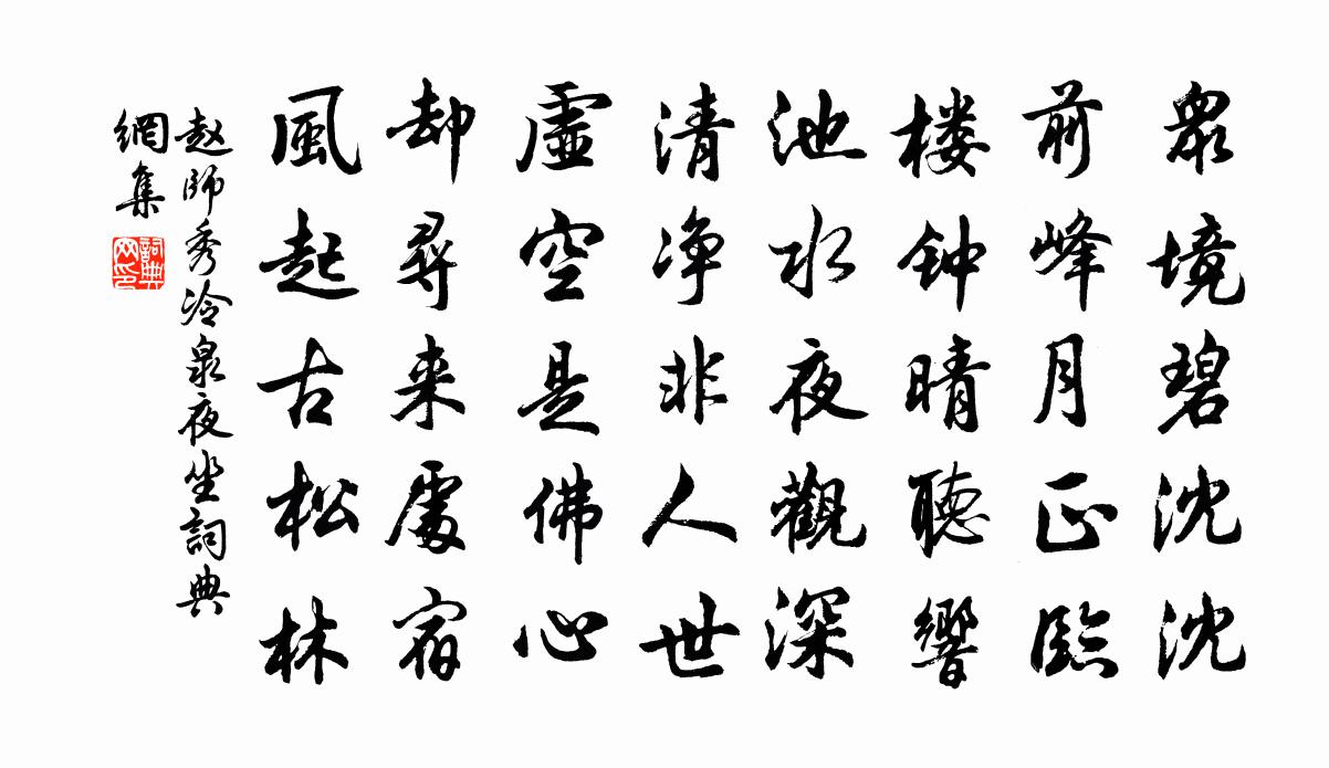 詩詞名句歷史字典書法欣賞書法字典國語詞典說文解字康熙字典古漢語字典標 題 作 者 詩 句 冷泉夜坐作者:趙師秀 朝代:宋代冷泉夜坐原文眾境碧沈沈,前峰月正臨。樓鍾晴聽響,池水夜觀深。清淨非人世,虛空是佛心。卻尋來處宿,風起古松林。詩詞問答問:冷泉夜坐的作者是誰?答:趙師秀問:冷泉夜坐寫於哪個朝代?答:宋代趙師秀冷泉夜坐書法欣賞冷泉夜坐書法作品詩詞推薦游華岳歸道中望仙掌晁補之〔宋代〕深岩踏遍尋歸路,仙掌依然在碧虛。無限遊人重駐馬,豈惟狂客倒騎驢。掛圖天漢朝霞上,落影秦關夕照余。千古中秋十五夜月貫休〔唐代〕噀雪噴霜滿碧虛,王孫公子玩相呼。從來天匠為輪足,自是人心此夜余。靜入萬家危露滴,清埋眾象叫鴻孤。坐來姑蘇台張蘊〔宋代〕故址耕殘草樹秋,無人曾見鹿來游。甬東亦是當時月,不照笙歌只照愁。偈頌二十四首釋智遇〔宋代〕出山而見,入戶而知。雞棲鳳巢,鄰壁之輝,何必區區點綴伊。夷門歌王維〔唐代〕七雄雄雌猶未分,攻城殺將何紛紛。秦兵益圍邯鄲急,魏王不救平原君。公子為嬴停駟馬,執轡愈恭意愈下。亥為呈亦韓趙蕃〔宋代〕寒食寒未歸,清明清曉時。花殘渺無跡,柳細不勝垂。即事須詩寫,多憂賴酒支。雖親友朋益,更苦弟兄思。知盧可庵教諭鼓歌何夢桂〔宋代〕崇牙樅樅,賁鼓逢逢。始作這以荊衡底貢之新革,試叩之以巴蜀故產之孤桐。雷震一聲草木拆,蠖信其屈龍起蟄。柳韓溉〔唐代〕雪盡青門弄影微,暖風遲日早鶯歸。如憑細葉留春色,須把長條系落暉。彭澤有情還鬱郁,隋堤無主自依依。世間寄范正甫楊時〔宋代〕羈窮莫厭如牢圈,從古功名出屠販。男兒不負懸弧心,馬革裹屍猶足願。君不見淮陰寄食飢貧叟,胯下英風亦何有聽唱鷓鴣佚名〔唐代〕金谷歌傳第一流,鷓鴣清怨碧雲愁。夜來省得曾聞處,萬里月明湘水流。三日詩鮑照〔南北朝〕氣暄動思心。柳青起春懷。時艷憐花葯。服淨悅登台。提觴野中飲。愛心煙未開。露色染春草。泉源潔冰苔。泥泥東陽溪中贈答二首·其一謝靈運〔南北朝〕可憐誰家婦?緣流灑素足。明月在雲間,迢迢不可得。挽聶孺人劉克莊〔宋代〕已病猶蔬素,西歸不復疑。飛鳧逾嶺遠,別鶴返鄉遲。箴史傳賢女,巾褠付侍姬。白頭潘令在,應有悼亡詩。蒙恩轉儀曹郎依前充集賢學士舉韓潮州自代因寄七言劉禹錫〔唐代〕翔鸞闕下謝恩初,通籍由來在石渠。暫入南宮判祥瑞,還歸內殿閱圖書。故人猶在三江外,同病凡經二紀餘。今日題劉知宮愚圃三首王炎〔宋代〕養 * 虛而一,攝生欲靜而閒。須這道如牆壁,絕嫌心有機關。答端明王尚書見寄兼簡景仁文裕二侍郎二首歐陽修〔宋代〕日久都城車馬喧,豈知風月屬三賢。唱高誰敢投詩社,行處人爭看地仙。酒面撥醅浮大白,舞腰催拍趁繁弦。與公奉和太府韋卿閣老左藏庫中假山之作權德輿〔唐代〕春山仙掌百花開,九棘腰金有上才。忽向庭中摹峻極,如從洞裡見昭回。小松已負乾霄狀,片石皆疑縮地來。都內謹和老人賦牛尾貍二首洪咨夔〔宋代〕北雪佛貍種,西風金狗秋。謀生貪過鼠,逃列喘如牛。糟熟涎奴舌,虀芳點客頭。何時明獵火,吞盡楚青丘。送呂子陽自永康攜所解老子訪餘留未久其家報葉適〔宋代〕收纓古蜜浦,抱袂生薑門。九九書自註,邀余綴篇端。久衰余學廢,彌隱子道尊。時維冬雷數,雲雪常晝昏。火把天童山溪上王安石〔宋代〕溪水清漣樹老蒼,行穿溪樹踏春陽。溪深樹密無人處,唯有幽花渡水香。名句推薦暝色入高樓,有人樓上愁。李白《菩薩蠻·平林漠漠煙如織》 敗垣芳草,空廊落葉,深砌蒼苔。徐再思《人月圓·甘露懷古》 入苑白泱泱,宮人正靨黃。李賀《同沈駙馬賦得御溝水》 還與去年人,共藉西湖草。蘇軾《卜運算元·感舊》 老吾老,以及人之老;幼吾幼,以及人之幼。孟子《孟子·梁惠王章句上·第八節》 畫船撐入花深處,香泛金卮。歐陽修《採桑子·荷花開後西湖好》 歷冰霜、不變好風姿,溫如玉。陸容《滿江紅·詠竹》 使能,國之利也。左丘明《左傳·文公·文公六年》 尾生與女子期於梁下,女子不來,水至不去,抱樑柱而死。莊子《莊子·雜篇·盜跖》 人有氣、有生、有知,亦且有義,故最為天下貴也。荀子《荀子·王制》