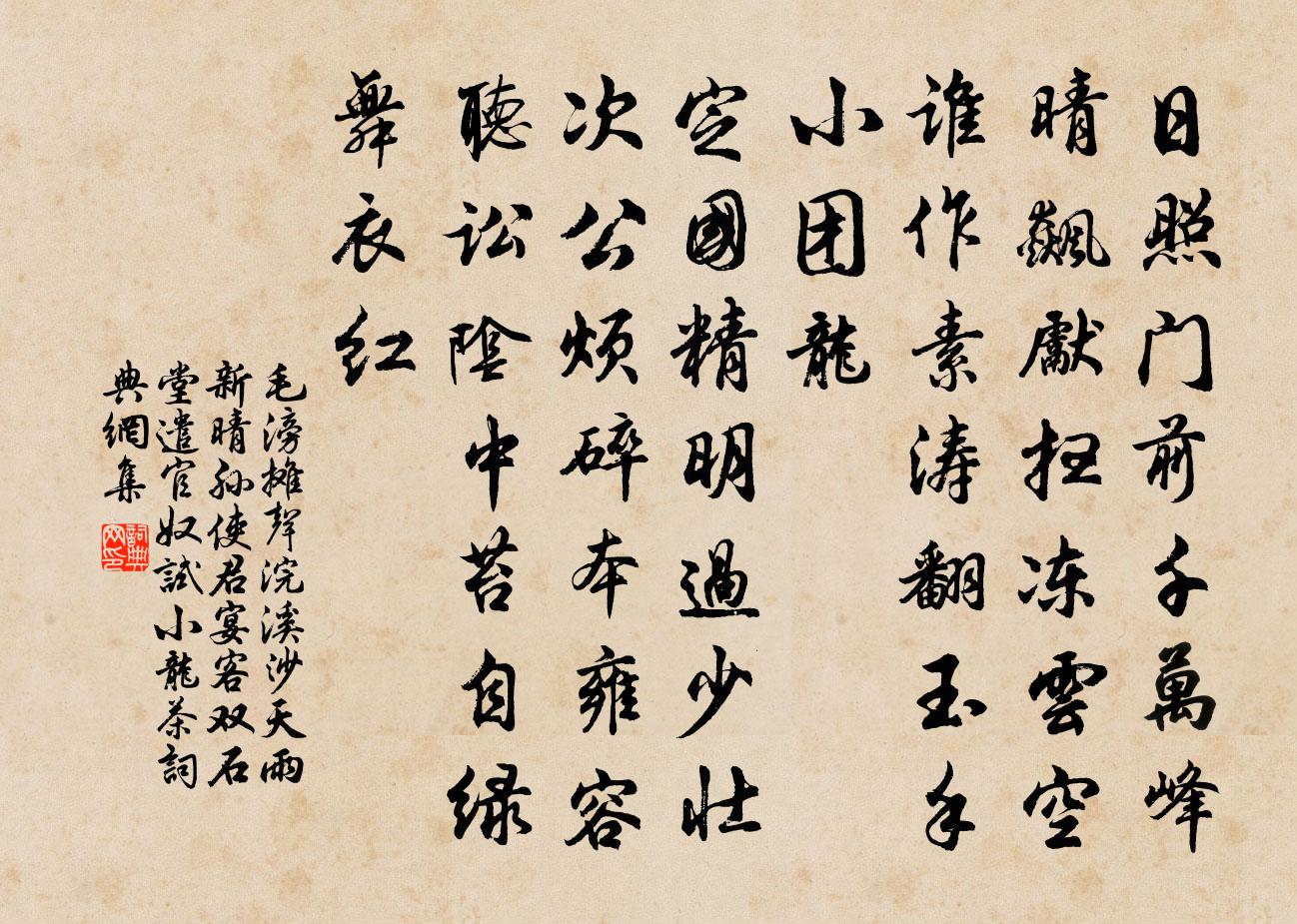 以下兩句轉寫試小龍茶的情景 。小團龍 ,又作“小團”,茶之品莫貴於此。前二句寫注水後的奇觀,後二句寫注水時的妙手 ,可以從中體會詞里“ 作素濤 ”、“翻玉手”的情狀。“翻”字寫出纖纖玉手靈巧的動作,給觀者以美的享受。上片由門前而堂內,由景及人,流露了歡愉的情緒,並且在誇讚主人的情盛茶香。
