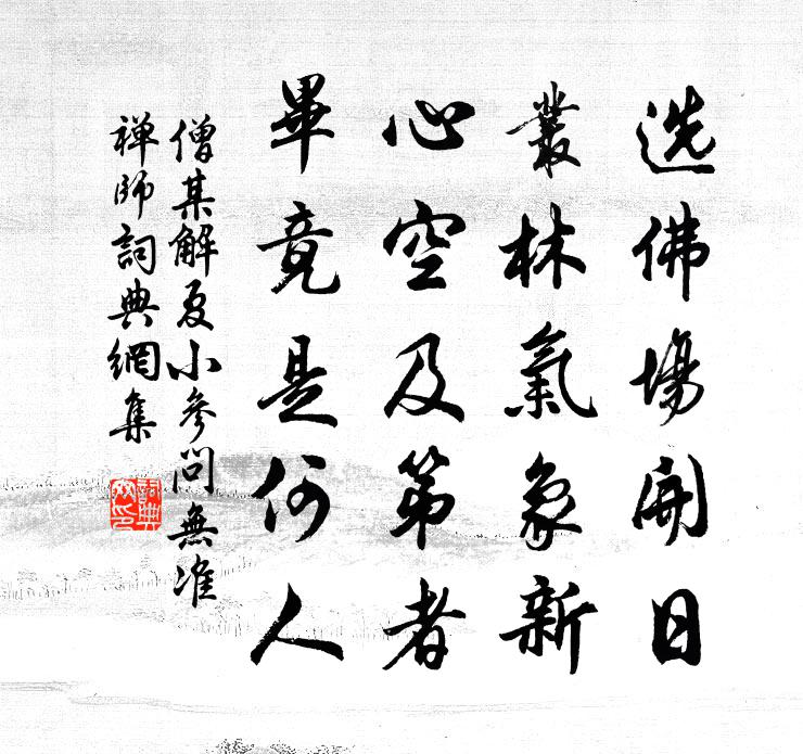 詩詞名句歷史字典書法欣賞書法字典國語詞典說文解字康熙字典古漢語字典標 題 作 者 詩 句 解夏小參問無準禪師作者:僧某 朝代:宋代解夏小參問無準禪師原文選佛場開日,叢林氣象新。心空及第者,畢竟是何人。詩詞問答問:解夏小參問無準禪師的作者是誰?答:僧某問:解夏小參問無準禪師寫於哪個朝代?答:宋代僧某解夏小參問無準禪師書法欣賞解夏小參問無準禪師書法作品詩詞推薦初秋夢故山覺而有作陸游〔宋代〕犬吠舍前後,月明村東西。岸草蛩亂號,庭樹鳥已棲。我仆城中還,擔頭有懸雞。小兒勸我飲,村酒拆赤泥。我醉蘇小小歌 / 蘇小小墓李賀〔唐代〕幽蘭露,如啼眼。無物結同心,煙花不堪剪。草如茵,松如蓋。風為裳,水為珮。油壁車,夕相待。冷翠燭,勞光傷春詞寄紫元四首白玉蟾〔宋代〕幽人何事苦傷春,春雨無端愁 * 。不但幽人獨愁怨,江頭多少柳眉顰。辛丑正月上休日謁靈康廟拜滕公祠唐仲友〔宋代〕蒼山余雪在雲端,五兩搖風減曉寒。谷應笙簧成兩部,日涵煙水上三竿。相逢戲事留仙傳,如在英魂激壯肝。分職經殺子谷陶翰〔唐代〕扶蘇秦帝子,舉代稱其賢。百萬猶在握,可爭天下權。束身就一劍,壯志皆棄捐。塞下有遺蹟,千齡人共傳。疏蕪夏日七首張耒〔宋代〕蘄簟紗廚與夏宜,法曹腰腹大何為。重雲到地翻盆雨,卻是幽人穩睡時。十二月二十六日趨府陳造〔宋代〕誰謂一舍遠,不辦三餐趨。亭午縣市西,衙鼓府城隅。匹馬驚鳥去,指槌冰在須。北風挾霜氣,萬象付摧枯。想當早秋集賢院即事(時為學士)劉禹錫〔唐代〕金數已三伏,火星正西流。樹含秋露曉,閣倚碧天秋。灰琯應新律,銅壺添夜籌。商飆從朔塞,爽氣入神州。蕙草雲溪觀竹戲書二絕句陸游〔宋代〕氣蓋冰霜勁有餘,江邊見此列僊癯。清寒直入人肌骨,一點塵埃住得無?偈六十九首釋道寧〔宋代〕毗慮影里,般若光中。互為主伴,法界融能。白雲片片,帝網重重。形分萬派,月印寒空。道人活計,古佛家風。奉和襲美送李明府之任南海陸龜蒙〔唐代〕春盡之官直到秋,嶺雲深處憑瀧樓。居人愛近沈珠浦,候吏多來拾翠洲。賨稅盡應輸紫貝,蠻童多學佩金鉤。之君寄題石湖先生范至能參政石湖精舍楊萬里〔宋代〕萬頃平湖石琢成。尚存越壘對吳城。如何豪傑於戈地,卻入先生杖屨聲。古往今來真一夢,湖光月色自雙清。東風豐乾贊釋師範〔宋代〕淨土不居居穢土,良馬不騎騎猛虎。回頭轉腦謾招呼,誰肯與伊為伴侶。虛白堂白居易〔唐代〕虛白堂前衙退後,更無一事到中心。移床就日檐閒臥,臥詠閒詩側枕琴。頌古二十六首釋嗣宗〔宋代〕過去心不可得,收綸罷釣秋江碧。扁舟古岸恣閒眠,明月蘆華深穩密。現在心不可得,法王家法存今昔。謀巨猛將太常引舒頔〔元代〕□□山色共承宣。君秩滿、我遲延。幾度醉花前。曾怪殺、春山杜鵑。菱花再照,鸞膠再續,應笑雪盈顛。深夜語江夏春感舊李頻〔唐代〕東風出海門,處處動林園。澤國雪霜少,沙汀花木繁。暖魚依水淺,晴雁入空翻。何處陽和力,生萍不駐根。滿庭芳臧魯子〔宋代〕露洗銀潢,風來玉宇,正當□□□□。□□□閣,爭看擁冰輪。共指銀河影里,依稀見、執斧仙人。還知麽,天教第一百八十七文天祥〔宋代〕丈夫四方誌,喪亂飽經過。清心聽鳴鏑,衰老強高歌。與崔二十一游鏡湖寄包賀二公孟浩然〔唐代〕試覽鏡湖物,中流見底清。不知鱸魚味,但識鷗鳥情。帆得樵風送,春逢穀雨晴。將探夏禹穴,稍背越王城。府掾名句推薦願君多採擷,此物最相思。王維《相思》 思欲委符節,引竿自刺船。元結《賊退示官吏》 今日暫同芳菊酒,明朝應作斷蓬飛。王之渙《九日送別》 軍聽了軍愁,民聽了民怕。王磐《朝天子·詠喇叭》 重到故鄉交舊少,淒涼。卻恐它鄉勝故鄉。陸游《南鄉子·歸夢寄吳檣》 遙知未眠月,鄉思在漁歌。杜荀鶴《送人游吳》 其次致曲。曲能有誠。誠則形。形則著。著則明。明則動。動則變。變則化。唯天下至誠為能化。子思《中庸·第二十三章》 雨中禁火空齋冷,江上流鶯獨坐聽。韋應物《寒食寄京師諸弟》 一日不見,如三月兮。佚名《子衿》 寧添一斗,莫添一口。佚名《增廣賢文·上集》