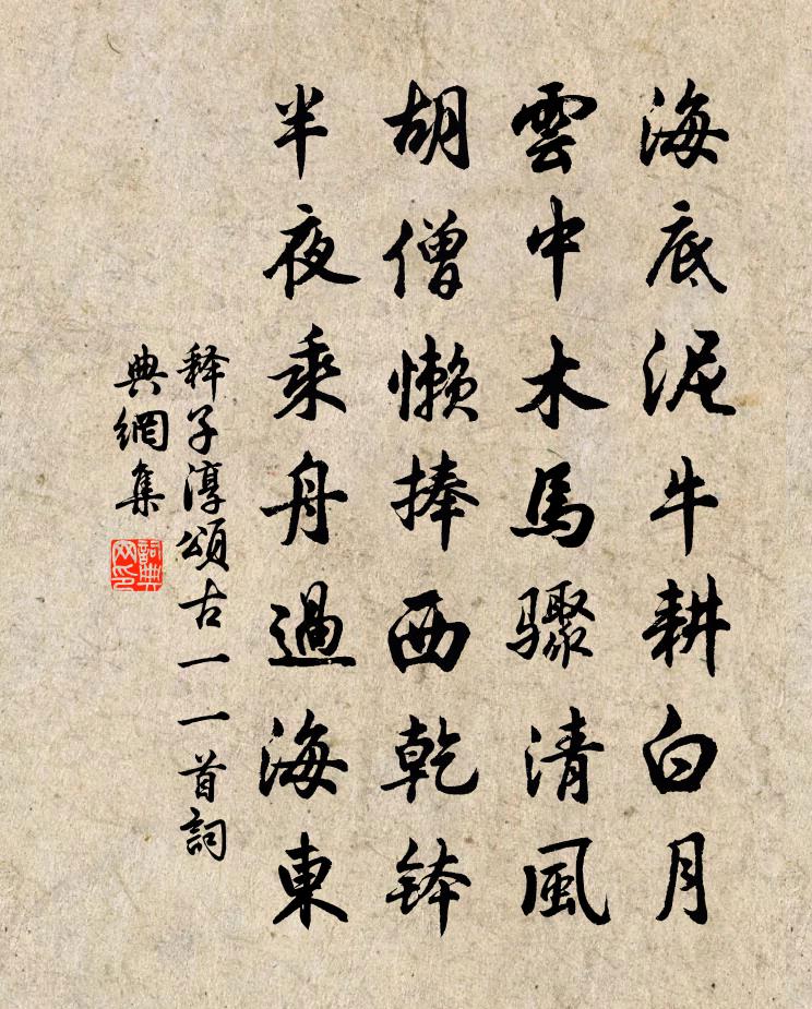 詩詞名句歷史字典書法欣賞書法字典國語詞典說文解字康熙字典古漢語字典標 題 作 者 詩 句 頌古一○一首作者:釋子淳 朝代:宋代頌古一○一首原文海底泥牛耕白月,雲中木馬驟清風。胡僧懶捧西乾缽,半夜乘舟過海東。詩詞問答問:頌古一○一首的作者是誰?答:釋子淳問:頌古一○一首寫於哪個朝代?答:宋代釋子淳頌古一○一首書法欣賞頌古一○一首書法作品詩詞推薦曉起羅公升〔宋代〕危柯早得秋,羈鶴易知曉。幽人帶星起,古木叫孤鳥。簾影一丈高,曙色萬里杳。人衡蒼茫內,樹立浩蕩表。安知頌古一百則釋正覺〔宋代〕絲綸降,號令分,寰中天子,塞外將軍。不待雷驚出蟄,那知風遏行雲。機底聯綿兮,自有金針玉線。印前恢廊兮錢侯東齋宋庠〔宋代〕北里開公第,東齋集俊游。祕書家有副,甲令世傳侯。鳳竹供聊冊,鯖盤入宴羞。門前多鶴蓋,不為騁長楸。浦早望孫岩〔宋代〕千峰倒影碧粼粼,摹寫桐江最逼真。每逢佳處謀書屋,漸恐山靈不信人。偈頌七十六首釋師觀〔宋代〕梵志翻著襪,是人皆道錯。寧可刺你眼,不可癮我腳。莫莫,醍醐上味,翻成毒藥。送成材鄧肅〔宋代〕伯夷自甘首陽蕨,商臣不戴周日月。那知世人冷笑渠,卻言馮道有全節。紛紛過眼萬飛蚊,何如閉目日飲醇。議論暫歸桂隱雜書四首張鎡〔宋代〕茅屋煙升正早炊,覆牆高柳漲新枝。飛綿莫便沾泥去,舊愛疎籬雪下時。吳山井樓鑰〔宋代〕錢塘東南一都會,西湖宛在高城外。鑿為六井引入城,唐相鄴侯功尚在。吳山橫亘城中央,左右江湖盡襟帶。寒泉浣溪沙(初冬)趙長卿〔宋代〕風卷霜林葉葉飛。雁橫寒影一行低。淡煙衰草不勝詩。白酒已篘浮蟻熟,黃雞未老藁頭肥。問儂不醉待何時。偈頌七十六首釋師範〔宋代〕佛祖命脈,洞然明白。黑漆屏風,松蘿亮隔。寄題崔校書郊舍黃滔〔唐代〕一片寒塘水,尋常立鷺鷥。主人貧愛客,沽酒往吟詩。陪張舍人出郊曾季貍〔宋代〕官椏千尋大,清溪五尺流。眼年春事過,心與老農謀。節物年年好,田園事事幽。緩歸陪皂蓋,覓句待蘇州。雜詩二首張耒〔宋代〕病腹難禁七◇茶,小窗睡起日西斜。貧無隙地栽桃李,日日門前自買花。和除夜作白居易〔唐代〕君賦此詩夜,窮陰歲之餘。我和此詩日,微和春之初。老知顏狀改,病覺肢體虛。頭上毛髮短,口中牙齒疏。一落故人陳秘書家有感戴復古〔宋代〕晚春風雨後,花絮落無聲。綠泛新荷出,青鋪細草生。私蛙為誰噪,老犬伴人行。舊日狂賓客,樽前笑不成。次韻梁教授陳造〔宋代〕一代司馬公,山立皋稷後。聲名竦華夷,所樂在五畝。著書不止陵左班,措世治平嘉佑間。不欺之學誰與嗣,元城贈僧艾性夫〔宋代〕利門名路兩何憑,百歲風前短焰燈。只恐為僧僧不了,為僧心了總輸僧。句辛棄疾〔宋代〕身為參禪老,家因赴詔貧。紹興祀岳鎮海瀆四十三首佚名〔宋代〕神曰司天,居南之衡。位焉則帝,於以奠方。南訛秩事,望禮有常。庶幾嘉虞,介福無疆。得江西報六言十首劉克莊〔宋代〕但見盈城盈野,誰能去食去兵。山東河北卷土,江右湖南失耕。名句推薦書無不可讀者!魏徵《隋書·列傳·卷四十一》 迴廊四合掩寂寞,碧鸚鵡對紅薔薇。李商隱《日射》 寥落古行宮,宮花寂寞紅。元稹《行宮》 啼時驚妾夢,不得到遼西。金昌緒《春怨 / 伊州歌》 垂柳依依惹暮煙,素魄娟娟當繡軒。王元鼎《憑欄人·閨怨》 能勝強敵者,先自勝者也。商鞅《商君書·畫策》 塵中見月心亦閒,況是清秋仙府間。劉禹錫《八月十五夜桃源玩月》 寂寂竟何待,朝朝空自歸。孟浩然《留別王侍御維 / 留別王維》 君子必在己者,不必在人者也。呂不韋《呂氏春秋·覽·孝行覽》 稱尊長,勿呼名。對尊長,勿見能。李毓秀《弟子規·出則弟》