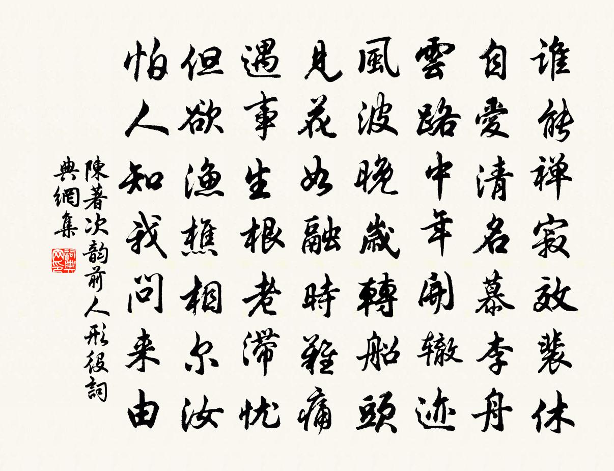 詩詞名句歷史字典書法欣賞書法字典國語詞典說文解字康熙字典古漢語字典標 題 作 者 詩 句 次韻前人形役作者:陳著 朝代:宋代次韻前人形役原文誰能禪寂效裴休,自愛清名慕李舟。雲路中年開轍跡,風波晚歲轉船頭。見花如融時難痛,遇事生根老滯憂。但欲漁樵相爾汝,怕人知我問來由。詩詞問答問:次韻前人形役的作者是誰?答:陳著問:次韻前人形役寫於哪個朝代?答:宋代陳著次韻前人形役書法欣賞次韻前人形役書法作品詩詞推薦蓮子詩比成自覺醜甚戲題此作以解發君一笑耳龍輔〔宋代〕書罷題鍾字,要君知妝心。雖然非白雪,卻是重黃金。游溫湯李流謙〔宋代〕丹雛振翰棲佛屋,蛟吻吐泉供客浴。東華夢破軟紅飛,不肯隨人到岩谷。扣欄投餌魚群喜,一鱗圉圉獨去之。萬里南歌子倪偁〔宋代〕佳月當今夕,清尊盡客歡。參橫斗轉夜將闌。試泛小溪深處、與重看。野水從磨激,群山勢郁盤。殷勤照我一杯殘雨後田間雜紀五首楊萬里〔宋代〕田水高低各斗鳴,溪流奔放更歡聲。小兒倒捻青梅朵,獨立茅檐看客行。次韻游景叔聞洮河捷報寄諸將四首黃庭堅〔宋代〕千仞溪中石轉雷,漢家萬騎搗虛回。定知獻馬胡雛入,看即稱觴都護來。聽新蟬寄張晝方乾〔唐代〕細聲頻斷續,審聽亦難分。仿佛應移處,從容卻不聞。蘭棲朝咽露,樹隱暝吟雲。莫遣鄉愁起,吾懷只是君。見趙知道運使戴復古〔宋代〕飽食武昌魚,不如歸故廬。盟鷗還海道,問雁覓家書。又把鄉人刺,來投使者車。東園桃與李,莫使著花疏。示安大師王安石〔宋代〕道人深北山為家,宴坐白露眠蒼霞。手扶梲杖雖老矣,走險尚可追麏麚。踞堂俯視何所有,窈窕樛木垂榠樝。深尋鄭丞相生日口號十首劉克莊〔宋代〕王呂紛更尚治安,史韓椓棧始凋殘。乃知元祐調弦易,卻是端平變局難。滿庭芳佚名〔宋代〕減飯除情,敵魔戰睡,聖賢學道根基。進人退己,用事契心機。遇境休生煙火,安閒處、性要無疑。爭知道,洪波南鄉子吳某〔宋代〕樓台里、東風淡盪。王可交升仙台四首黃庚〔宋代〕異人鍾秀氣,草木亦精神。見說為漁父,誰知悟道真。仙家多勝景,世路有迷津。安得騎黃鶴,相隨入昊閔。鷓鴣天周紫芝〔宋代〕彩鷁雙飛雪浪翻。楚歌聲轉綠楊灣。一川紅旆初銜日,兩岸朱樓不下簾。闌倚處,玉垂纖。白團扇底藕絲衫。未成狼跋佚名〔先秦〕狼跋其胡,載疐其尾。公孫碩膚,赤舄几几。狼疐其尾,載跋其胡。公孫碩膚,德音不瑕?農家陸游〔宋代〕吳農耕澤澤,吳牛耳濕濕。農功何崇崇,農事常汲汲。冬休築陂防,丁壯皆雲集。春耕人在野,農具已山立。房櫳偈頌二十四首釋智遇〔宋代〕雞足峰前,黃梅流口,逗到冷泉幾制肘。若謂凌霄非正傳,畢竟衣法屬誰手。野犴吼,虛空昨夜翻筋斗。一落索呂渭老〔宋代〕鳥散餘花飛舞。滿地風雨。長江滾滾接天流,夜送征帆去。今夜行云何處。斷腸南浦。殘燈不剪五更寒,獨自與、賦得泛泛水中鳧詩江總〔隋代〕歸鳧沸卉同。亂下芳塘中。出沒時銜藻。飛鳴忽揚風。浮深或不息。戲廣若乘空。春鸚徒有賦。還笑在金籠。春日李舍人宅見兩省諸公唱和,因書情即事張籍〔唐代〕又見帝城裡,東風天氣和。官閒人事少,年長道情多。紫掖發章句,青闈更詠歌。誰知余寂寞,終日斷經過。寄楊六(楊攝萬年縣尉,余為贊善大夫)白居易〔唐代〕青宮官冷靜,赤縣事繁劇。一閒復一忙,動作經時隔。清觴久廢酌,白日頓虛擲。念此忽踟躕,悄然心不適。豈無名句推薦湖上春既早,田家日不閒。丘為《題農父廬舍》 堂上遠於百里,堂下遠於千里,門庭遠於萬里。管仲《管子·法法》 兒童漫相憶,行路豈知難。元好問《倪莊中秋》 萬里赴戎機,關山度若飛佚名《木蘭詩/木蘭辭》 故鄉籬下菊,今日幾花開。江總《於長安歸還揚州九月九日行薇山亭賦韻 / 長安九日詩》 中年親友難別,絲竹緩離愁。蘇軾《水調歌頭·安石在東海》 裳裳者華,其葉湑兮。佚名《裳裳者華》 曲港跳魚,圓荷瀉露,寂寞無人見。蘇軾《永遇樂·彭城夜宿燕子樓》 衰蘭送客鹹陽道,天若有情天亦老。李賀《金銅仙人辭漢歌》 運退黃金失色,時來鐵也生光。馮夢龍《醒世恆言·卷三》