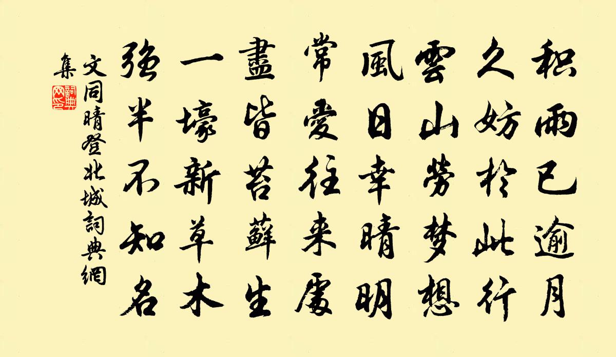 詩詞名句歷史字典書法欣賞書法字典國語詞典說文解字康熙字典古漢語字典標 題 作 者 詩 句 晴登北城作者:文同 朝代:宋代晴登北城原文積雨已逾月,久妨於此行。雲山勞夢想,風日幸晴明。常愛往來處,盡皆苔蘚生。一壕新草木,強半不知名。詩詞問答問:晴登北城的作者是誰?答:文同問:晴登北城寫於哪個朝代?答:宋代文同晴登北城書法欣賞晴登北城書法作品詩詞推薦清平樂劉敞〔宋代〕小山業桂。最有留人意。拂葉攀花無限思。雨濕濃香滿袂。別來過了秋光。翠簾昨夜新霜。多少月宮閒地,姮娥與紅梅陳景沂〔宋代〕色異味同失主張,厭寒附暖逐群芳。當知不改冰霜操,戲學陶家艷冶妝。和微之堯夫作會韓維〔宋代〕燕豆何頻設,歸鞍夜屢闌。敢言揮麈倦,惟怯釂觴難。就暖歌筵密,憑高繪境寬。未甘閒處臥,猶學少時歡。浮蟻夜來枕上得四絕句因視王性之謝其相訪也未專晁說之〔宋代〕皇祚中興徹九垓,不煩猶道宋王臺。歸鴻特比常年少,應戀黃麾不忍來。浩歌行趙汝淳〔宋代〕堂堂楚漢多蠻觸,天下今經幾秦鹿。向非孔壁斷遺編,安得西湖芳草綠。子規自失來時路,卻喚青春早歸去。山中明皇與貴妃袁枚〔清代〕到底君王負舊盟,江山情重美人輕。玉環領略夫妻味,從此人間不再生。依韻和益州司理劉大著喜與運使薛端公相見之魏野〔宋代〕錦川風物似逢丘,運使詩流壓九流。五色雲中題寺觀,四時花里按軍州。棠郊野客空遙羨,蘭省才郎稱共游。縱使會昌號湘江岸有小峴亭癸卯六月與瑞金吳丞飲曾豐〔宋代〕占斷江西景,臨川擬峴台。今猶千里隔,我更幾時回。幸此亭相似,非公坐莫陪。古今隨水去,風月送詩來。四月十二日以夏潦暴甚艤舟辰之鐵槍崖下偶得趙蕃〔宋代〕昔讀梅蘇木山詩,未信人間有此奇。雖雲尤物不必有,時一玩之何病為。吾行東南千萬里,仙遊不已遂臻此。奇奇湘漢旅懷翁傑周賀〔唐代〕一宿空江聽急流,仍同賈客坐歸舟。遠書來隔巴陵雨,衰鬢去經彭蠡秋。不擬為身謀舊業,終期斷谷隱高丘。吾宗贊歷代天師第十二代諱仲常字德潤白玉蟾〔宋代〕鶴書曾詔赴宸京,歸作分形化景人。昨日飲酣曾吐酒,醒來又薄瓮頭春。木蘭花慢(中秋)洪皓〔宋代〕屬三秋正半,暮雲斂、月舒圓。誤驚鶴鳴皋,棲烏繞樹,魑魅驚旋。尋常對三五夜,縱清光、皎潔未精妍。須是風普熏院李淛〔宋代〕征鞍曉踏山頭月,客袂晝披松下風。況有禪堂供偃息,陶然一枕夢槐宮。秋興陸游〔宋代〕秋暑勢已窮,風雨縱橫至。白鷺立清灘,與我俱得意。三和二首劉克莊〔宋代〕長劍拄頤刀納鞾,得如曝背趁陽和。買鄰底用百萬價,好事爭為十二窩。異日史臣應有考,同時朝士欲無多。與君送趙伯藏添倅永嘉樓鑰〔宋代〕分教分符恰五年,異鄉幾若故鄉然。歸來幾作池塘夢,送別欲隨騶御仙。目斷甘林應飽熟,手栽欒實想芳鮮。邦人和張功父梅詩十絕句楊萬里〔宋代〕道山堂後數株梅,為底偏於雨里開。到得晴來無一朵,亂飛白雪點蒼苔。山居葉茵〔宋代〕古木環池竹數竿,疏籬補菊屋三間。白雲不放紅塵入,無怪山人懶出山。謝東園主人惠蔡公草書陳宓〔宋代〕開軒但覺快心眸,百載雲煙靄未收。誰謂昔人成邁往,每於遺墨見風流。看中猛勢驤龍虎,藏處寒光射鬥牛。白璧南溪會集二首傅察〔宋代〕淡盪春溪帶晚城,勝游此地繼半亭。風搖波面琉璃簟,雨洗山光翡翠屏。舉酒莫辭歸酩酊,垂綸聊復向清泠。會須名句推薦罔游於逸,罔淫于樂。佚名《尚書·虞書·大禹謨》 一疑一信相參勘,勘極而成知者,其知始真。洪應明《菜根譚·概論》 遮莫圓明似前度,不知誰續廣寒游。慧霖《閏中秋玩月》 厭見千門萬戶,經過北里南鄰。王維《田園樂七首·其一》 立身之道何窮,只得一敬字,便事事皆整。王永彬《圍爐夜話·第一六三則》 濃霧知秋晨氣潤,薄雲遮日午陰涼,不須飛蓋護戎裝。范成大《浣溪沙·江村道中》 行人與我玩幽境,北風切切吹衣冷。李頎《少室雪晴送王寧》 利出者實及,怨往者害來。列子及其弟子《列子·說符》 過眼年華,動人幽意,相逢幾番春換。王沂孫《法曲獻仙音·聚景亭梅次草窗韻》 苔深不能掃,落葉秋風早。李白《長干行二首》
