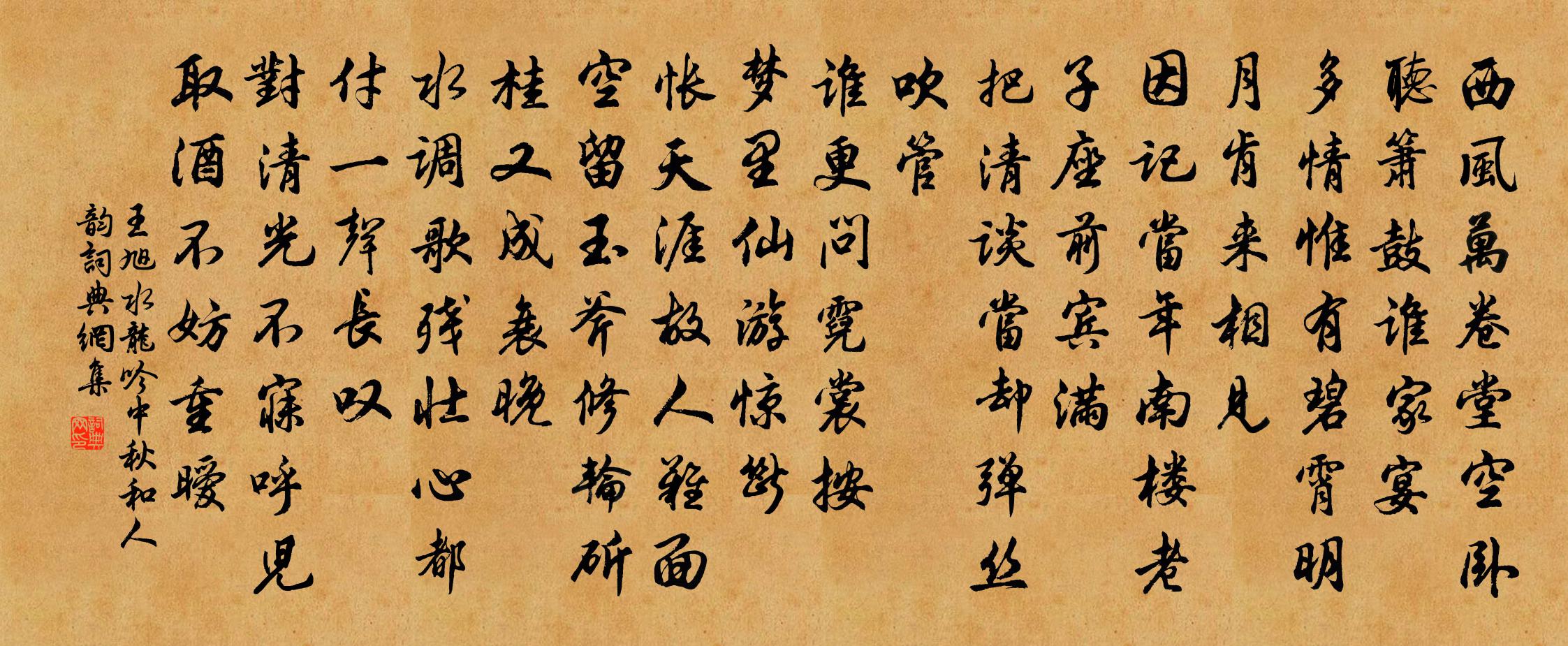 詩詞名句歷史字典書法欣賞書法字典國語詞典說文解字康熙字典古漢語字典標 題 作 者 詩 句 水龍吟 中秋和人韻作者:王旭 朝代:元代水龍吟 中秋和人韻原文西風萬卷堂空,臥聽簫鼓誰家宴。多情惟有,碧霄明月,肯來相見。因記當年,南樓老子,座前賓滿。把清談當卻,彈絲吹管。誰更問,霓裳按。夢裡仙遊驚斷。悵天涯、故人難面。空留玉斧,修輪斫桂,又成衰晚。水調歌殘,壯心都付,一聲長嘆。對清光不寐,呼兒取酒,不妨重曖。詩詞問答問:水龍吟 中秋和人韻的作者是誰?答:王旭問:水龍吟 中秋和人韻寫於哪個朝代?答:元代問:水龍吟 中秋和人韻是什麼體裁?答:詞王旭水龍吟 中秋和人韻書法欣賞水龍吟 中秋和人韻書法作品詩詞推薦次韻梅山弟惠雞臡陳著〔宋代〕手制雞臡味可知,雨書走餉慰窮飢。可能夜去聞聲舞,卻效早鳴逃難鄧。伴宋讀書知已久,為由為黍愧非宜。從今相和歌辭。長門怨李華〔唐代〕弱體鴛鴦薦,啼妝翡翠衾。鴉鳴秋殿曉,人靜禁門深。每憶椒房寵,那堪永巷陰。自驚羅帶緩,非復舊來心。浚溝廟蜥蜴鄭獬〔宋代〕不歸大海不藏山,碧瓦朱欄綠樹閒。應待老龍才睡著,便偷雲雨落人間。過鐵山驛馮時行〔宋代〕來時趁作世情游,歸去淒涼遣客愁。萬事世間多反覆,一生此地幾春秋。天寒樹老葉全脫,水落岸高溪不流。行路傷春李昌符〔唐代〕即是春風盡,仍沾夜雨歸。明朝更來此,兼恐落花稀。奉和景仁西湖泛舟司馬光〔宋代〕滿船歌吹拂春灣,天外晴霞水底斑。誰信飛觴臨綺席,獨能回首望青山。東門車馬匆匆別,西洛風煙寂寂閒。疊石送餞從叔辭豐州幕歸嵩陽舊居盧綸〔唐代〕白須宗孫侍坐時,願持壽酒前致詞。鄙詞何所擬,請自邊城始。邊城貴者李將軍,戰鼓遙疑天上聞。屯田布錦周千茶谷閒步張鎡〔宋代〕自攜折腳鐺,煮芽仍帶葉。客至請渠嘗,俗塵消曠劫。句岳珂〔宋代〕動指不須占染鼎,去毛切莫拗蒸壺。書事二首劉克莊〔宋代〕因治陶朱術太精,世間無物足經營。更將郭璞書頻看,只恐青山盡鑿平。除夜宿洺州白居易〔唐代〕家寄關西住,身為河北游。蕭條歲除夜,旅泊在洺州。平蓋治張繼先〔宋代〕昔人已去附龍鱗,神氣猶存錄籍真。洞口記曾三拜日,雲間別是一家春。釣絲無跡龜魚靜,樵客忘機虎豹馴。金井晚晴葛紹體〔宋代〕風頭雨歇靜檐花,渡口人稀解釣蓑。零落斷雲無處著,滿湖秋水夕陽多。長相思吳潛〔宋代〕要相逢,恰相逢。畫舫朱簾脈脈中。霎時煙靄重。怨東風,笑東風。落花飛絮兩無蹤。分付與眉峰。自和書秋王初〔唐代〕隴首斜飛避弋鴻,頹雲蕭索見層空。漢宮夜結雙莖露,閶闔涼生六幕風。湘女怨弦愁不禁,鄂君香被夢難窮。江邊臨封雜詠田開〔宋代〕我愛臨封好,賓朋日往還。年來甘白酒,老去益朱顏。引鶴游西寺,攜琴上北山。君恩雖未報,公外且偷閒。宿蘭溪水驛前楊萬里〔宋代〕合眼波吹枕,開篷月入船。奇哉一江水,寫此二更天。剩欲酣清賞,翻愁敗醉眠。今宵懷昨夕,雨臥萬峰前。賀崔大夫崔正字杜牧〔唐代〕內舉無慚古所難,燕台遙想拂塵冠。登龍有路水不峻,一雁背飛天正寒。別夜酒余紅燭短,映山帆去碧霞殘。謝公【雙調】壽陽曲_擔春盛,問貫雲石〔元代〕擔春盛,問酒家,綠楊陰似開圖畫。下鞦韆玉容強似花,汗溶溶透入羅帕。 松杉翠,茉莉香,步迴廊老仙策杖和趙彥德旅懷。是夕,渠誦詩鼓琴楊萬里〔宋代〕客間眼暗可逢人,公子詩琴卻有神。頻掉烏紗知得句,快揮綠綺更留塵。飄零不問今何夕,邂逅相歡意便親。作許名句推薦山高月小,水落石出。蘇軾《後赤壁賦》 楊柳陰陰細雨晴,殘花落盡見流鶯。武元衡《春興》 水墨畫疏窗,孤影淡瀟湘。納蘭性德《木蘭花慢·立秋夜雨送梁汾南行》 莫見長安行樂處,空令歲月易蹉跎。李頎《送魏萬之京》 謀無主則困,事無備則廢。管仲《管子·霸言》 池邊釣女日相隨,妝成照影竟來窺孟浩然《高陽池送朱二》 民之歸仁也,猶水之就下、獸之走壙也。孟子《孟子·離婁章句上·第九節》 止戈為武。左丘明《左傳·宣公·宣公十二年》 西湖到日,重見梅鈿皺。吳文英《瑞龍吟·送梅津》 菊花信待重陽久,桂子香聞上界留。慧霖《閏中秋玩月》