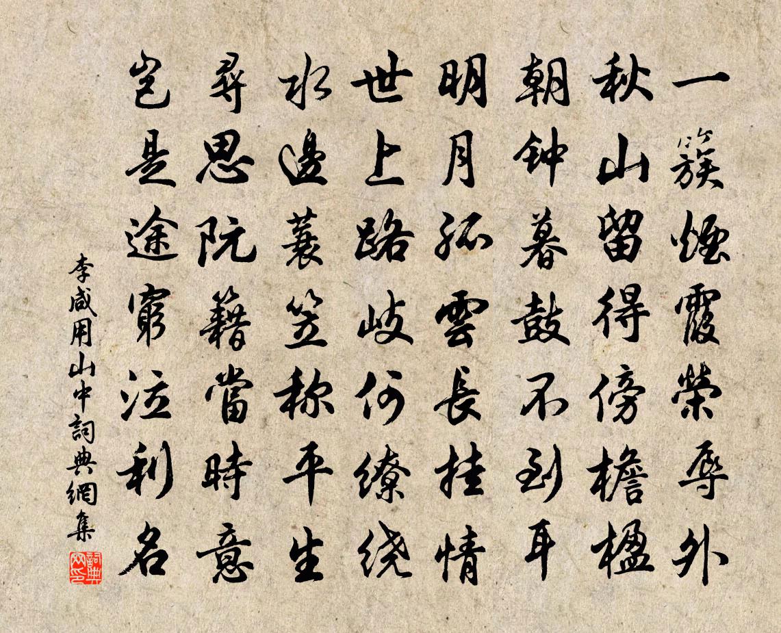 詩詞名句歷史字典書法欣賞書法字典國語詞典說文解字康熙字典古漢語字典標 題 作 者 詩 句 山中作者:李鹹用 朝代:唐代山中原文一簇煙霞榮辱外,秋山留得傍檐楹。朝鐘暮鼓不到耳,明月孤雲長掛情。世上路岐何繚繞,水邊蓑笠稱平生。尋思阮籍當時意,豈是途窮泣利名。詩詞問答問:山中的作者是誰?答:李鹹用問:山中寫於哪個朝代?答:唐代問:山中是什麼體裁?答:七律李鹹用山中書法欣賞山中書法作品注釋全唐詩:卷646-56詩詞推薦聞蝶文天祥〔宋代〕北來追騎滿江濱,那更元戎按劍嗔。不是神明扶正直,淮頭何處可安身。郊廟朝會歌辭建隆乾德朝會樂章二十八首佚名〔宋代〕煌煌茂英,不根而生。蒲茸奪色,銅池著名。晨敷表異,三秀分榮。書於瑞典,光我文明。絕句漫興九首·其五杜甫〔唐代〕腸斷春江欲盡頭,杖藜徐步立芳洲。(春江 一作:江春)顛狂柳絮隨風去,輕薄桃花逐水流。月當窗(寓霜天曉角)張輯〔宋代〕看朱成碧。曾醉梅花側。相遇匆匆相別,又爭似、不相識。南北。千里隔。幾時重見得。最苦子規啼處,一片月、祝英台近朱彝尊〔清代〕紫蕭停,錦瑟遠,寂寞舊歌扇。萍葉空池,臥柳掃還倦。便令鳳頻書,芹泥長潤,招不到別巢秋燕。露華泫。猶剩寄許主客梅堯臣〔宋代〕昨日山光寺前雨,今朝邵伯堰頭風。野雲不散低侵水,魚艇無依尚蓋蓬。藉味初能消酒渴,蓼花猶愛照波紅。楊州放鷹白居易〔唐代〕十月鷹出籠,草枯雉兔肥。下鞲隨指顧,百擲無一遺。鷹翅疾如風,鷹爪利如錐。本為鳥所設,今為人所資。孰能松花開竹筍茂喜而詠之裘萬頃〔宋代〕繁花密筍暮春時,妝點園林一段奇。金粉生香風細細,斑衣留潤露垂垂。品高宜入神仙藥,節勁終全冰雪姿。笑彼觀太學釋奠宋祁〔宋代〕鄉盛菁莪選,邦崇奠菜儀。涓辰大昕鼓,持節少牢祠。粉袞瞻凝睟,銀袍豫攝齊。芼羹紛澗沚,郁齊泛尊彝。璧水句錢惟濟〔宋代〕曉陌壺漿滿,春風騎吹長。陪鄭王相公賦筵前垂冰,應教依韻徐鉉〔唐代〕窗外虛明雪乍晴,檐前垂霤盡成冰。長廊瓦疊行行密,晚院風高寸寸增。玉指乍拈簪尚愧,金階時墜磬難勝。晨餐送戴文子赴定海主簿徐璣〔宋代〕江天經雨後,秋意轉新高。遠棹送行客,涼颸生細濤。高人初祿仕,判語亦風騷。若到海西岸,佛光碟翠袍。春感詩李白〔唐代〕茫茫南與北,道直事難諧。榆莢錢生樹,楊花玉糝街。塵縈遊子面,蝶弄美人釵。卻憶青山上,雲門掩竹齋。憲宗章武孝皇帝輓歌詞三首元稹〔唐代〕國付宮重離後,宮身隨十聖宮仙。北辰移帝座,西日到虞泉。方丈言虛設,華胥事眇然。觸鱗曾在宥,偏哭墮髯前岐亭五首蘇軾〔宋代〕酸酒如虀湯,甜酒如蜜汁。三年黃州城,飲酒但飲濕。我如更揀擇,一醉豈易得。幾思壓茅柴,禁網日夜急。西鄰己亥歲感事崔塗〔唐代〕正聞青犢起葭萌,又報黃巾犯漢營。豈是將皆無上略,直疑天自棄蒼生。瓜沙舊戍猶傳檄,吳楚新春已廢耕。見說送道州張職方歐陽修〔宋代〕桂籍青衫憶共游,憐君華發始為州。身行南鴈不到處,山與北人相對愁。莫為高才輕遠俗,當令遺老識賢侯。三年避地山中和楊推夜寒韻二首趙必象〔宋代〕山藏皇恐色,溪訴不平聲。落葉啼猿怨,危枝宿鳥驚。林疏風四面,霜冷月三更。酒醒愁無寐,燒松炙到明。瑞鷓鴣華岳〔宋代〕挑盡銀缸半夜花。拍簾風勁卷龍沙。香傳梅福深深意,春在錢塘小小家。鴛被半閒才子恨,鶯簧初轉史君夸。歸來偶興釋紹嵩〔宋代〕暖日薰楊柳,溪風為肅然。浣衣逢野水,擁錫上瀧船。元是滄浪客,閒尋空谷泉。病來詩久廢,喜此得終篇。名句推薦回首昭陽辭落日,傷心銅雀迎秋月文天祥《滿江紅·代王夫人作》 遇沉沉不語之士,且莫輸心;見悻悻自好之人,應須防口。洪應明《菜根譚·概論》 楊柳風柔,海棠月淡,獨自倚闌時。薩都剌《小闌乾·去年人在鳳凰池》 松排山面千重翠,月點波心一顆珠。白居易《春題湖上》 何時倚虛幌,雙照淚痕乾。杜甫《月夜》 便做無情,莫也愁人苦朱淑真《蝶戀花·送春》 一聲已動物皆靜,四座無言星欲稀。李頎《琴歌》 賞罰如加於身,賦斂如取己物。此愛民之道也。姜子牙《六韜·文韜·國務》 蓮香隔浦渡,荷葉滿江鮮。劉孝威《採蓮曲·金槳木蘭船》 晝短苦夜長,何不秉燭游!佚名《生年不滿百》