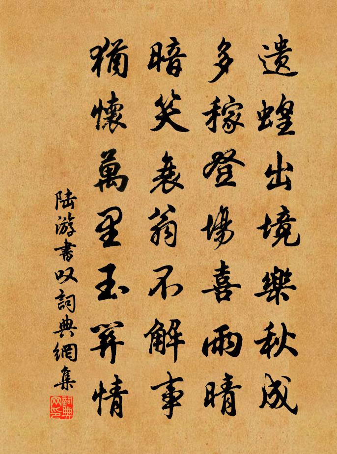 詩詞名句歷史字典書法欣賞書法字典國語詞典說文解字康熙字典古漢語字典標 題 作 者 詩 句 書嘆作者:陸游 朝代:宋代書嘆原文遺蝗出境樂秋成,多稼登場喜雨晴。暗笑衰翁不解事,猶懷萬里玉關情。詩詞問答問:書嘆的作者是誰?答:陸游問:書嘆寫於哪個朝代?答:宋代問:陸游的名句有哪些?答:陸游名句大全陸游書嘆書法欣賞書嘆書法作品詩詞推薦追和淵明貧土詩七首劉黻〔宋代〕高山與流水,妙趣歸之琴。吾愧學未成,菲嘆無知音。但向胸中會,毋勞指下尋。種菊或可茹,得酒聊復斟。窮達題苦竹寺海棠洞三首王之道〔宋代〕一徑封苔知雨足,貳車行縣昔時遷。對花啜茗思春日,拂拭新詩益悵然。廣宣上人頻見過韓愈〔唐代〕三百六旬長擾擾,不衝風雨即塵埃。久慚朝士無裨補,空愧高僧數往來。學道窮年何所得,吟詩竟日未能回。天寒同道損世則元輔游西湖於卞氏借雙鶴以觀梅堯臣〔宋代〕塘蒲蔭綠水,菡萏艷修渚。想像華亭野,但欠鳴鶴侶。同來三四人,趣向頗相與。思見此清禽,無能覿翔羽。城隅清平樂向子諲〔宋代〕有留人意。拂葉攀花無限思。露濕濃香滿袂。別來過了秋光。翠簾昨夜新霜。多少月宮閒地,姮娥與借余芳。”因趙景貺以詩求東齋榜銘昨日聞都下寄酒來戲和蘇軾〔宋代〕王孫天麒麟,眸子奧而澈。囊空學愈富,屋陋人更傑。我老書益放,筆落座爭制。欲求東齋銘,要飲西湖雪。長瓶孟子盡心知性陳普〔宋代〕心具良知所性根,若非窮理亦能昏。心須物格無餘蘊,藩蔽開除本體存。次趙解元韻陳造〔宋代〕興劉止用一編書,萬軸垂箋或腐儒。表表君今超北學,多多我已悔東隅。聲華看續諸公後,爾雅深知一筆無。縮手太平仙遊山神祠吳潛〔宋代〕仙遊杳不極,山夕景獨殊。丹氣發空翠,天燈照連珠。下有神之宅,何年托蓬壺。想爭隋氏鹿,赫赫雄萬夫。提劍王秘監夫人輓詞戴栩〔宋代〕五桂堂深處,霜萱竟不春。獨從前崦路,重見道山人。檢點哀詞眾,推尋碑事真。應言嫁時物,縱在亦為塵。建除詩鮑照〔南北朝〕建旗出燉煌。西討屬國羗。除去徒與騎。戰車羅萬箱。滿山又填谷。投鞍合營牆。平原亘千里。旗鼓轉相望。定舍示爽韓愈〔唐代〕宣城去京國,里數逾三千。念汝欲別我,解裝具盤筵。日昏不能散,起坐相引牽。冬夜豈不長,達旦燈燭然。座中香港感懷十首黃遵憲〔清代〕《博物》張華志,千間廣廈開。摩挲銅狄在,悵望寶山回。大鳥如人立,長鯨跋浪來。官山還府海,人力信雄哉!酬劉柴桑陶淵明〔魏晉〕窮居寡人用,時忘四運周。櫚庭多落葉,慨然知已秋。新葵郁北牖,嘉穟養南疇。今我不為樂,知有來歲不?命室如夢令許有壬〔元代〕歲暮天寒時節。滿意相看冰雪。不遣野人歸,誰慰此君清絕。清絕。清絕。添上一方明月。紅橋遊記王士禎〔清代〕出鎮淮門,循小秦淮折而北,陂岸起伏多態,竹木蓊鬱,清流映帶。人家多因水為園亭樹石,溪塘幽竊而明瑟,頗清明前呈南塘衛宗武〔宋代〕晚景淒涼事事休,與波上下任沉浮。花辰歲歲惟添花,榆火春春不改愁。幾曲畫屏新綠暗,一川流玉落紅稠。出門望江南/憶江南柳華淑〔宋代〕何處笛,覺妾夢難諧。春色惱人眠不得,捲簾移步下香階。呵凍卜金釵。人去也,畢竟信音乖。翠鎖雙蛾空宛轉,逍遙詠宋太宗〔宋代〕隨緣心不見,性各本來真。惡事夸唇頰,愚痴似醉人。忙忙何物有,急急利名親。入定觀浮世,蒼生業感因。晚興陸游〔宋代〕斸芋挑蔬自鬻羹,雪檐收滴暮寒生。不嫌終日無來客,時聽荒園斫木聲。名句推薦悅其名而喪其實。尹文《尹文子·大道上》 烽火平安夜,歸夢到家山。崔與之《水調歌頭·題劍閣》 讀書破萬卷,下筆如有神。杜甫《奉贈韋左丞丈二十二韻》 小舟從此逝,江海寄餘生。蘇軾《臨江仙·夜飲東坡醒復醉》 山中一夜雨,樹杪百重泉。王維《送梓州李使君》 寄相思,寒雨燈窗,芙蓉舊院。吳文英《宴清都·秋感》 予獨愛蓮之出淤泥而不染,濯清漣而不妖周敦頤《愛蓮說》 起來無語理朝妝,寶匣鏡凝光顧敻《虞美人·觸簾風送景陽鍾》 長安陌上無窮樹,唯有垂楊綰別離。劉禹錫《楊柳枝詞九首》 凡與敵戰,須要選揀勇將銳卒,使為先鋒,一則壯我志,一則挫敵威。佚名《百戰奇略·第一卷·選戰》