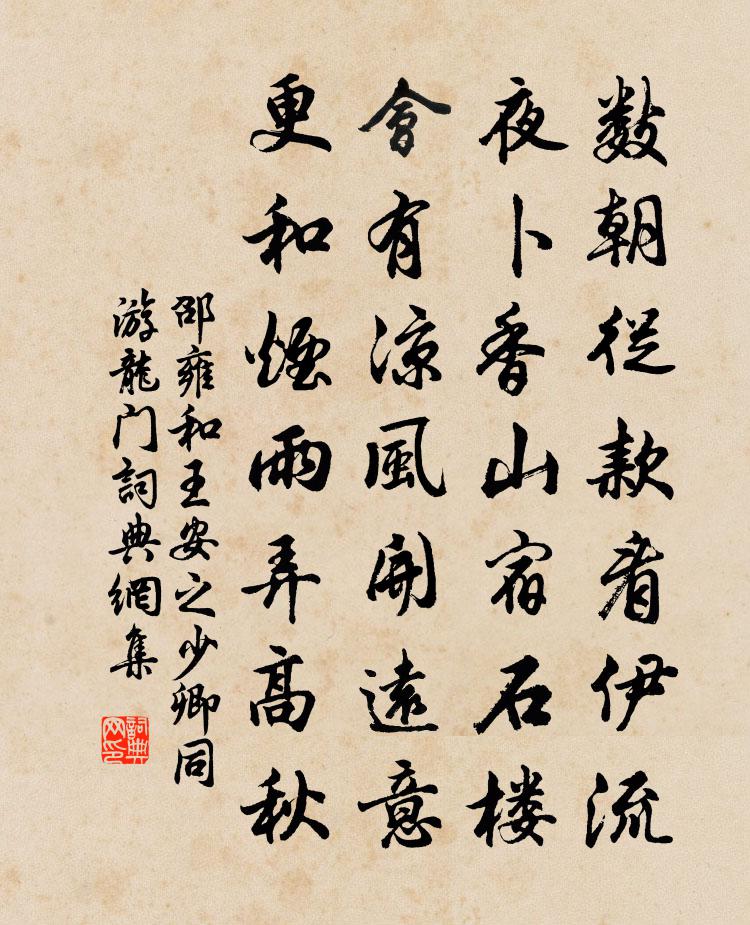 詩詞名句歷史字典書法欣賞書法字典國語詞典說文解字康熙字典古漢語字典標 題 作 者 詩 句 和王安之少卿同游龍門作者:邵雍 朝代:宋代和王安之少卿同游龍門原文數朝從款看伊流,夜卜香山宿石樓。會有涼風開遠意,更和煙雨弄高秋。詩詞問答問:和王安之少卿同游龍門的作者是誰?答:邵雍問:和王安之少卿同游龍門寫於哪個朝代?答:宋代邵雍和王安之少卿同游龍門書法欣賞和王安之少卿同游龍門書法作品詩詞推薦林少伊直院母夫人柳氏輓詞蘇籀〔宋代〕英英批鳳傑,遺懿誦高堂。淑質宗姻慕,慈憐壽凱康。委蛇瞷夫子,勤苦養尊章。駒隙八旬促,蘭陔愴隕霜。長思仙 贈魏害風馬鈺〔元代〕害風仙。害風仙。萬事俱忘理太玄。調和汞與鉛。結金蓮。結金蓮。九轉功成性月圓。超凡入洞天。黃檗館權德輿〔唐代〕驅車振楫越山川,候曉通宵冒煙雨。青楓浦上魂已銷,黃檗館前心自苦。題息軒黃庭堅〔宋代〕僧開小檻籠沙界,鬱郁參天翠竹叢。萬籟參差寫明月,一家寥落共清風。 * 禪板無人付,茶鼎薰爐與客同。萬水贈郭功父吳則禮〔宋代〕兒童疇昔看揮毫,未覺雄辭愧廣騷。談塵縱橫走雷電,詩壇磊落建麾旄。捐身魚鳥黃塵遠,隱几江湖白浪高。短褐雩祀樂章。肅和佚名〔唐代〕朱鳥開辰,蒼龍啟映。大帝昭饗,群生展敬。禮備懷柔,功宣舞詠。旬液應序,年祥協慶。皇孫壽詩二首陳造〔宋代〕曾簉蓬萊挹德風,日親儒保罄寅恭。學窮奧閫包賢聖,人仰英明肖祖宗。彩服近天仍樂孺,帝觴拜賜列從容。應劉同蔡孚起居詠鸚鵡(一作裴漼詩)胡皓〔唐代〕鸚鵡殊姿致,鸞皇得比肩。常尋金殿里,每話玉階前。賈誼才方達,揚雄老未遷。能言既有地,何惜為聞天。次韻和永叔飲余家詠枯菊梅堯臣〔宋代〕今年重陽公欲來,旋種中庭已開菊。黃金碎翦千萬層,小樹婆娑嘉趣足。鬢頭插蕊惜光煇,酒面浮英愛芬馥。旋種曝書吟邵雍〔宋代〕蟲蠹書害少,人蠹書害多。蟲蠹曝已去,人蠹當如何。溪上陸游〔宋代〕散發倚胡床,風生水面涼。單衣縫白紵,雙屨織青芒。荷葉猶微赤,藤花已半黃。歸來村路晚,漁火耿蒼茫。平綠軒王用亨〔宋代〕塵器胸次嘗苦隘,誰謂一隅天地寬。野色供餐來几上,山光極目在林端。犁耕宿雨春風暖,舟撼清流夜雨寒。卻笑奉酬元相公上元徐凝〔唐代〕出擁樓船千萬人,入為台輔九霄身。如何更羨看燈夜,曾見宮花拂面春。和毗陵尉曹昭用見寄李中〔唐代〕決獄多餘暇,冥搜萬象空。捲簾疏雨後,鎖印夕陽中。還往多名士,編題尚古風。宦途知此味,能有幾人同。鹹通十四年府試木向榮(題中用韻)鄭谷〔唐代〕園林青氣動,眾木散寒聲。敗葉牆陰在,滋條雪後榮。欣欣春令早,藹藹日華輕。庾嶺梅先覺,隋堤柳暗驚。山川宣武軍鎮作王彥威〔唐代〕天兵十萬勇如貔,正是酬恩報國時。汴水波瀾喧鼓角,隋堤楊柳拂旌旗。前驅紅旆關西將,坐間青娥趙國姬。寄語禪人並化主寫真求贊釋正覺〔宋代〕面孔何如,雪髮霜須。秋明月窟,春發冰壺。妙盡還移步,功忘聊放鋤。拈來隨處成宗要,向道斯人德不孤。頌古一百二十一首釋宗杲〔宋代〕忽爾出門先見路,才方洗腳便登船。神仙秘訣真堪惜,父子雖親不可傳。行香子(鄱陽鰜魚)劉學箕〔宋代〕雪白肥鰜。墨黑修鮎。柳穿腮、小大相兼。金刀批臠,鮮活甘甜。或時熬,或時煮,或時醃。揎腕佳人,玉手纖纖消湖虞似良〔宋代〕野草閒花洞口春,碧潭如鑒淨無塵。江山好景攜不得,漾入酒杯和月吞。名句推薦兩個黃鸝鳴翠柳,一行白鷺上青天。杜甫《絕句》 前村深雪裡,昨夜一枝開。齊己《早梅》 王侯將相寧有種乎?司馬遷《史記·陳涉世家》 忠告而善道之,不可則止,毋自辱焉。孔子弟子《論語·顏淵篇》 去年戰桑乾源,今年戰蔥河道。李白《戰城南》 輕財足以聚人,律己足以服人,量寬足以得人,身先足以率人。陳繼儒《小窗幽記·集醒篇》 坐愁群芳歇,白露凋華滋。李白《秋思》 翠葉吹涼,玉容消酒,更灑菇蒲雨。姜夔《念奴嬌·鬧紅一舸》 沅有芷兮澧有蘭,思公子兮未敢言。屈原《九歌·湘夫人》 多少天涯未歸客,盡借籬落看秋風。唐寅《菊花》