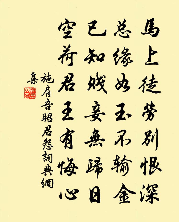 詩詞名句歷史字典書法欣賞書法字典國語詞典說文解字康熙字典古漢語字典標 題 作 者 詩 句 昭君怨作者:施肩吾 朝代:唐代昭君怨原文馬上徒勞別恨深,總緣如玉不輸金。已知賤妾無歸日,空荷君王有悔心。詩詞問答問:昭君怨的作者是誰?答:施肩吾問:昭君怨寫於哪個朝代?答:唐代問:昭君怨是什麼體裁?答:樂府施肩吾昭君怨書法欣賞昭君怨書法作品注釋全唐詩:卷494-176詩詞推薦送光長老住顯親釋崇岳〔宋代〕同條端的不同條,個個溈山水牯牛。一做這般蟲豸去,牽犁拽杷幾時休。芙蓉鄭剛中〔宋代〕池邊幾簇木芙蓉,浥露棲煙花更濃。地有鮮鮮金菊對,賞時莫惜醉千鍾。夜投山家陸游〔宋代〕驀溝上阪到山家,牧豎應門兩髻丫。葑火正紅煨竽熟,豈知新貴築堤沙?次韻吳僧魁一山十絕方回〔宋代〕東南衲子密如雲,何限參寥與惠勤。泉下歐蘇今不作,伽佗只夜亂紛紛。上沙遇雨快涼范成大〔宋代〕刮地風來健葛衣,一涼便覺暑光低。雲頭龍掛如垂箸,雨在中峰白塔西。句杜耒〔宋代〕不畫涪翁畫李翁。和范監簿釋重顯〔宋代〕吏散簾垂思莫窮,山光溪影恣相容。誰夸靖節偏栽柳,自笑隱居高聽松。丹闕尚遙芝檢密,訟庭閒列蘚花重。岩間滿江紅李曾伯〔宋代〕姑射山人,仙去後、唯存標格。猶賴有、墨池老手,草玄能白。留得歲寒風骨在,豈煩造化栽培力。有世間、肉眼滿江紅華岳〔宋代〕懶取冠兒,只偏帶、一枝翠柏。記刺指、封書羅帶,尚餘殘血。愁入柳眉雲黛蹙,汗凝桃臉胭脂濕。把玉纖、掩定任廷平歸京梅堯臣〔宋代〕言之少室西,定陟轘轅險。歸心不避危,夕枕屢成魘。秋聲故苑空,野氣荒陵掩。獨念京洛塵,曾將客衣染。秋興三首張耒〔宋代〕八月禾黍熟,登高望川原。山河豁清霽,風日開明鮮。晴光散草木,余爽厲淵泉。飄飄孤飛鶻,擊搏無留拳。幽獨夏日雜詠陸游〔宋代〕閒居自無客,況復暑如焚。百折赴溪水,數峰當戶雲。幽尋窮鹿徑,靜釣雜鷗群。舊愛南華語,今方踐所聞。精列曹操〔魏晉〕厥初生,造劃之陶物,莫不有終期。莫不有終期。聖賢不能免,何為懷此憂?願螭龍之駕,思想崑崙居。思想崑崙茂陵李商隱〔唐代〕漢家天馬出蒲梢,苜蓿榴花遍近郊。內苑只知含鳳觜,屬車無復插雞翹。玉桃偷得憐方朔,金屋修成貯阿嬌。誰料西陵口觀海薛據〔唐代〕長江漫湯湯,近海勢彌廣。在昔胚渾凝,融為百川泱。地形失端倪,天色灒滉漾。東南際萬里,極目遠無象。山影浪淘沙(九日登釣台懷思溪舊遊)善珍〔宋代〕七十二年翁。曾客吳中。清游占斷水晶宮。幾度藕花歸棹晚,月渚煙鍾。追記已陳蹤。回首空濛。恁高荒草夕陽同示添丁盧仝〔唐代〕春風苦不仁,呼逐馬蹄行人家。慚愧瘴氣卻憐我,入我憔悴骨中為生涯。數日不食強強行,何忍索我抱看滿樹花。酬婁秀才將之淮南見贈之什(婁秀才,圖南也)柳宗元〔唐代〕遠棄甘幽獨,誰雲值故人。好音憐鎩羽,濡沫慰窮鱗。困志情惟舊,相知樂更新。浪遊輕費日,醉舞詎傷春。風月嵩山十志十首冪翠庭盧鴻一〔唐代〕青崖陰兮月澗曲,重幽疊邃兮隱淪躅。草樹綿冪兮翠蒙蘢,當其無兮庭在中。當無有用兮冪翠庭,神可谷兮道可冥一笑陸游〔宋代〕半醉微吟不怕寒,江邊一笑覺天寬。莫愁艇子急沖雨,何遜梅花頻倚闌。萬事任從皮外去,百年聊作夢中觀。放翁名句推薦天涯海角悲涼地,記得當年全盛時。趙鼎《鷓鴣天·建康上元作》 不負東籬約,攜尊過草堂。妙信《九日酬諸子》 泛樓船兮濟汾河,橫中流兮揚素波。劉徹《秋風辭》 蟬噪林逾靜,鳥鳴山更幽。王籍《入若耶溪》 經一失長一智馮夢龍《警世通言·卷三》 朝雲亂人目,帝女湘川宿。吳均《登二妃廟》 終日兩相思。為君憔悴盡,百花時。溫庭筠《南歌子·倭墮低梳髻》 一葉漁船兩小童,收篙停棹坐船中。楊萬里《舟過安仁》 愛多者則法不立,威寡者則下侵上。韓非及後人《韓非子·內儲說上七術》 泉眼無聲惜細流,樹陰照水愛晴柔楊萬里《小池》