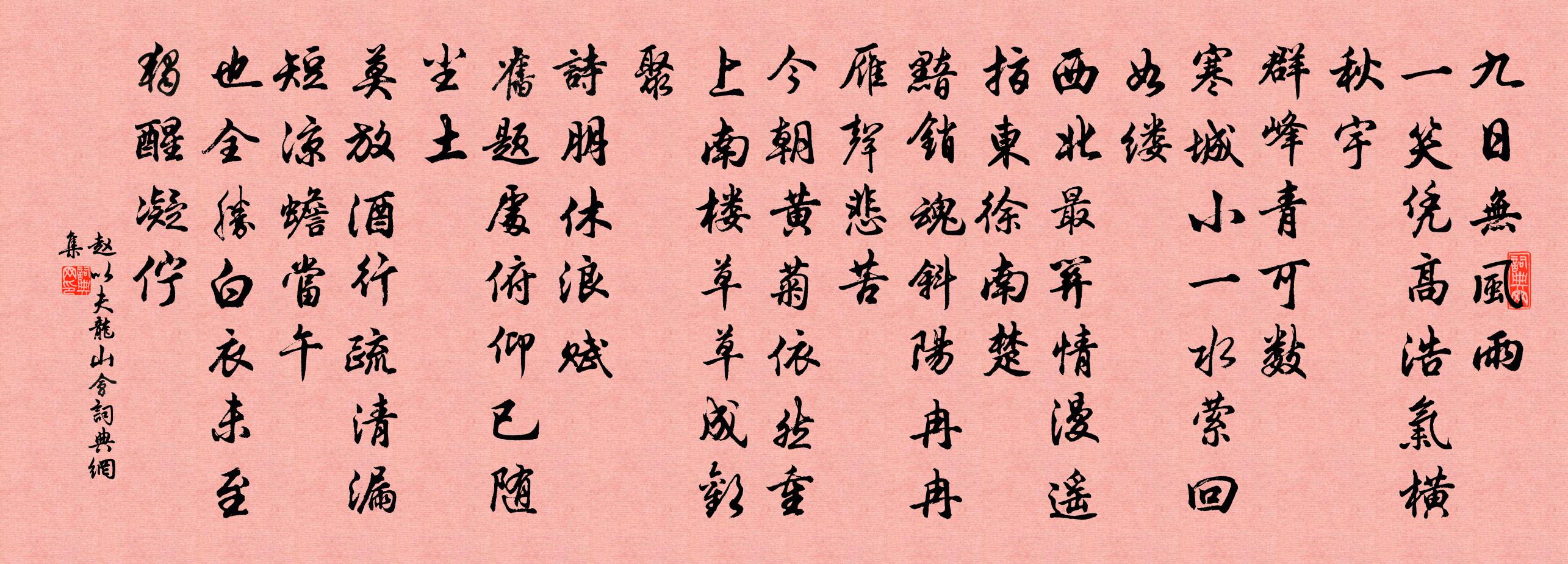 詩詞名句歷史字典書法欣賞書法字典國語詞典說文解字康熙字典古漢語字典標 題 作 者 詩 句 龍山會作者:趙以夫 朝代:宋代龍山會原文九日無風雨。一笑憑高,浩氣橫秋宇。群峰青可數。寒城小、一水縈迴如縷。西北最關情,漫遙指、東徐南楚。黯銷魂,斜陽冉冉,雁聲悲苦。今朝黃1/1菊依然,重上南樓,草草成歡聚。詩朋休浪賦。舊題處、俯仰已隨塵土。莫放酒行疏,清漏短、涼蟾當午。也全勝、白衣未至,獨醒凝佇。詩詞問答問:龍山會的作者是誰?答:趙以夫問:龍山會寫於哪個朝代?答:宋代問:龍山會是什麼體裁?答:詞趙以夫龍山會書法欣賞龍山會書法作品詩詞推薦立秋前九日大雨涼甚陸游〔宋代〕天暑正三伏,雨來俄九秋。寒聲入檐戶,爽氣襲巾褠。山色凝深黛,溪流戰怒蚪。身輕更何苦,處處可閒遊。謁梓潼張惡子廟王鐸〔唐代〕盛唐聖主解青萍,欲振新封濟順名。夜雨龍拋三尺匣,春雲鳳入九重城。劍門喜氣隨雷動,玉壘韶光待賊平。惟報陳文正黃庭帖贊岳珂〔宋代〕隆興聖主臨盛朝,元臣堂堂冠蟬貂。鎮撫百度服天驕,九鼎安固屹莫搖。凜然遺墨松後凋,美錦不裼璞不雕。百年偈頌九十三首釋梵琮〔宋代〕晴明冬至,吉無不利。坐臥經行,焚香掃地。祖師眼睛,衲僧巴鼻。八節四時,各安本位。拂子點頭,懽懽喜喜。劍門讀賈公疏詩石石介〔宋代〕劍門駐馬立踟躕,讀盡新篇味有餘。關令多情兼好事,詩名留得賈公疏。七德舞-美撥亂,陳王業也白居易〔唐代〕七德舞,七德歌,傳自武德至元和。元和小臣白居易,觀舞聽歌知樂意,樂終稽首陳其事。太宗十八舉義兵,白旄通填致政姚君輓詩魏了翁〔宋代〕一生官偪仄,幾處獄平反。夜雨滴歸思,凱風唳淚痕。竟令駒入夢,莫盡桂銷冤。點檢慈恩舊,秋空幾斷魂。赴城南隱居小集楊冠卿〔宋代〕白雨濯青山,孤雲靄余姿。溶溶荒江水,近岸生清漪。扶輿出城府,眷此幽人期。茅茨倚林麓,秀薄相參差。欣茲酬顏仲華釋紹嵩〔宋代〕客子愁無奈,年來鬢已秋。塵埃自袞袞,勳業轉悠悠。島霧沉晴樹,山雞舞畫樓。惠連有新作,一覽病應休。有客陸游〔宋代〕有客隱華山,學道忘歲月。靈苗生絕壁,光景中夜發,斸根食之盡,倏爾換金骨。通籍虎豹閽,日預通明謁,綠章送顏復赴闕蘇轍〔宋代〕簟瓢未改安貧性,鳧繹猶傳直道余。不見失官愁戚戚,但聞高臥起徐徐。居中舊厭軍容講,補外仍遭城旦書。此去本覺寺三過堂王希呂〔宋代〕門外驚風吹細沙,入門水氣湛清華。呼童試向林間看,岩桂應開第二花。畲田詞王禹偁〔宋代〕鼓聲獵獵酒醺醺,斫上高山入亂雲。自種自收還自足,不知堯舜是吾君。錢知縣輓詞葉適〔宋代〕送子三為邑,十年嗟往來。誰言債難了,不與命同回。卓魯終留愛,龔黃豈蔽材。雲愁旦暮雪,雪打又添哀。禪人並化主寫真求贊釋正覺〔宋代〕老發衰髭,頂雪頷絲。方頭似鑿,鈍口如椎。相逢閒受用,慣喫落便宜。蒲鞋價賤陳尊宿,漿水錢還王老師。法不次陝州先寄源從事李商隱〔唐代〕離思羈愁日欲晡,東周西雍此分塗。迴鑾佛寺高多少,望盡黃河一曲無。赤壁賦中四句耳得之而為聲陳普〔宋代〕司聽坎體本來清,舉世都將貯笛箏。飽聽翛翛北窗吹,人間能有幾長庚。山居釋志芝〔宋代〕千峰頂上一間屋,老僧半間雲半間。昨夜雲隨風雨去,回頭方羨老僧閒。清平樂 輟耕錄卷二十八俞俊〔元代〕君恩如草。秋至還枯槁。落落殘星猶弄曉。豪傑消磨盡了。放開湖海襟懷。休教鷗鷺驚猜。我是江南倦客,等閒容武陵春王吉昌〔元代〕水火互交南北位,金木換西東。胎結源流帝旺宮。訊息造真功。一馬驟歸三島外,九曲六牛通。醞就玄珠透體紅。名句推薦竹竿有甘苦,我愛抱苦節。孟郊《苦寒吟》 新秋逢閏,鵲橋重駕,兩度人間乞巧。顧太清《鵲橋仙·雲林矚題閏七夕聯吟圖》 寢興目存形,遺音猶在耳。潘安《悼亡詩三首》 資之深,則取之左右逢其原。孟子《孟子·離婁章句下·第十四節》 冬夜兮陶陶,雨雪兮冥冥。王逸《九思》 洊雷,震;君子以恐懼修省。佚名《易傳·象傳下·震》 君子之交淡若水,小人之交甘若醴。莊子《莊子·外篇·山木》 雉雊麥苗秀,蠶眠桑葉稀。王維《渭川田家》 谷鳥吟晴日,江猿嘯晚風。李白《江夏別宋之悌》 蕭蕭遠樹疏林外,一半秋山帶夕陽。寇準《書河上亭壁》