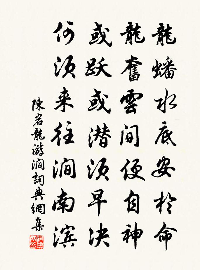 詩詞名句歷史字典書法欣賞書法字典國語詞典說文解字康熙字典古漢語字典標 題 作 者 詩 句 龍游澗作者:陳岩 朝代:宋代龍游澗原文龍蟠水底安於命,龍奮雲間便自神。或躍或潛須早決,何須來往澗南濱。詩詞問答問:龍游澗的作者是誰?答:陳岩問:龍游澗寫於哪個朝代?答:宋代陳岩龍游澗書法欣賞龍游澗書法作品詩詞推薦何秀才郊園五首司馬光〔宋代〕褰裳涉幽澗,日落煙岩空。躊躇待新月,長嘯來清風。梅花引朱雍〔宋代〕梅亭別。梅亭別。梅亭回首都如雪。粉融融。月濛濛。月上小車,歸去小樓空。當時曾傅新妝薄。而今一任花零落求仁復示怨句次韻晁補之〔宋代〕聞說高情久沉寥,縶維誰與永今朝。五車猶累方書好,萬物先從辯說雕。已向季鹹心獨醉,更緣順子意都消。清秋訴衷情 夜思邵亨貞〔元代〕滿城鐘鼓夜初寒。人靜掩重關。驚烏繞庭樹,月已上闌乾。微有興,澹無歡。小盤桓。良宵如許,香冷金猊,夢繞不屈釋文珦〔宋代〕屈身必受制,屈志必違仁。受制已則辱,違仁首則屯。身志兩不辱,度幾德之純。以此率其性,乾坤一閒人。衡陽泊木居士廟下作(一題作題木居士廟)羅隱〔唐代〕烏噪殘陽草滿庭,此中枯木似人形。只應神物長為主,未必浮槎即有靈。八月風波飄不去,四時黍稷薦惟馨。南朝西湖次弟潤之韻劉過〔宋代〕舊說西湖好,春來更一游。林逋山際宅,蘇小水邊樓。行密柳堤鬧,樹多花影稠。天堂從此去,真箇說杭州。觀亡弟同之書札感懷陳長方〔宋代〕處處君書畫,難堪淚雨沱。如何遵養力,不似世緣多。寒食上冢楊萬里〔宋代〕逕直夫何細!橋危可免扶?遠山楓外淡,破屋麥邊孤。宿草春風又,新阡去歲無。梨花自寒食,進節只愁余。登城二首張耒〔宋代〕楚望迷千里,孤城草樹濃。憑臨點衣雨,容易落花風。人事年年改,風光處處同。未能忘出處,徙倚更書空。殘句:牆頭霜下草陳師道〔宋代〕牆頭霜下草,又作一番新。六代祖師贊釋心月〔宋代〕字則不識,宗說俱通。如風吹水,如日行空。破盪箕裘是此翁。寓嘆陸游〔宋代〕老閱市朝久,紛紛長厭看。人紆綬紫艾,家擁轂朱丹,不羨官曹熱,惟憐眼境寒。東塗與西抹,感舊一長嘆。寄樓居朱漕樂雷發〔宋代〕住近江心古寺邊,幅巾應伴浙僧閒。官銜自管金陵觀,冠業多依雁宕山。出處要留青史看,功名且逐白雲還。殷勤見三山翁插山茶花一朵二首蘇泂〔宋代〕故里歸來一幅巾,廟堂誰記此祠臣。卻將筆下黃麻意,自語山中白髮人。送臘曹彥約〔宋代〕謂向年前稍自寬,惱人時序故多端。幾回水落還添浦,百樣天晴卻轉寒。未有梅開供探討,若無酒遣太衰殘。明朝鵲踏枝馮延巳〔唐代〕霜落小園瑤草短,瘦葉和風,惆悵芳時換。懊恨年年秋不管,朦朧如夢空腸斷。獨立荒池斜日岸,牆外遙山,隱隱本立藏主請贊釋智遇〔宋代〕春山萬疊,秋水一痕。凜然風彩,何處求真。大方出沒兮全生全殺,叢林悱悱兮獨角一麟。題故李賓客廬山草堂許彬〔唐代〕難窮林下趣,坐使致君恩。術業行當代,封章動諫垣。已明邪佞跡,幾雪薜蘿冤。報主深知此,憂民詎可論。名將趙季茂遺予郭索侑之以詩予早上亦遣山餚兩介岳珂〔宋代〕驛書傳驛使,江蟹出江湄。目早同暇睅,螯曾與虎持。紫髯卸金甲,赤髓映瓊肌。正是清霜月,相從無厭時。名句推薦壚邊人似月,皓腕凝霜雪。韋莊《菩薩蠻·人人盡說江南好》 僵臥孤村不自哀,尚思為國戍輪台。陸游《十一月四日風雨大作》 青海長雲暗雪山,孤城遙望玉門關。王昌齡《從軍行七首·其四》 不戚戚於貧賤,不汲汲於富貴。陶淵明《五柳先生傳》 風嗥雨嘯,昏見晨趨。鮑照《蕪城賦》 道私者亂,道法者治。韓非及後人《韓非子·詭使》 窮巷多怪,曲學多辯。愚者之笑,智者哀焉;狂夫之樂,賢者喪焉。商鞅《商君書·更法》 一場愁夢酒醒時,斜陽卻照深深院。晏殊《踏莎行·小徑紅稀》 世人結交須黃金,黃金不多交不深。張謂《題長安壁主人》 疏雨池塘見,微風襟袖知。陰陰夏木囀黃鸝賀鑄《南歌子·疏雨池塘見》