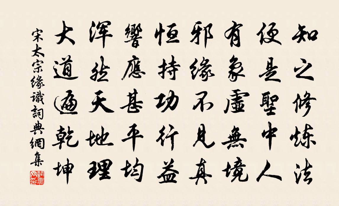 詩詞名句歷史字典書法欣賞書法字典國語詞典說文解字康熙字典古漢語字典標 題 作 者 詩 句 緣識作者:宋太宗 朝代:宋代緣識原文知之修煉法,便是聖中人。有象虛無境,邪緣不見真。恆持功行益,回響甚平均。渾然天地理,大道遍乾坤。詩詞問答問:緣識的作者是誰?答:宋太宗問:緣識寫於哪個朝代?答:宋代宋太宗緣識書法欣賞緣識書法作品詩詞推薦發光林寺李彌遜〔宋代〕朝發光林寺,崎嶇渡復攀。摳衣緣翠濕,側足下蒼頑。急雨欲平澗,斷雲時見山。祗應超勝地,行路未嘗難。游鐘山紫芝觀耿湋〔唐代〕繫舟仙宅下,清磬落春風。雨數芝田長,雲開石路重。古房清磴接,深殿紫煙濃。鶴駕何時去,遊人自不逢。宋中道都官輓辭二首蘇頌〔宋代〕文章微婉氣清遒,議論精通學贍優。方見璠璵為國器,忽經蘭菊隕霜秋。夢中應講陰堂奧,天上須刊白玉樓。聞道題黃司理園王安石〔宋代〕為憶去年梅,凌寒特地來。閏前空臘盡,渾未有花開。南鄉子陳師道〔宋代〕世所謂英英、盼盼者。盼卒,英嫁,而盼之子瑩,頗有家風,而曹妓未有顯者,黃樓不可勝也。作南鄉子以歌之。謁郭馬帥劉過〔宋代〕千金買駿馬,百金市蛾眉。長安酒家樓,揮灑驚人詩。天子不得臣,公卿氣吞之。俯視兒女輩,自詭男子奇。誰知仲春既晴復雨曾豐〔宋代〕東君無力破天慳,紅紫遭時得志難。多可幸然風借暖,少恩傷是雨遺寒。云云無謂鶯情沮,僕僕何之蝶意闌。爛賞陳丞相誕日李洪〔宋代〕壺山和氣儷神崧,間世鍾賢應尹躬。小試經綸安鼎鼐,更恢韜略靖華戎。力陳致主千秋鑒,夢協遐年八十公。不用奉和魯望寒日古人名一絕皮日休〔唐代〕北顧歡游悲沈宋,南徐陵寢嘆齊梁。水邊韶景無窮柳,寒被江淹一半黃。答中書詩謝靈運〔南北朝〕聚散無期。乖仳易端。之子名揚。鄙夫忝官。素質成漆。巾褐懼蘭。遷流推薄。雲胡不嘆。四時白紵歌 冬白紵沈約〔南北朝〕寒閨晝密羅幌垂。婉容麗色心相知。雙去雙還誓不移。長袖拂面為君施。翡翠羣飛飛不息。願在雲間長比翼。佩服送劉戒之東歸陸游〔宋代〕去國三年恨未平,東城況復送君行。難憑魂夢尋言笑,空向除書見姓名。殘日半竿斜谷路,西風萬里玉關情。蘭台水牡丹洪咨夔〔宋代〕魏紫潛緋真正紅,天公不管老東風。紫袍玉帶雙魚掛,猶把闌珊造化功。念衰陳造〔宋代〕心意雕殘底自娛,每臨清鏡笑頭顱。詩從多病難為好,官過中年劣勝無。急景驅秋著髭鬢,歸鴻銜夢下江湖。更應贈廣利大師歌吳融〔唐代〕化人之心固甚難,自化之心更不易。化人可以程限之,自化元須有其志。在心為志者何人,今日得之於廣利。三十嘉定甲戌正月以金部郎分閫東淮正當金虜棄巢崔與之〔宋代〕來到廬山日日陰,斜風細雨亂雲深。移舟夜壑人間世,荷鍤春郊物外心。要把封疆安社稷,誰教軒冕換山林。殷勤游雲門寺宋之問〔唐代〕維舟探靜域,作禮事尊經。投跡一蕭散,為心自杳冥。龕依大禹穴,樓倚少微星。沓嶂圍蘭若,回溪抱竹庭。覺花沁園春(題桃源萬壽宮)葛長庚〔宋代〕黃鶴樓前,吹笛之時,先生朗吟。想劍光飛過,朝游南嶽,墨籃放下,夜醉東鄰。鐺煮山川,粟藏世界,有明月清小遊仙三首曹勛〔宋代〕搖曳空歌上玉清,飛煙冉冉拂仙纓。龍軿已過黃金闕,致肅門郎識姓名。園櫻傷老也司馬光〔宋代〕園有繁櫻,圃有肥菁。我酒既清,我淆既馨。我友戾止,聊以如情。今我不樂,日月其徑。名句推薦霾兩輪兮縶四馬,援玉枹兮擊鳴鼓。屈原《國殤》 霜草蒼蒼蟲切切,村南村北行人絕。白居易《村夜》 詩界千年靡靡風,兵魂銷盡國魂空。梁啓超《讀陸放翁集》 毛羽不豐滿者不可以高飛劉向《戰國策·秦一·蘇秦始將連橫》 映階碧草自春色,隔葉黃鸝空好音。杜甫《蜀相》 洞房昨夜停紅燭,待曉堂前拜舅姑。朱慶餘《近試上張籍水部 / 近試上張水部 / 閨意獻張水部》 眾人皆有以,而我獨頑似鄙。老子《老子·道經·第二十章》 記得去年今夕,釃酒溪亭,淡月雲來去。文徵明《念奴嬌·中秋對月》 蕙風如薰,甘露如醴。左思《三都賦》 江涵秋影雁初飛,與客攜壺上翠微。杜牧《九日齊山登高》