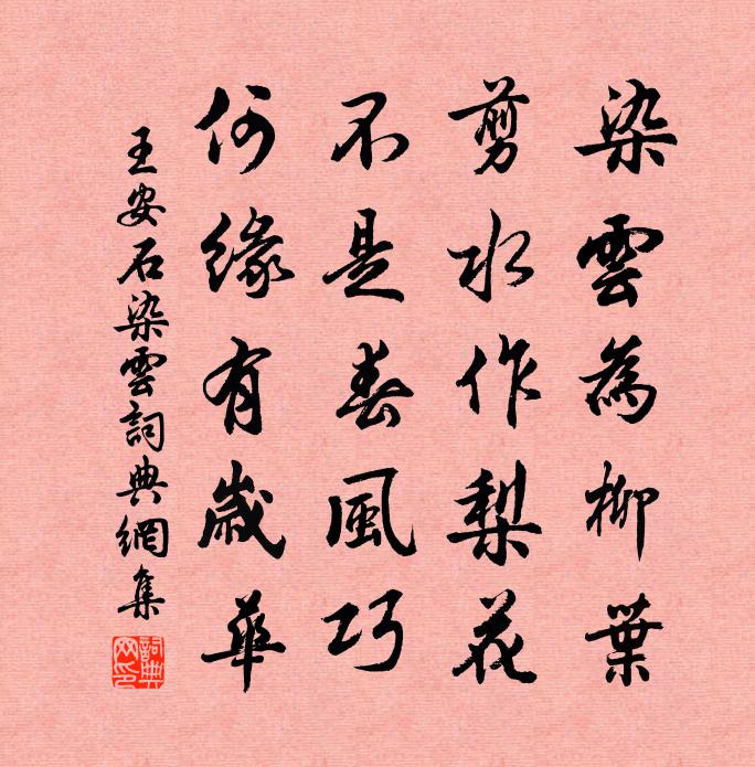 詩詞名句歷史字典書法欣賞書法字典國語詞典說文解字康熙字典古漢語字典標 題 作 者 詩 句 染雲作者:王安石 朝代:宋代染雲原文染云為柳葉,剪水作梨花。不是春風巧,何緣有歲華。詩詞問答問:染雲的作者是誰?答:王安石問:染雲寫於哪個朝代?答:宋代問:王安石的名句有哪些?答:王安石名句大全王安石染雲書法欣賞染雲書法作品詩詞推薦抒懷呈同舍宋祁〔宋代〕本自草茆賤,非貪箕斗名。客心摧似櫓,官謗沸如羹。晝役迴腸數,秋扶病體輕。長年書轉忘,多露涕先橫。已分期秦伯鎮不至蔡襄〔宋代〕高人懷真趣,每欲棄祿仕。超然外造化,那復顧妻子。有田給饑寒,有路出生死。儻得自由身,休隨榮利起。或聞趙丞餉酒蟹獐巴方岳〔宋代〕公子無腸秋滿殼,山吏無魂飽霜籜。寒浦醉骨糟丘台,鳴髇數肋凌煙閣。故人斜封三印紅,秋江已在吾目中。角聲送殷堯藩侍御赴同州姚合〔唐代〕吟詩擲酒船,仙掌白樓前。從事關中貴,主人天下賢。此生無了日,終歲踏離筵。何計因歸去,深山恣意眠。寄獻湖州從叔員外鄭谷〔唐代〕顧渚山邊郡,溪將罨畫通。遠看城郭里,全在水雲中。西閣歸何晚,東吳興未窮。茶香紫筍露,洲回白蘋風。歌緩偈頌一百六十首釋宗杲〔宋代〕針鋒頭上透天關,著意忘懷兩不堪。直下早逾千萬劫,即今成佛未同參。已嘗早稻晚禾得雨亦驟長出城按行阡陌歷諸寺程公許〔宋代〕歡謠千里慶古成,小隊傳呼略按行。雨足陳根重穎木,眼明多稼盡坻京。靈君禪悅屏燔炙,樂歲人和喧送迎。老守次韻樂著作天慶觀醮蘇軾〔宋代〕濁世紛紛肯下臨,夢尋飛步五雲深。無因上到通明殿,只許微聞玉佩音。書孔融傳王令〔宋代〕戲撥虎鬚求不齧,何如縮手神中歸。虛雲坐上客常滿,許下惟聞哭習脂。神君歌十首劉克莊〔宋代〕幽明雖異趣,追遠豈殊哉。隱隱聞簫鼓,神君尚冢回。天申節詩朱翌〔宋代〕南來欣遇千秋節,北向空馳萬里心。永日清風吹古寺,一杯聊見祝堯深。酹江月姬翼〔元代〕初機學道,道無形著腳、如何蹤跡。只在靈源方寸地,體正元初端的。激濁揚清,明真削偽,掃蕩諸邪僻。迷雲消涉夏歸途曾豐〔宋代〕一意貪歸百事忘,其如耳目觸吾旁。女桑醉日多相靡,孫竹驕風半自強。螻蟈無稽言語泛,蜻蜓罔念性情狂。鳲鳩鷓鴣天王寂〔元代〕秋後亭皋木葉稀。霜前關塞雁南歸。曉雲散去山腰瘦,宿雨來時水面肥。吾老矣,久忘機。沙鷗相對不驚飛。柳溪歸園田居 其二陶淵明〔魏晉〕野外罕人事,窮巷寡輪鞅。白日掩荊扉,虛室絕塵想。時復墟曲中,披草共來往。相見無雜言,但道桑麻長。桑麻和提刑千葉梅韓維〔宋代〕擢玉自成超俗格,施朱不學入時妝。莫將羅幕輕遮護,從放樽前自在香。水仙花二首徐似道〔宋代〕天然初不事鉛華,此是無塵有韻花。翠帶詎容縈俗客,金杯祗合勸詩家。柘皋短吟陳造〔宋代〕鐵山橫飛截平野,寧復江流飲胡馬。大酋膽落狐鼠逃,虎頭將軍自天下。拂廬連絡屯長雲,提戈敢謂秦無人。驚霆卯醉口號賀鑄〔宋代〕丙寅元佑初年冬,賀老困寓京塵中。無心炙手權門熱,曝背晴陽坐屋東。禪人並化主寫真求贊釋正覺〔宋代〕這個形容,緣報遭逢。藏萬德於未兆,戢六用於無蹤。雪陣血戰,玉田歷農。影響若空谷,隨扣如霜鍾。竿頭不是名句推薦太平本是將軍定,不許將軍見太平。施耐庵《水滸傳·第一百一十四回》 以卵投石也。盡天下之卵,其石猶是也,不可毀也墨子《墨子·47章 貴義》 此際閒愁郎不共,月移窗罅春寒重。王士禎《蝶戀花·和漱玉詞》 誰家玉笛暗飛聲,散入春風滿洛城。李白《春夜洛城聞笛 / 春夜洛陽城聞笛》 紅葉黃花秋意晚,千里念行客。晏幾道《思遠人·紅葉黃花秋意晚》 鑒懸日月,辭富山海。百齡影徂,千載心在。劉勰《文心雕龍·徵聖》 湖光秋月兩相和,潭面無風鏡未磨。劉禹錫《望洞庭》 至樂無樂,至譽無譽。莊子《莊子·外篇·至樂》 有桃花紅,李花白,菜花黃。秦觀《行香子·樹繞村莊》 君看石芒碭,掩淚悲千古李白《丁督護歌》