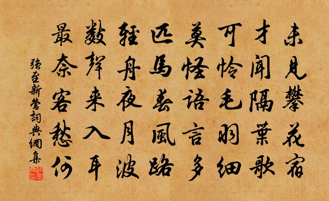 詩詞名句歷史字典書法欣賞書法字典國語詞典說文解字康熙字典古漢語字典標 題 作 者 詩 句 新鶯作者:強至 朝代:宋代新鶯原文未見攀花宿,才聞隔葉歌。可憐毛羽細,莫怪語言多。匹馬春風路,輕舟夜月波。數聲來入耳,最奈客愁何。詩詞問答問:新鶯的作者是誰?答:強至問:新鶯寫於哪個朝代?答:宋代強至新鶯書法欣賞新鶯書法作品詩詞推薦句釋希晝〔宋代〕風泉舊聽僧窗改,雲穴曾行鳥徑殘。西湖二詠 食雞頭蘇轍〔宋代〕芡葉初生縐如谷,南風吹開輪脫轂。紫苞青刺攢蝟毛,水面放花波底熟。森然赤手初莫近,誰料明珠藏滿腹。剖開菩薩蠻陳師道〔宋代〕銀潢清淺填烏鵲。畫檐急雨長河落。初月未成圓。明星惜此筵。愁來無斷絕。歲歲年年別。不用淚紅滋。年年歲歲琴歌趙摶〔唐代〕綠琴制自桐孫枝,十年窗下無人知。清聲不與眾樂雜,所以屈受塵埃欺。七弦脆斷蟲絲朽,辨別不曾逢好手。琴聲蝶戀花佚名〔宋代〕環取其終始不絕。兼致彩絲一絇,文竹茶合碾子一枚。此數物不足見珍,意者欲君子如玉之潔,鄙志如環不解。淚禪人寫真求贊釋正覺〔宋代〕看看靜,見其端。星河斗濕,月窟蟾寒。體無稜縫,用絕痕瘢。不須喝彩還贏也,已見雙雙六在盤。頌古一○一首釋子淳〔宋代〕無相光中未兆身,清虛渺邈豈為鄰。一輪明月當軒照,玉殿蕭蕭不見人。送人赴廬陵尉劉克莊〔宋代〕聞說江西路,而今不宿師。省民來著業,少府去吟詩。夜月營門鼓,春風射圃旗。雖然溪峒事,閒暇要先知。梅花喜神譜就實六枝宋伯仁〔宋代〕品字列輕舠,占盡吳江雪。丁寧紅蓼花,莫與利名說。元微之除浙東觀察使,喜得杭越鄰州,先贈長白居易〔唐代〕稽山鏡水歡游地,犀帶金章榮貴身。官職比君雖校小,封疆與我且為鄰。郡樓對玩千峰月,江界平分兩岸春。杭越富平少候李商隱〔唐代〕七國三邊未到憂,十三身襲富平候。不收金彈拋林外,卻惜銀床在井頭。彩樹轉燈珠錯落,繡檀回枕玉雕鎪。當關贈樂軒彭善之文天祥〔宋代〕吾家小黃溪,其間石甚巨。可寫歸來辭,可刻盤谷序。晉唐文章手,誰敢以自負。異時此重來,煩君作玉籌。牽牛織女文同〔宋代〕桂陽有仙人,姓成名武丁。朝為墮人世,人惟識其形。一日文其弟,吾將返青冥。乃曰此七夕,上天呼群靈。織女送李校書赴吉期賈島〔唐代〕筮算重重吉,良期詎可遷。不同牛女夜,是配鳳凰年。佩玉春風裡,題章蠟燭前。詩書與箴訓,夫哲又妻賢。烏墩密印大師仁公真贊釋正覺〔宋代〕唇口能緘,眉目如笑。應外而沖,虛中而照。全身放下是全身,一點獨靈常了了。題鄞江舒坦〔宋代〕地吞越絕海分深,渺渺平流萬馬駸。早晚渡船潮有信,往來鷗鳥客無心。寒空倒影千山動,暖日澄波萬籟沈。安用魚溝懷家晁補之〔宋代〕生涯身事任東西,藥笥書囊偶自賚。柳嫩桑柔鴉欲乳,雪消冰動麥初齊。沙頭晚日檣竿直,淮上春風雁鶩低。歸去送錢文季僉判楊萬里〔宋代〕東海珠胎清廟珍,壁水季孝第一人。胡為俯首蓮泛淥,如有用我試治民。古來幕中要婉畫,君乃不肯作此客。囊篋和丘斯行牧牛頌劉子翬〔宋代〕軟草豐苗任滿前,蒼然觳觫臥寒煙。直饒牧得渾純熟,痛處還應著一鞭。元夕同次道中道平叔如晦賦詩得閒字梅堯臣〔宋代〕金輿在閶闔,簫吹滿人寰。九陌行如晝,千門夜不關。星通河漢上,珠亂里閭間。誰與聯輕騎,宵長月正閒。名句推薦淚濕羅巾夢不成,夜深前殿按歌聲。白居易《後宮詞》 楚鄉飛鳥沒,獨與碧雲還。錢起《送夏侯審校書東歸》 別院深深夏席清,石榴開遍透簾明。蘇舜欽《夏意》 燕子不知人去也,飛認闌乾。韓疁《浪淘沙·莫上玉樓看》 不是誠齋無月,隔一林修竹。楊萬里《好事近·七月十三日夜登萬花川谷望月作》 處世讓一步為高,退步即進步的張本洪應明《菜根譚·概論》 力拔山兮氣蓋世。時不利兮騅不逝。項羽《垓下歌》 等閒老去年華促。只有江梅伴幽獨。孫道絢《滴滴金·梅》 湖水無端浸白雲,故人書斷孤鴻沒。黃庭堅《秋懷二首》 漢寢唐陵無麥飯,山溪野徑有梨花。趙鼎《寒食》