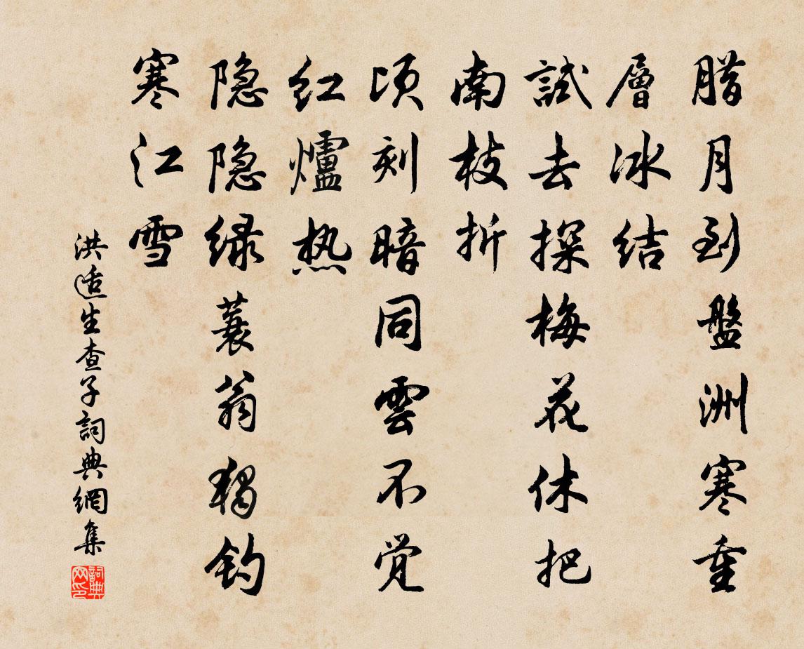 詩詞名句歷史字典書法欣賞書法字典國語詞典說文解字康熙字典古漢語字典標 題 作 者 詩 句 生查子作者:洪适 朝代:宋代生查子原文臘月到盤洲,寒重層冰結。試去探梅花,休把南枝折。頃刻暗同雲,不覺紅爐熱。隱隱綠蓑翁,獨釣寒江雪。詩詞問答問:生查子的作者是誰?答:洪适問:生查子寫於哪個朝代?答:宋代問:生查子是什麼體裁?答:詞洪适生查子書法欣賞生查子書法作品詩詞推薦呈嚴造道主簿趙蕃〔宋代〕漫刺不待投,數面自成親。對言或無味,況乃詩筒新。佳處在阿堵,小異果此君。我行蕭灘上,所食楊與陳。百藥山村問宿吳錫疇〔宋代〕問宿山村里,人煙斷復連。高峰明落日,危石響幽泉。世事雙眉上,年華兩鬢邊。滄洲森萬玉,飛夢月娟娟。達磨贊釋崇岳〔宋代〕一葦渡江,無處埋藏。分皮分髓,瞞神謼鬼。忙忙直向西歸,不知失卻只履。雨後張嵲〔宋代〕一雨稻畦春水足,苦遭鳴蟈故相喧。不妨信馬東城路,行看林花落古原。河瀆神張泌〔唐代〕古樹噪寒鴉,滿庭楓葉蘆花。晝燈當午隔輕紗,畫閣珠簾影斜。門外往來祈賽客,翩翩帆落天涯。回首隔江煙火,木蘭花/玉樓春佚名〔宋代〕東風昨夜歸來後。景物便為春意候。金絲齊奏喜新春,願介香醪千歲壽。尋花插破桃枝臭。造化工夫先到柳。熔酥客長沙邢園堂下梅花一萼先開有懷成父斯遠二趙蕃〔宋代〕老樹發青枝,晴多雨亦奇。一花夸獨破,病眼得先窺。又作殊方見,還成寄遠詩。不知閩與淛,何處念乖離。方氏故居邵亢〔宋代〕偶分魚竹到稽山,處士林泉一望間。歲月自隨流水遠,姓名長與白雲閒。鑒中人去荒遺蹟,溪口僧來寫舊顏。何日送運判朱朝奉入蜀七首蘇軾〔宋代〕藹藹青城雲,娟娟峨眉月。隨我西北來,照我光不滅。我在塵土中,白雲呼我歸。我游江湖上,明月濕我衣。岷峨十二時/憶少年佚名〔宋代〕臨寰宇,恭已岩廊。屬意在耕桑。愛民利物,德邁陶唐。躋俗盡淳龐。開千畝、帝籍神倉。舉彝章。祗祓壇場。為伏暑日唯食粥一甌盡屏人事頗逍遙效皮陸體張耒〔宋代〕烈日炎風鼓大爐,藤床瓦枕開門居。屏書居士持齋日,掛壁禪僧問法圖。鄰汲滿攜泉似乳,新舂旋糴米如珠。飽餐大衍易吟四十首方回〔宋代〕謙卑六位得,豫樂四爻非。莊敬與安肆,冥冥禍福幾。塞上司馬光〔宋代〕瀚海秋風至,蕭蕭木葉飛。如何逢漢使,猶未寄征衣。不嘆千里遠,難甘一信稀。年年沙漠雁,隨意得南歸。南鄉子 原誤作行香子 見金蓮正宗仙源像傳譚處端〔元代〕交泰一聲雷。迸出靈光萬道輝。尤遇迅雷重脫殼,幽微。射出金光透頂飛。一性赴瑤池,得與丹陽相從隨。顯現長約客陶夢桂〔宋代〕家在青山綠水間,柴門雖設亦常關。稠花浪蕊隨時有,樂事賞心從古慳。世上人多為物役,眼前誰肯掣身還。君能頌古二首釋曇密〔宋代〕汲水僧歸林下寺,待船人立渡頭沙。澄江渺渺煙波窄,雲靜一天星斗斜。次韻謝喻岩叟讀予近作二首方回〔宋代〕觀君於勢利,如箒掃絲窠。閱世雲翻雨,持心濟貫河。端居冠必整,閒賦硯頻磨。我豈無新作,何堪對雅歌。題崇慶寺壁溫憲〔唐代〕十口溝隍待一身,半年千里絕音塵。鬢毛如雪心如死,猶作長安下第人。江上二首張耒〔宋代〕相別亦何事,相逢盡偶然。愁腸貫彩筆,離夢繞朱弦。北嶽降香呈嚴學士汪元量〔宋代〕萬里溟濛起戰埃,翩翩勒馬出金台。同君遠使山頭去,如朕親行岳頂來。野廟橫斜挨老樹,古碑顛倒枕荒苔。瞻天名句推薦別有根芽,不是人間富貴花。納蘭性德《採桑子·塞上詠雪花》 人胸中各有個聖人,只自信不及,都自埋倒了。王陽明《傳習錄·卷下·門人陳九川錄》 善用兵者不以短擊長,而以長擊短。司馬遷《史記·淮陰侯列傳》 幾時能命駕,對酒落花前。賈島《清明日園林寄友人》 幾多情,無處說,落花飛絮清明節。魏承班《漁歌子·柳如眉》 慎在於畏小;智在於治大尉繚《尉繚子·十二陵》 南朝千古傷心事,猶唱後庭花。吳激《人月圓·南朝千古傷心事》 宣父猶能畏後生,丈夫未可輕年少。李白《上李邕》 人之情多矯,世之俗多偽,豈可信乎?來俊臣《羅織經·閱人卷第一》 萬里鄉為夢,三邊月作愁。岑參《送人赴安西》