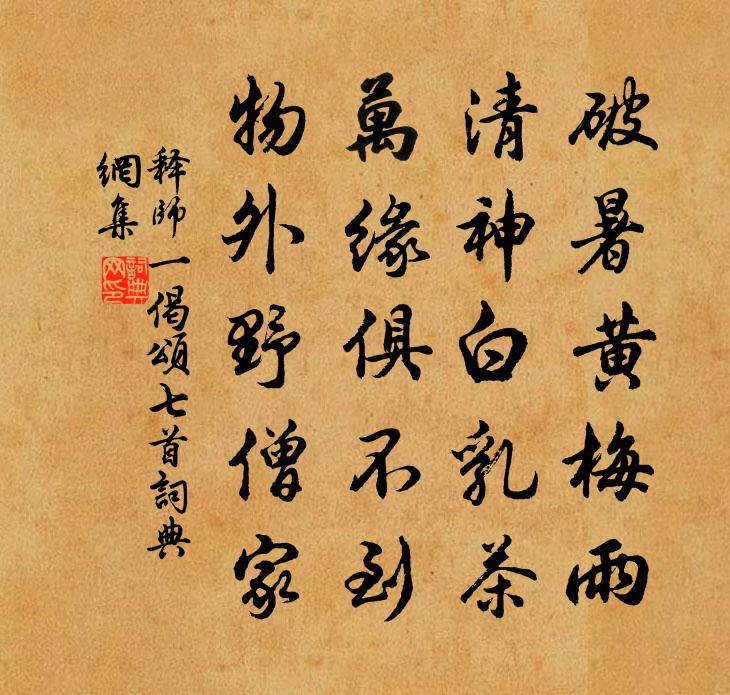 詩詞名句歷史字典書法欣賞書法字典國語詞典說文解字康熙字典古漢語字典標 題 作 者 詩 句 偈頌七首作者:釋師一 朝代:宋代偈頌七首原文破暑黃梅雨,清神白乳茶。萬緣俱不到,物外野僧家。詩詞問答問:偈頌七首的作者是誰?答:釋師一問:偈頌七首寫於哪個朝代?答:宋代釋師一偈頌七首書法欣賞偈頌七首書法作品詩詞推薦風流子蔡伸〔宋代〕韶華驚晼晚,青春老、倦客惜年芳。庭樾蔭濃,半藏鶯語,畹蘭花減,時有蜂忙。粉牆低,嫩嵐滋翠葆,零露濕殘自延安回道中作晁說之〔宋代〕延州紅勝洛州花,打剝工夫阿那家。我亦勞心添病骨,悔將黃卷負年華。次韻虞退夫除夕七絕句魏了翁〔宋代〕雲外銜山日半環,傳杯共惜片雲懽。莫疑來日是來歲,萬古光陰只么看。和同年張唐英懷弟晉英韻二首袁說友〔宋代〕舊學知何補,丹心早已平。過從欣故侶,慨慕熟英聲。笑洽愁腸釋,詩來俗眼清。君家好兄弟,何愧洛中程。慈恩寺塔下避暑劉得仁〔唐代〕古松凌巨塔,修竹映空廊。竟日聞虛籟,深山只此涼。僧真生我靜,水淡發茶香。坐久東樓望,鐘聲振夕陽。代李居士謁王去非制乾三首劉宰〔宋代〕家山目斷古幽州,百口來歸路阻修。丁字無端輕介胃,蟬冠卻羨出兜鍪。箕裘忍墜先人業,甔石誰客子謀。不惜飢陳丞以南安寨上所得二詩及到龍泉聞余戍地最趙蕃〔宋代〕郴州何許是,山遠水仍多。江徼重重柵,田夫戶戶戈。雷同嗟不早,嘆我亦奔波。未必甘如此,而今敢謂何。與社友定花朝之約胡仲弓〔宋代〕花朝曾有約,來此定詩盟。隱几江湖夢,閉門風雨情。身名千載共,心事一般清。且盡吟樽樂,徂徠不用賡。越州歌二十首汪元量〔宋代〕秋風吹雨暗天涯,越鳥巢翻何以家。嶺上萬松都斫盡,西湖新路欲排叉。送朱典卿履常參學王邁〔宋代〕文章久矣乏正氣,作者付誰傳位置。天庠晚乃得朱君,鍾呂一鳴康瓠棄。君看今歲大廷魁,一種風骨何尪羸。吾曹次韻郎中弟見寄李彌遜〔宋代〕病著先地首丘地,林松已約野僧栽。它年地下從諸老,何必人間詠八哀。朝中措·蜀弦秦柱不關情納蘭性德〔清代〕蜀弦秦柱不關情,盡日掩雲屏。已惜輕翎退粉,更嫌弱絮為萍。東風多事,余寒吹散,烘暖微酲。看盡一簾紅雨,久旱喜雨韓維〔宋代〕炎風駕京塵,久旱氛祲惡。義和鞭日車,光焰赫飛躍。群生困熬暴,嘉俗坐焦灼。高堂袒褐臥,汗下如鞭索。安知答泉州薛播使君重陽日贈酒李嘉祐〔唐代〕欲強登高無力去,籬邊 * 為誰開。共知不是潯陽郡,那得王弘送酒來。初春陸游〔宋代〕裝罷桃符又剪燈,新年光景捷飛騰。老翁掃盡兒童事,卻學禪床入定僧。版築求賢圖唐寅〔明代〕聖主求賢按畫圖,頃將天秩界胥徙。精神不是能玄會,顏色安知非濫竽。代壽德興尹陳普〔宋代〕堯冥五葉開元正,堯雲五色輝紫清。漁歌樵唱樂寬政,今日公堂彌兕觥。江南春稚寒猶峭,東風先綠銀峰草。銀峰和李文思早秋五首邵雍〔宋代〕一雨洗觚稜,三川氣象清。林風傳顥氣,木葉送商聲。忽忽蓮生的,看看菊吐英。太平時里老,何以報虛生。閒齋臥病(雨)行藥至山館稍次湖亭二首常建〔唐代〕(一)旬時結陰霖,簾外初白日。齋沐清病容,心魂畏虛室。閒梅照前戶,明鏡悲舊質。同袍四五人,何不來問疾荷池追涼白玉蟾〔宋代〕清曉無人知此涼,岸巾植杖立銀塘。晴霞燒眼收將斂,荷葉生風綠水香。名句推薦凡學之道,嚴師為難。戴聖《禮記·學記》 秋草六朝寒,花雨空壇。更無人處一憑闌。朱彝尊《賣花聲·雨花台》 高岸為谷,深谷為陵。佚名《十月之交》 明月照積雪,朔風勁且哀。謝靈運《歲暮》 應是夜寒凝。惱得梅花睡不成。黃升《南鄉子·冬夜》 相識滿天下,知心能幾人?佚名《增廣賢文·上集》 記得綠羅裙,處處憐芳草。賀鑄《綠羅裙·東風柳陌長》 回雁峰前路,煙樹正蒼蒼葛長庚《水調歌頭·江上春山遠》 函車之獸,離山必斃;絕波之鱗,宕流則枯。沈約《宋書·列傳·卷七十》 非澹薄無以明德,非寧靜無以致遠,非寬大無以兼覆,非慈厚無以懷眾,非平正無以制斷。劉安及其門客《淮南子·主術訓》