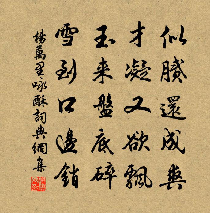 詩詞名句歷史字典書法欣賞書法字典國語詞典說文解字康熙字典古漢語字典標 題 作 者 詩 句 詠酥作者:楊萬里 朝代:宋代詠酥原文似膩還成爽,才凝又欲飄。玉來盤底碎,雪到口邊銷。詩詞問答問:詠酥的作者是誰?答:楊萬里問:詠酥寫於哪個朝代?答:宋代問:楊萬里的名句有哪些?答:楊萬里名句大全楊萬里詠酥書法欣賞詠酥書法作品詩詞推薦贈隱逸韓偓〔唐代〕靜景須教靜者尋,清狂何必在山陰。蜂穿窗紙塵侵硯,鳥斗庭花露滴琴。莫笑亂離方解印,猶勝顛蹶未抽簪。築金病中黃庚〔宋代〕讀易窗閒久,多時不點朱。硯乾蟾渴水,篋破蠹侵書。氣味如僧淡。形容似鶴癯。交遊空滿眼,誰念病相如。初別子由蘇軾〔宋代〕我少知子由,天資和而清。好學老益堅,表里漸融明。豈獨為吾弟,要是賢友生。不見六七年,微言誰與賡。常恐菩薩蠻(梅)謝薖〔宋代〕相思一夜庭花發。窗前忽認生塵襪。曉起艷寒妝。雪肌生暗香。佳人縴手摘。手與花同色。插鬢有誰宜。惟應潘玉貧病陳藻〔宋代〕正圖奔走救寒飢,喘嗽那堪力已疲。意是無錢休買藥,情知有命不求醫。舊恩莫報空懷念,新識相逢淡更宜。多少和方時父立春劉克莊〔宋代〕茶梅有意如相伴,梨棗無根未易栽。稍喜凍逢春漸解,不堪老挾病俱來。久扃北戶寒稀出,已落南枝暖再開。忘卻紹古辭鮑照〔南北朝〕開黛覩容顏。臨鏡訪遙塗。君子事河源。彌祀闕還書。春風掃地起。飛塵生綺疏。文袿為誰設。羅帳空卷舒。不怨句孟安序〔宋代〕扁舟卻下五溪水,勝地重遊八跡壇。汴河孔武仲〔宋代〕滎渠斜與昆河接,河遠渠慳幾可涉。狂霖一漲高十尋,迅瀉東來比三峽。崩騰下與淮泗會,清泚亦容伊雒雜。橫空次韻趙克勤吏部六首劉克莊〔宋代〕籬邊雪畔影橫斜,應訝何鄉太瘦些。未可被渠瞞老眼,玉堂茅舍一般花。勘書孫僅〔宋代〕儒家無外事,招客勘青編。筆墨東西置,朱黃次第研。頻憂傷點竄,細恐誤流傳。改易文辭正,增加字數全。目因奉和聖制天長節賜宰臣歌應制王維〔唐代〕太陽升兮照萬方,開閶闔兮臨玉堂,儼冕旒兮垂衣裳。金天淨兮麗三光,彤庭曙兮延八荒。德合天兮禮神遍,靈芝菩薩蠻曹勛〔宋代〕雨昏連夜催炎暑。暑炎催夜連昏雨。長簟水波涼。涼波水簟長。翠鬟雙倚醉。醉倚雙鬟翠。香枕印紅妝。妝紅印枕燈夕懷廣蜀舊事范成大〔宋代〕灕水橋西列炬香,少城樓下變燈忙。兒嬉萬里客程遠,老懶一龕春夢長。桃源憶故人宋先生〔宋代〕自從師指天機道。萬卷仙經都曉。若會連精歸腦。顏貌長不老。真鉛真汞人知少。烏兔烹煎成寶。身外有身方了。梅雨梅堯臣〔宋代〕三日雨不止,蚯蚓上我堂。濕菌生枯籬,潤氣醭素裳。東池蝦蟆兒,無限相跳梁。野草侵花圃,忽與欄乾長。門前頌古一百則釋正覺〔宋代〕巍巍堂堂,磊磊落落。鬧處刺頭,穩處下腳。腳下線斷我自由,鼻端泥盡君休斲。莫動著,千年故紙中合藥。夜哭李夷道白居易〔唐代〕逝者絕影響,空庭朝復昏。家人哀臨畢,夜鎖壽堂門。無妻無子何人葬?空見銘旌向月翻。偈頌十首釋如淨〔宋代〕深山岩崖問,石頭大小答。崖崩石迸裂,虛空鬧聒聒。送劉大著赴任益州司理魏野〔宋代〕金口親除向錦川,一般監郡最榮遷。從來才已欺鸚鵡,此去冤應雪杜鵑。迎接僧攜筇竹杖,歌謠民寫浣花箋。移風名句推薦小軒獨坐相思處,情緒好無聊。石孝友《眼兒媚·愁雲淡淡雨瀟瀟》 又說今夕天津,西畔重歡遇。吳文英《荔枝香近·七夕》 不是一番寒徹骨,怎得梅花撲鼻香!馮夢龍《醒世恆言·卷十七》 與人不求備,檢身若不及佚名《尚書·商書·伊訓》 紅豆生南國,春來發幾枝。王維《相思》 莫莫高山,深谷逶迤佚名《紫芝歌》 澗影見松竹,潭香聞芰荷。孟浩然《夏日浮舟過陳大水亭 / 浮舟過滕逸人別業》 碧艾香蒲處處忙。誰家兒共女,慶端陽。舒頔《小重山·端午》 柳葉隨歌皺,梨花與淚傾。黃庭堅《南歌子·槐綠低窗暗》 碧雲天,黃葉地,秋色連波,波上寒煙翠。范仲淹《蘇幕遮·懷舊》