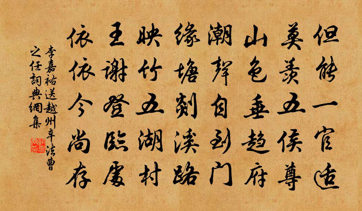 詩詞名句歷史字典書法欣賞書法字典國語詞典說文解字康熙字典古漢語字典標 題 作 者 詩 句 送越州辛法曹之任作者:李嘉祐 朝代:唐代送越州辛法曹之任原文但能一官適,莫羨五侯尊。山色垂趨府,潮聲自到門。緣塘剡溪路,映竹五湖村。王謝登臨處,依依今尚存。詩詞問答問:送越州辛法曹之任的作者是誰?答:李嘉祐問:送越州辛法曹之任寫於哪個朝代?答:唐代李嘉祐送越州辛法曹之任書法欣賞送越州辛法曹之任書法作品注釋全唐詩:卷206_41詩詞推薦洞仙歌謝懋〔宋代〕愁邊雨細。漠漠天如醉。搖揚遊絲晚風外。釀輕寒、和暝色,花柳難勝,春自老,誰管啼紅斂翠。關情潛入夜,斜憶具區錢昭度〔宋代〕平生愛具區,島嶼夾陂湖。竹雨籠鸂鶒,花煙濕鷓鴣。神仙疑有宅,魚鱉自為都。何事勞長想,機雲本是吳。再次送芻父韻寄之二首蘇泂〔宋代〕當時馬首東,追送苦匆匆。對我藕花雨,思君榕葉風。畏途迷白黑,醉眼眩青紅。曷日歸相問,江湖一釣翁。全州雙松堂黃庭堅〔宋代〕文殊堂下松,永日如鳴琴。我登雙松堂,時步雙松陰。中有寂莫人,安禪無古今。浪淘沙(中秋雨)蕭漢傑〔宋代〕愁似晚天雲。醉亦無憑。秋光此夕屬何人。貧得今年無月看,留滯江城。夜起候檐聲。似雨還晴。舊家誰信此時情村舍陸游〔宋代〕露草乾時兒牧羊,朝日出時女採桑。一床絮被千萬足,不解城中有許忙。按部留小詩命男明復同賦郭印〔宋代〕地涉雲安境,山居燕子龕。簾垂看急溜,蓋偃得修楠。牢落前賢跡,光明古佛庵。幽禽知客至,一一解玄談。秋趙希逢〔宋代〕千林搖落竅號風,怒激秋濤氣勢雄。遠水兼天拖練白,曉風委地染丹紅。木闌花慢 蘇昌齡過曹雲翁貞溪故居,賦詞致邵亨貞〔元代〕訪溪翁隱處,渾不減、輞川西。指花下吟袖,松間晝壁,名筆交題。經行向來坊陌,藹茂林、修竹與雲齊。丹*遺寄龔漕六首吳芾〔宋代〕貢院門前並北湖,有田百畝卻荒蕪。願君種取花千樹,付與邦人作畫圖。廳前柏蘇轍〔宋代〕穉柏如嬰兒,冉冉三尺長。移根出澗石,植乾對華堂。重露恣膏沐,清風時抑揚。我老不耐寒,憐汝堪風霜。朝夕憶秦娥蔡伸〔宋代〕花陰月。蘭堂夜宴神仙客。神仙客。江梅標韻,海棠顏色。良辰佳會誠難得。花前一醉君休惜。君休惜。楚台雲雨湯惠院以五言定交用韻以謝胡仲弓〔宋代〕阿邕才識面,轉盼便回春。藥籠還君富,詩囊笑我貧。學遵東魯訓,句逼晚唐人。五字論交意,吟邊憶李頻。致仕歸東里晁說之〔宋代〕板令懸車欠四年,散關如砥去欣然。鄭州門首人爭入,誰伴山翁老洧淵。偈傾一百六十九首釋智朋〔宋代〕一燈分燈燈無盡,一處明處處齊透。鬧浩浩中一法不捨,靜悄悄處一塵不受。燈明如來,一場漏逗。感事游酢〔宋代〕世事浮雲薄,勞生一夢長。散材依櫟社,幽意慕濠梁。風急鷹鸇迅,霜淺草木黃。投閒如有約,早晚問耕桑。送荷渚歸越趙汝績〔宋代〕湘湖蓴線正宜羹,一舸濤江泛曉晴。屋破不妨從客借,田荒自欲課奴耕。不隨不激真吾事,乍佞乍賢皆世情。從此絕句·書當快意讀易盡陳師道〔宋代〕書當快意讀易盡,客有可人期不來。世事相違每如此,好懷百歲幾回開。乙巳九月登冶城作王安石〔宋代〕欲望鍾山岑,因知冶城路。躋攀隱木杪,稍記曾游處。紅沉渚上日,蒼起榛中霧。即事有哀傷,山川自如故。高樓曲范成大〔宋代〕歲暮天涯客,黃昏蝙蝠飛。高樓人不到,小雨怯單衣。名句推薦綠葉陰濃,遍池亭水閣,偏趁涼多。元好問《驟雨打新荷》 榮螈,蜥蜴。佚名《爾雅·釋魚》 觀人以言,美於黼黻、文章荀子《荀子·非相》 一杯酒,問何似,身後名?辛棄疾《水調歌頭·壬子三山被召陳端仁給事飲餞席上作》 楊柳散和風,青山澹吾慮。韋應物《東郊》 日射人間五色芝,鴛鴦宮瓦碧參差。元好問《浣溪沙·日射人間五色芝》 蘇小門前柳萬條,毿毿金線拂平橋。溫庭筠《楊柳八首·其三》 冰簟銀床夢不成,碧天如水夜雲輕。溫庭筠《瑤瑟怨》 安得千尋橫鐵鎖,截斷煙津。陸游《浪淘沙·丹陽浮玉亭席上作》 當路誰相假,知音世所稀孟浩然《留別王侍御維/留別王維》