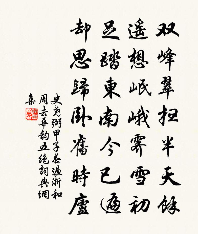 詩詞名句歷史字典書法欣賞書法字典國語詞典說文解字康熙字典古漢語字典標 題 作 者 詩 句 甲子春過浙和周去華韻五絕作者:史堯弼 朝代:宋代甲子春過浙和周去華韻五絕原文雙峰翠掃半天餘,遙想岷峨霽雪初。足踏東南今已遍,卻思歸臥舊時廬。詩詞問答問:甲子春過浙和周去華韻五絕的作者是誰?答:史堯弼問:甲子春過浙和周去華韻五絕寫於哪個朝代?答:宋代史堯弼甲子春過浙和周去華韻五絕書法欣賞甲子春過浙和周去華韻五絕書法作品詩詞推薦長相思·村姑兒蔡伸〔宋代〕村姑兒。紅袖衣。初發黃梅插稻時。雙雙女伴隨。長歌詩。短歌詩。歌里真情恨別離。休言伊不知。次韻學士重陽雪中見招不赴前後十六首洪皓〔宋代〕二君氣概繼雷陳,九日喔詩妙入神。季友凌霄方草賦,孟公驚坐正延賓。難陪鳳嶺登高宴,且放牛山出涕辛。獨臥詠雪詩徐陵〔南北朝〕瓊林玄圃葉。桂樹日南華。豈若天庭瑞。輕雪帶風斜。三晨喜盈尺。六出儛崇花。明朝闕門外。應見海神車。青玉案史達祖〔宋代〕蕙花老盡離騷句。綠染遍、江頭樹。日午酒消聽驟雨。青榆錢小,碧苔錢古。難買東君住。官河不礙遺鞭路。被芳甲辰仲冬八日元衡攜兩詩過訪及歸次韻酬送後張鎡〔宋代〕每針幽事當功名,唯欠能詩竹里僧。逕寫此篇為疏引,庵成來往豈無憑。和安汝功采紫竹杖篇劉子翬〔宋代〕赤藤表珍奇,桃竹寄吟玩。高情在丘壑,微物懷深睠。徽工匝遠林,彌山選一乾。雲根傍岸蹙,椹色涵霜變。匪憑虞美人(辰州上元)王庭珪〔宋代〕城東樓閣連雲起。冠絕辰州市。蓮燈初發萬枝紅。也似江南風景、半天中。花衢柳陌年時靜。劃地今年盛。棚前簫小重山黃子行〔宋代〕一點斜陽紅欲滴。白鷗飛不盡,楚天碧。漁歌聲斷晚風急。攪蘆花,飛雪滿林濕。孤館百憂集。家山千里遠,夢難偈傾一百六十九首釋智朋〔宋代〕造化寒暑,有來有往,衲僧火爐,有開有閉。寒暑往來,火爐開閉。非實非虛,非如非異。自遣四首張耒〔宋代〕誰雲至理宗無相,大道由來萬法兼。且以聲音為佛事,曉敲清磬誦華嚴。頌古一百則釋正覺〔宋代〕絲綸降,號令分,寰中天子,塞外將軍。不待雷驚出蟄,那知風遏行雲。機底聯綿兮,自有金針玉線。印前恢廊兮寄積麥山會如長老可止〔唐代〕默然如大道,塵世不相關。青檜行時靜,白雲禪處閒。貧高一生行,病長十年顏。夏滿期游寺,尋山又下山。望江南(三)王琪〔宋代〕江南燕,輕颺繡簾風。二月池塘新社過,六朝宮殿舊巢空。頡頏恣西東。王謝宅,曾入綺堂中。煙徑掠花飛遠遠,三月二十五日飲方校書園十絕劉克莊〔宋代〕伯兄乃漢司徒掾,季子亦唐行秘書。只願荊花常爛熳,莫令瓜蔓稍稀疏。挽萬登仕洪咨夔〔宋代〕種德諫議竇,處心承事黃。池園花竹老,庭戶簡編香。四世環疊采,百年酣累觴。紫微身不到,丹墨付諸郎。送陳秀才還沙上省墓高啟〔明代〕滿衣血淚與塵埃,亂後還鄉亦可哀。風雨梨花寒食過,幾家墳上子孫來?夢有餉地黃者味甘如蜜戲作數語記之陸游〔宋代〕有客餉珍草,發奩驚絕奇,正爾取嚼齕,炮製不暇施。異香透崑崙,清水生玉池,至味不可名,何止甘如飴。兒稚再和嘉父見貽晁補之〔宋代〕使君心賞在高山,櫟社寧煩匠石看。能似鼠多愁渡谷,仕如鯰鈍笑緣竿。威儀披霧窺文豹,音韻當衢聽玉鸞。曾共漁父詞一十八首入定呂岩〔唐代〕閉目藏真神思凝,杳冥中里見吾宗。無邊畔,迥朦朧,玄景觀來覺盡空。偶成李流謙〔宋代〕畏日得涼才涉愜,因秋感歲卻成悲。君看八萬四千劫,只在爐熏起滅時。名句推薦且就洞庭賒月色,將船買酒白雲邊。李白《游洞庭湖五首·其二》 蓄恩不倦,以一取萬。黃石公《三略·上略》 臥看牽牛織女星,月轉過梧桐樹影。盧摯《沉醉東風·七夕》 可憐閨里月,長在漢家營。沈佺期《雜詩三首·其三》 我有所念人,隔在遠遠鄉。白居易《夜雨》 誠者,非自成己而已也。所以成物也。成己仁也。成物知也。性之德也,合外內之道也。故時措之宜也。子思《中庸·第二十五章》 人能弘道,焉知來者之不如昔也?王通《中說·卷五·問易篇》 富潤屋,德潤身,心廣體胖曾子《禮記·大學》 盤饈蒟醬實,歌雜竹枝辭司馬光《送張寺丞覲知富順監》 別夢依依到謝家,小廊回合曲闌斜。張泌《寄人》