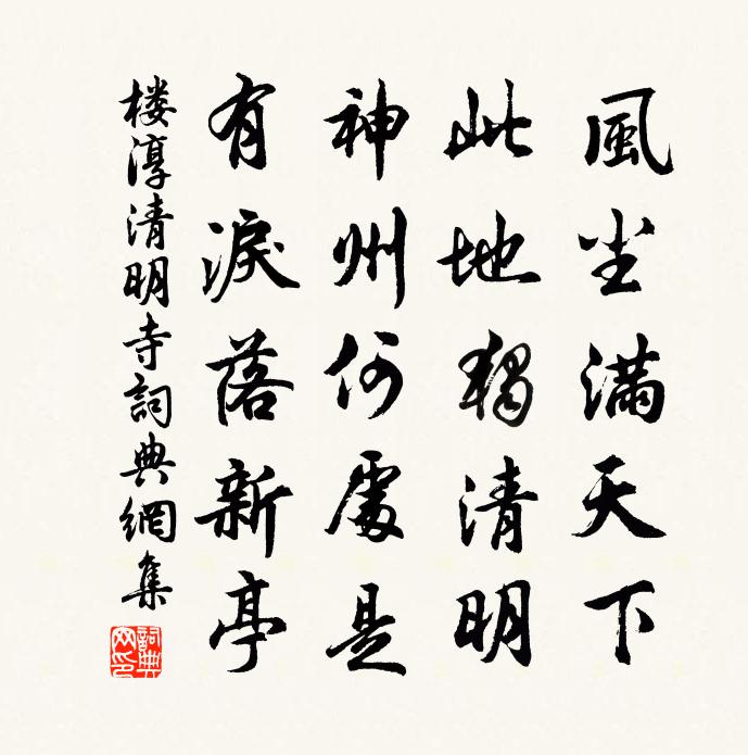 詩詞名句歷史字典書法欣賞書法字典國語詞典說文解字康熙字典古漢語字典標 題 作 者 詩 句 清明寺作者:樓淳 朝代:宋代清明寺原文風塵滿天下,此地獨清明。神州何處是,有淚落新亭。詩詞問答問:清明寺的作者是誰?答:樓淳問:清明寺寫於哪個朝代?答:宋代樓淳清明寺書法欣賞清明寺書法作品詩詞推薦晨興陸游〔宋代〕欲曉不能寐,亟起坐北堂。齋莊對斷簡,左右陳朱黃,湛湛一池墨,裊裊半篆香,老生不自逸,幸此夏日長。奇哉眼兒媚佚名〔宋代〕前時同醉曲江濱。初樣小梅春。花殘人遠,幾經風雨,結子青青。誰知別後無腸斷,行盡水雲程。修峰萬仞,郵亭武夷精舍十詠漁艇袁樞〔宋代〕溪回山路斷,月白沙汀冷。有人掀短篷,擊櫂歌聲永。聞之三嘆息,渙然發深省。歸去萬石灘,理我釣魚艇。哭趙紫芝劉克莊〔宋代〕奪到斯人處,詞林亦可悲。世間空有字,天下便無詩。盡出香分妓,惟留硯付兒。傷心湖上冢,誰葬復誰碑。華景洞呂願中〔宋代〕斯洞名華景,累累乳石懸。虛崖疑月窟,絕頂瞰江湍。岩底金仙寺,峰頭玉井蓮。地形居眾外,氣象偉無前。徙仗雨中花/夜行船 嶺南作朱敦儒〔宋代〕故國當年得意,射麋上苑,走馬長楸。對匆匆佳氣,赤縣神州。好景何曾虛過,勝友是處相留。向伊川雪夜,洛浦代雉朝飛鮑照〔南北朝〕雉朝飛。振羽翼。專場挾雌恃強力。媒已驚。翳又逼。蒿間潛彀盧矢直。刎繡頸。碎錦臆。絕命君前無怨色。握君春寒梅堯臣〔宋代〕春晝自陰陰,雲容薄更深。蝶寒方斂翅,花冷不開心。亞樹青簾動,依山片雨臨。未嘗辜景物,多病不能尋。茶鄭清之〔宋代〕書如香色倦猶愛,茶似苦言終有情。慎勿教渠紈褲識,珠槽碎釜浪相輕。冬至雪二首蘇轍〔宋代〕佳節蕭條陋巷中,雪穿窗戶有顏風。出迎過客知非病,歸對先師喜屢空。黍醞盈瓢終寡味,石薪烘灶信奇功。頗嫌偈頌十三首釋智遇〔宋代〕華亭滿船猶不足,南泉驟步蹈不著。自余眼底紛,總見月忘指。次石湖送炭韻贈龔養正三首陳造〔宋代〕廣文書案雪沾身,灶婦冰葅焮濕薪。彩勝銀花猶拜賜,凍醅寒餅不成春。一年老一年陸游〔宋代〕一年老一年,一日衰一日;譬如東周亡,豈復須大疾。嬾惰已廢書冊久,病來亦復疏杯酒。軔車小住固自佳,拂袖春過鄱陽湖貫休〔唐代〕百慮片帆下,風波極目看。吳山兼鳥沒,楚色入衣寒。過此愁人處,始知行路難。夕陽沙島上,回首一長嘆。念奴嬌(題馬嵬圖)程武〔宋代〕蜀江城遠,想連雲危棧,接天窮處。惆悵煙塵回首地,雙闕觚稜猶故。龍扈星聯,羽林風肅,未放鸞駣去。不堪掩古詩四首奉寄陳宗之兼簡敖臞翁陳鑒之〔宋代〕雌雄烏一色,烈焰玉石分。子桑十日雨,英概君摩雲。塵尾失羈思,襟裾蘭茝芬。是豈如蟨驉,書圃同鋤芸。至日三首馮時行〔宋代〕太史書雲日,周家紀曆年。一樽供笑裹,五載客江邊。城暗催春雨,山連作雪天。功名驚過隙,節物自推遷。送潘端叔趙蕃〔宋代〕長沙送我枉君辭,懷玉逢君動我詩。不是固違良友戒,舍渠寧慰遠遊悲。雁來海角平安訊,春到湖邊南北枝。儻憶偈四首釋慧暉〔宋代〕皮膚脫落絕方隅,明了身心一物無。妙入道寰深靜處,玉人端馭白牛車。宿竇使君莊水亭白居易〔唐代〕使君何在在江東,池柳初黃杏欲紅。有興即來閒便宿,不知誰是主人翁。名句推薦夫為將之道,必順天、因時、依人以立勝也。諸葛亮《將苑·卷一·智用》 人患志之不立,亦何憂令名不彰邪?劉義慶《世說新語·自新》 夜闌風靜欲歸時,惟有一江明月碧琉璃。蘇軾《虞美人·有美堂贈述古》 相恨不如潮有信,相思始覺海非深。白居易《浪淘沙·借問江潮與海水》 未老莫還鄉,還鄉須斷腸。韋莊《菩薩蠻·人人盡說江南好》 烏鵲倦棲,魚龍驚起,星斗掛垂楊。陳亮《一叢花·溪堂玩月作》 洞庭有歸客,瀟湘逢故人。柳惲《江南曲》 日落君山雲氣,春到沅湘草木,遠思渺難收。張孝祥《水調歌頭·過岳陽樓作》 草木行列,煙消日出。蘇轍《黃州快哉亭記》 故去喜去惡,虛心以為道舍。韓非及後人《韓非子·揚權》