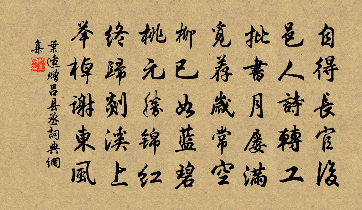 詩詞名句歷史字典書法欣賞書法字典國語詞典說文解字康熙字典古漢語字典標 題 作 者 詩 句 贈呂縣丞作者:葉適 朝代:宋代贈呂縣丞原文自得長官後,邑人詩轉工。批書月屢滿,覓薦歲常空。柳已如藍碧,桃元勝錦紅。終歸剡溪上,舉棹謝東風。詩詞問答問:贈呂縣丞的作者是誰?答:葉適問:贈呂縣丞寫於哪個朝代?答:宋代葉適贈呂縣丞書法欣賞贈呂縣丞書法作品詩詞推薦送施縡秀才下第梅堯臣〔宋代〕君嘗老於敵,輕彼群兒嬉。堅銳不可恃,屢北還自疲。胸中多奇秘,既衂何所為。東走滄海上,夏果采荔枝。奉親對雪呈仲車張耒〔宋代〕學堂書歲暮無來書客,殘雪書漫漫風獵獵。當庭古柳三四枝,老翁攜帚收殘葉。二年閒散百事慵,饑寒不自勤鋤鍤舟中買雙鱖魚楊萬里〔宋代〕金陵城中無纖鱗,一魚往往重六鈞。脊樑尃車尾梢雲,囪如大武千秋箸。小港阻風泊烏舫,舫前漁艇晨收網。一雙贈劉仲圭占牌姚勉〔宋代〕書銜莫羨一條冰,美職高官不足稱。何事只存天爵貴,令名長與日俱升。明妃黃庚〔宋代〕一函香骨埋沙漠,魂魄多應繞漢庭。惟有春風知此恨,年年吹指草痕青。擬行路難鮑照〔南北朝〕君不見枯籜走階庭。何時復青著故莖。君不見亡靈蒙享祀。何時傾杯竭壺罌。君當見此起憂思。寧及得與時人爭。閒中口占數絕園丁去烏蜂鄭清之〔宋代〕見說包蜂一採花,群飛啄蜜喙如鴉。雖然冗食真堪汰,笑語園丁且放衙。移石種竹橘張鎡〔宋代〕野性樂閒寂,況值秋氣清。旋即東牆隈,削苔方甃平。石立稍退步,薜荔纏珠纓。橘香湖海趣,竹翠山林情。二物寄制誥李舍人羅隱〔唐代〕梁王握豹韜,雪裡見枚皋。上客趨丹陛,遊人嘆二毛。門閒知待詔,星動想濡毫。一首長楊賦,應嫌索價高。寄題桂籍陳宓〔宋代〕姓名高揭萬人中,奏對縱橫出漢宮。肯詫一時燕許手,要垂百代惠夷風。壁間先烈猶忠赤,堂上嘉賓盡醉紅。常相華亭百詠佘山許尚〔宋代〕人與室俱化,陰森松竹寒。時時見孤鶴,疑此守神丹。再和浣花韻呈李彭州李參政魏了翁〔宋代〕囅然一開口,天也非人謀。江山自舊管,風景仍新收。一門令兄弟,而我從之游。衛玠珠玉側,李譍神仙舟。主賓贈惟了侍者陸游〔宋代〕水邊剝啄打門誰?滿袖清風一紙詩。驚起放翁蝴蝶夢,半窗寒日欲斜時。【越調】寨兒今趙善慶〔元代〕早春湖游景物新,艷晨昏,山氣張大成綠雲。畫舫紅裙,紫陌遊人,香軟馬蹄塵。棹漣漪水皺羅紋,破韶華桃露朱昨日出城南行釋文珦〔宋代〕昨日出城南,戰陣如雲屯。兵刃欲相接,殺氣方騰掀。黃塵塞天地,日月為之昏。壯士仗忠義,不忘喪其元。奮然五音曲 宮引沈約〔南北朝〕八音資始。君五聲。興此和樂。感百精。優遊律呂。被鹹英。八月六日寄鄰幾諸君劉敞〔宋代〕謬為天官屬,得與選事親。略計三百州,綠衣九千人。較材迷長短,守法愧因循。救末知不足,澄源力難伸。諸君送僧入天台李頻〔唐代〕一錫隨緣赴,天台又去登。長亭舊別路,落日獨行僧。夜燒山何處,秋帆浪幾層。他時授巾拂,莫為老無能。酒船王令〔宋代〕刳木以為舟,蓋取諸渙象。有能為其模,黃金役良匠。虛中無檣楫,所載惟佳釀。繡段圍華堂,妖姬發清唱。坐乘壽湖南汪倉十首廖行之〔宋代〕賦政頻年合簡求,民情滋欲得公留。雖然湖外私膏澤,須索樊侯入佐周。名句推薦暗相思,無處說,惆悵夜來煙月。韋莊《應天長·別來半歲音書絕》 雨足高田白,披蓑半夜耕。崔道融《田上》 巧媳婦煮不得沒米粥馮夢龍《警世通言·卷十二》 行非恆者,天禁之。爽事,地禁之。佚名《黃帝四經·十大經·三禁》 風雨替花愁。風雨罷,花也應休。趙秉文《青杏兒·風雨替花愁》 女慕貞潔,男效才良。周興嗣《千字文·全文》 酷憐嬌易散,燕子學偎紅。納蘭性德《臨江仙·絲雨如塵雲著水》 未收天子河湟地,不擬回頭望故鄉。令狐楚《少年行四首·其三》 千里孤墳,無處話淒涼。蘇軾《江城子·乙卯正月二十日夜記夢》 一寸相思千萬緒。人間沒個安排處。李冠《蝶戀花·春暮》