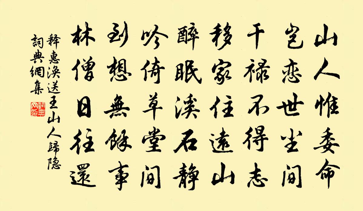 詩詞名句歷史字典書法欣賞書法字典國語詞典說文解字康熙字典古漢語字典標 題 作 者 詩 句 送王山人歸隱作者:釋惠渙 朝代:宋代送王山人歸隱原文山人惟委命,豈戀世塵間。乾祿不得志,移家住遠山。醉眠溪石靜,吟倚草堂間。到想無餘事,林僧日往還。詩詞問答問:送王山人歸隱的作者是誰?答:釋惠渙問:送王山人歸隱寫於哪個朝代?答:宋代釋惠渙送王山人歸隱書法欣賞送王山人歸隱書法作品詩詞推薦挽穀子長廖行之〔宋代〕伊昔拜芝宇,詞場話俊游。一從分袂日,五閱鱠鱸秋。別夢思何極,長川逝莫留。蓋棺俄隔世,空遣淚橫流。秋夜偶成 其四王冕〔元代〕孤雲杳杳雁聲寒,黃葉蕭蕭詩思慳。坐對酒樽懷北海,嘯歌白石向南山。菊花野雨家何處?□老秋風客未還。梁甫日暮自大匯村歸陸游〔宋代〕筍輿伊軋暮山昏,水敗陂塘路僅存。出谷鐘聲知過寺,隔林人語喜逢村。廟壖荒寂新犁地,堤草淒迷舊燒痕。兒子和金沙蔣文海韻仇遠〔宋代〕我聞茅峰下,曾有臥龍人。風雲未承運,淵潛聊自珍。世無卞和氏,誰辨玉與珉。緇塵化衣裳,我獨潔其身。攬鏡甘露寺遭火蔡肇〔宋代〕聚墨魔宮殿,毗嵐 * 天。劫灰迷狠石,鉛水泫銅仙。扁榜無佳句,華榱有勝緣。大江春正碧,白晝島夷船。塞翁吟陳允平〔宋代〕睡起鸞釵嚲,金約鬢影朧。桅佩冷,玉丁東。鏡里對芙蓉。秦箏倦理梁塵暗,惆悵燕子樓空。山萬疊,水千重。初到昭應呈同僚王建〔唐代〕白髮初為吏,有慚年少郎。自知身上拙,不稱世間忙。秋雨懸牆綠,暮山宮樹黃。同官若容許,長借老僧房。正憲吳公輓辭王安石〔宋代〕丙魏雖曹漢道昌,豈如公出值虞唐。秀鍾舊國山川氣,榮附中天日月光。更化事功參虎變,贊元時序得金穰。傷心望蓬萊劉志淵〔元代〕涉塵客,念念苦貪饕。掛壁飛猱心縱樂,戰風劣馬意徒勞。熟境恣煎熬。甘執苦,心事冗如毛。爭似劈摧情擾擾,寧茵事諺佚名〔唐代〕鵓鳩樹上鳴,意在麻子地。詠史上老子陳普〔宋代〕瓜葛非徒李世民,牽藤引蔓百千身。周時柱下霜眉客,今作書符呪水人。樂府雜詠六首月成弦陸龜蒙〔唐代〕孤光照還沒,轉益傷離別。妾若是嫦娥,長圓不教缺。夜飲呈葉司戶張鎡〔宋代〕欲薄交難古,心親話許深。更長銀燭夜,院靜石雲陰。冷夢多孱骨,修程費老襟。松壺梅並插,投醉且高吟。病中雜興五言十首劉克莊〔宋代〕佛以滅為樂,觀身身一漚。如何盧行者,鎔鐵護枯髏。滿江紅佚名〔宋代〕魂夢斷,難尋覓。題筠州趙縣丞寒谷徐照〔宋代〕栽梅一百樹,有屋二三間。此地長宜隱,為官卻未閒。路移存古井,城逼失前山。喜共紅蕖客,來吟至夕還。次韻元衡兩絕句趙蕃〔宋代〕舊說詩壇不可攀,豈期於此得窺斑。茫茫世事催人別,數見猶期數日閒。寄題天與清香台陳深〔宋代〕芳園矗憎台,宛在江之曲。何年植瓊樹,粲粲紛在目。美人芙蓉裳,超遙處空谷。時登月中觀,玩此枝上玉。幽信寄父王氏〔宋代〕西風不入小窗紗,秋氣應鄰我憶家。極目江南千里恨,依然如淚看黃花。翰林游舍人清明日入院中塗見過餘明亦入西省徐鉉〔唐代〕榆柳開新焰,梨花發故枝。輜軿隘城市,圭組坐曹司。獨對芝泥檢,遙憐白馬兒。禁林還視草,氣味兩相知。名句推薦山路元無雨,空翠濕人衣。王維《山中》 故人入我夢,明我長相憶。杜甫《夢李白二首·其一》 台在山腰,一峰突起,離水十餘丈。沈復《浮生六記·浪遊記快》 怒濤卷霜雪,天塹無涯。柳永《望海潮·東南形勝》 眺聽良多感,徙倚獨沾襟。李密《淮陽感秋》 杪秋霜露重,晨起行幽谷。柳宗元《秋曉行南谷經荒村》 知足不辱,知止不殆,可以長久。老子《老子·德經·第四十四章》 與人不求備,檢身若不及佚名《尚書·商書·伊訓》 秋江上,看驚弦雁避,駭浪船回。辛棄疾《沁園春·帶湖新居將成》 遙看孟津河,楊柳郁婆娑。佚名《折楊柳歌辭五首》