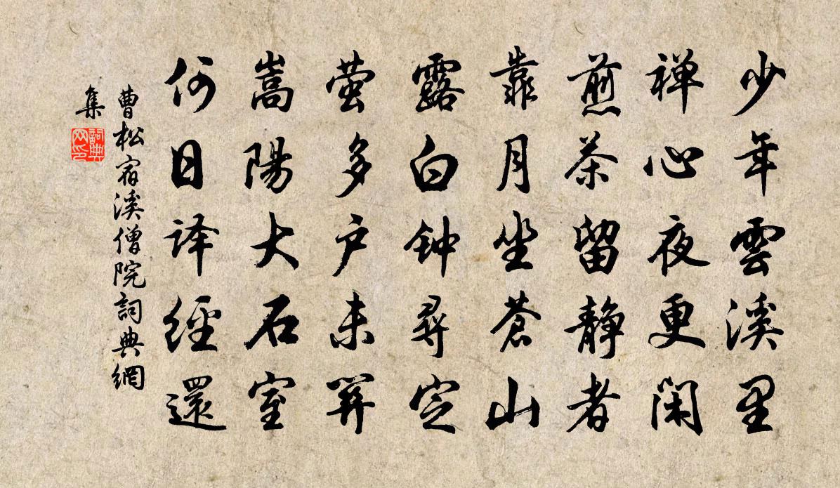 詩詞名句歷史字典書法欣賞書法字典國語詞典說文解字康熙字典古漢語字典標 題 作 者 詩 句 宿溪僧院作者:曹松 朝代:唐代宿溪僧院原文少年雲溪里,禪心夜更閒。煎茶留靜者,靠月坐蒼山。露白鍾尋定,螢多戶未關。嵩陽大石室,何日譯經還。詩詞問答問:宿溪僧院的作者是誰?答:曹松問:宿溪僧院寫於哪個朝代?答:唐代問:宿溪僧院是什麼體裁?答:五律曹松宿溪僧院書法欣賞宿溪僧院書法作品注釋全唐詩:卷717-7詩詞推薦水龍吟(李詞)趙長卿〔宋代〕葦綃開得仙花,就中最有佳人似。香肌勝雪,千般揉縛,禁他風雨。縞夜精神,繁春標緻,忍教孤負。悵潘郎去後謁文宣王廟羅隱〔唐代〕晚來乘興謁先師,松柏淒淒人不知。九仞蕭牆堆瓦礫,三間茅殿走狐狸。雨淋狀似悲麟泣,露滴還同嘆鳳悲。儻使溪上晚上二首王炎〔宋代〕風定留黃葉,波清涌白沙。前山惟道院,斷岸半漁家。老去忘時事,閒中度歲華。經旬如再出,便可探梅花。紅鈴二首賈似道〔宋代〕紅肩紅脅不為奇,連連贏得也防虞。今鈴落了終難復,無情去鬭卻成灰。苕之華佚名〔先秦〕苕之華,芸其黃矣。心之憂矣,維其傷矣!苕之華,其葉青青。知我如此,不如無生!牂羊墳首,三星在罶。人可閻子常求琴弦晁補之〔宋代〕先生三尺琴,斷絕弦上音。欲求鳳喙膠,弱水毛猶沉。游水南寺余靖〔宋代〕雙剎聳浮雲,層軒絕世塵。松溪千蓋雨,茶圃一旗春。夜梵龕燈暗,朝香篆火新。暫來猶永日,堪羨白蓮人。出守桐廬道中十絕范仲淹〔宋代〕分符江外去,人笑似騷人。不道鱸魚美,還堪養病身。詩王粲〔魏晉〕哀笑動梁塵。急觴盪幽默。踏莎行(泰妓胡芳來常隸籍,以其端嚴如木偶,人因目之為佛,乃作是雲)蔡伸〔宋代〕如是我聞,金仙出世。一超直入如來地。慈悲方便濟群生,端嚴妙相誰能比。四眾歸依,悉皆歡喜。有情同赴龍華春使道中作三首歐陽修〔宋代〕執手意遲遲,出門還草草。無嫌去時速,但願歸時早。北風吹雪犯征裘,夾路花開回馬頭。若無二月還家樂,爭奈病(一作痛)憶韓偓〔唐代〕信知尤物必牽情,一顧難酬覺命輕。曾把禪機銷此病,破除才盡又重生。磧中作岑參〔唐代〕走馬西來欲到天,辭家見月兩回圓。今夜不知何處宿,平沙萬里絕人煙。秦人竹豸留謠佚名〔唐代〕{豸留}{豸留}引黑牛,天差不自由。但看戊寅歲,揚在蜀江頭。次韻子由績溪病起被召寄王定國黃庭堅〔宋代〕種萱盈九畹,蘇子憂國病。炎蒸臥百戰,山立有餘勁。斯人廊廟器,不合從遠屏。江湖搖歸心,毛髮侵老境。艱難到荊州春物正佳樞使王公招宴歡甚已而幕府諸孫應時〔宋代〕華亭冠層城,滿城桃與李。微風散晴煙,七澤多春水。龍山集眄,章台見遺址。感物思無窮,對酒差可喜。合衣寢元稹〔唐代〕良夕背燈坐,方成合衣寢。酒醉夜未闌,幾回顛倒枕。東窗陸游〔宋代〕九折危途寸步艱,至今回首尚心寒。元來自有安身處,茆屋三間似海寬。留題新安幕府聚秀軒李彌遜〔宋代〕星聚群賢上幕賓,層軒高敞枕溪漘。一時盧駱五楊輩,萬里東西南北人。句里江山端有助,學餘民社政須親。青冥次韻蘇伯固主簿重九蘇軾〔宋代〕雲間朱袖拂雲和,知是長松掛發蘿。髻重不嫌 * 滿,手香新喜綠橙搓。墨翻衫袖吾方醉,紙落雲煙子患多。只有名句推薦應憐屐齒印蒼苔,小扣柴扉久不開。葉紹翁《遊園不值》 鳥向平蕪遠近,人隨流水東西。劉長卿《謫仙怨·晴川落日初低》 恭者不侮人,儉者不奪人。孟子《孟子·離婁章句上·第十六節》 千年忠義氣,日星光。離騷讀罷總堪傷。舒頔《小重山·端午》 橋成漢渚星波外,人在鸞歌鳳舞前。晏幾道《鷓鴣天·當日佳期鵲誤傳》 春未老,風細柳斜斜。蘇軾《望江南·超然台作》 小溪清水平如鏡,一葉飛來浪細生。徐璣《秋行》 人生天地之間,若白駒之過隙,忽然而已。莊子《莊子·外篇·知北游》 松雪飄寒,嶺雲吹凍,紅破數椒春淺。周密《獻仙音·吊雪香亭梅》 愁一箭風快,半篙波暖,回頭迢遞便數驛周邦彥《蘭陵王·柳》