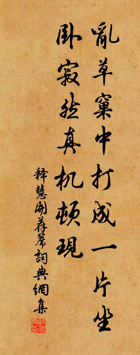 詩詞名句歷史字典書法欣賞書法字典國語詞典說文解字康熙字典古漢語字典標 題 作 者 詩 句 薦蓆作者:釋慧開 朝代:宋代薦蓆原文亂草窠中,打成一片。坐臥寂然,真機頓現。詩詞問答問:薦蓆的作者是誰?答:釋慧開問:薦蓆寫於哪個朝代?答:宋代釋慧開薦蓆書法欣賞薦蓆書法作品詩詞推薦長江圖牟巘〔宋代〕漢川影落鸚鵡洲,金山鍾到多景樓。老龍幾載臥寒碧,中間不斷萬古流。晚來雪浪大如屋,澎湃舞我一葉舟。舟移武夷築精舍陳韡〔宋代〕浮世何嘗有定居,愜情便可著茅廬。久知名利為韁鎖,愛此溪山似畫圖。種菊疎籬慕陶令,栽梅淺水學林逋。只須已亥雜詩 93龔自珍〔清代〕金鑾並硯走龍蛇,無分同探閬苑花。十一年來春夢冷,南遊且吃玉川茶。同孟浩然宴賦(一作題壁歌)王迥〔唐代〕屈宋英聲今止已,江山繼嗣多才子。作者於今盡相似,聚宴王家其樂矣。共賦新詩發宮徵,書於屋壁彰厥美。戴時可家賞木芙蓉花醉賦陳著〔宋代〕西風不是芳菲節,木落山空景淒切。賴有桂菊聊記時,殿後拒霜花始發。我攜樽酒來問花,花於此時擅奇絕。先白和趙南塘離支五絕劉克莊〔宋代〕側生海畔遠難將,風日尤能變色漿。借問驛馳丞相府,何如輦致道山堂。舟次子陵釣台張伯玉〔宋代〕十載從軍去又來,強為顏面走塵埃。久慚簪笏未歸去,且喜妻孥共此來。旋擷岸蔬供野飯,欲題岩壁拂蒼苔。子陵復朱晦庵謝諤〔宋代〕笑指長沙擅閫,來向吾鄉假途。一段忙中說活,無非孔孟工夫。踏雲行 仵壽之生日,設醮索詞馬鈺〔元代〕謹寫青詞,專修黃。香茶酒果並香燭。鐘聲磬韻透青霄,科儀款款當宣讀。瑞氣氤氳,祥煙馥郁。金童玉女傳言萬安賴秀才家拾青樓二首周必大〔宋代〕高柳侵檐帶綠煙,平林遙望倚青天。詩人不必工摹寫,留與恩袍色斗鮮。和蔡樞密孟夏旦日西府書事王安石〔宋代〕宮闕初晴氣象饒,寶車攢轂會東朝。重輪慶自離明後,內壤陰隨解澤消。賜篚外廷紛錦繡,燕庖中禁續薪樵。聯翩酬張明府皎然〔唐代〕愛君詩思動禪心,使我休吟待鶴吟。更說郡中黃霸在,朝朝無事許招尋。中原吟邵雍〔宋代〕中原之師,仁義為主。仁義既無,四夷來侮。初著緋戲贈元九白居易〔唐代〕晚遇緣才拙,先衰被病牽。那知垂白日,始是著緋年。身外名徒爾,人間事偶然。我朱君紫綬,猶未得差肩。端午帖子皇帝閣周必大〔宋代〕水殿開筵酒泛蒲,冰盤進膳黍纒菰。六宮莫度新翻曲,只詠明州瑞麥圖。句楊朴〔宋代〕就客飲時擔酒去,見魚游處撥萍開。勿言魯酒薄為史端叔作也端叔同寮於越未終更喻良能〔宋代〕同寮雖雲多,交友未易結。臭味一小異,肝膽便楚越。君侯宰相子,風度何翩翩。四偕計吏貢,春銓復襃然。一見菩薩蠻(四)王齊愈〔宋代〕遠香風遞蓮湖滿。滿湖蓮遞風香遠。光鑒試新妝。妝新試鑒光。棹穿花處好。好處花穿棹。明月詠歌清。清歌詠月賀新郎(用張小山韻賀小山納婦)趙必〔宋代〕沙上盟鷗鷺。笑吟翁、夢今不到,草堂深處。金屋重重春睡暖,傍翠偎香步步。已自摘、蟠桃三度。舊日畫眉情性送窮張耒〔宋代〕年年瀝酒拜清晨,風俗新正競逐貧。不用為文送窮鬼,直須圖事祝錢神。名句推薦軍井成而後飲,軍食熟而後飯,軍壘成而後舍,勞佚必以身同之。尉繚《尉繚子·戰威》 望闕雲遮眼,思鄉雨滴心。白居易《陰雨》 早梅發高樹,迥映楚天碧。柳宗元《早梅》 斜日更穿簾幕,微涼漸入梧桐。晏殊《破陣子·燕子欲歸時節》 穀神不死,是謂玄牝。玄牝之門,是謂天地根。綿綿若存,用之不勤。老子《老子·道經·第六章》 啼時驚妾夢,不得到遼西。金昌緒《春怨 / 伊州歌》 吳台直下,緗梅無限,未放野橋香度。吳文英《永遇樂·探梅次時齋韻》 綠樹陰濃夏日長,樓台倒影入池塘。高駢《山亭夏日》 流芳未及歇,遺掛猶在壁。潘安《悼亡詩三首》 人生天地間,忽如遠行客。佚名《青青陵上柏》