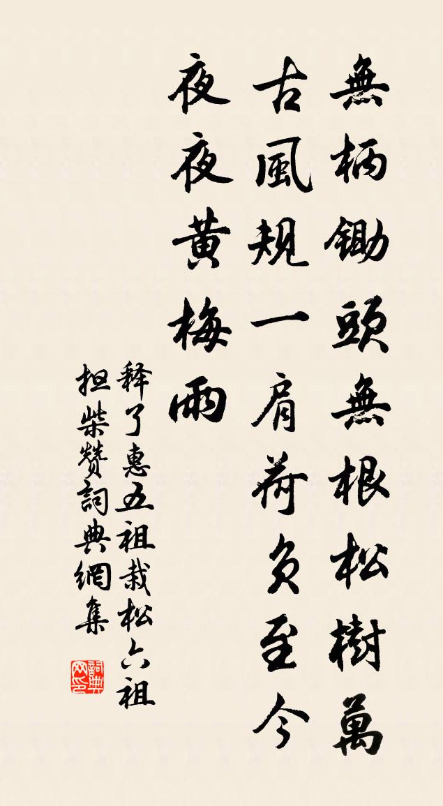 詩詞名句歷史字典書法欣賞書法字典國語詞典說文解字康熙字典古漢語字典標 題 作 者 詩 句 五祖栽松六祖擔柴贊作者:釋了惠 朝代:宋代五祖栽松六祖擔柴贊原文無柄鋤頭,無根松樹。萬古風規,一肩荷負。至今夜夜黃梅雨。詩詞問答問:五祖栽松六祖擔柴贊的作者是誰?答:釋了惠問:五祖栽松六祖擔柴贊寫於哪個朝代?答:宋代釋了惠五祖栽松六祖擔柴贊書法欣賞五祖栽松六祖擔柴贊書法作品詩詞推薦游叔虞祠張伯玉〔宋代〕廟中桐葉手中文,閒讀高碑拂素塵。異隴歸禾曾是主,徒林射兕獨留神。關河莫問周秦事,花木誰分漢魏春。惟有水調歌頭汪莘〔宋代〕堯舜去已遠,稷契不重來。周流天上地下,我馬亦悠哉。君向雲中獨立,知與何人相俟,孔蓋逐風回。長憶目成處漁父·漁父醒蘇軾〔宋代〕漁父醒,春江午。夢斷落花飛絮。酒醒還醉醉還醒,一笑人間今古。句胡玢〔唐代〕輪中別有物,光外更無空。紹興丁已二月三十日同晏元老馮應禮羅君瑞游何麒〔宋代〕丁令梅仙梁市客,穿雲隨我上虛無。攜持賴有竹都尉,偃蹇更逢松大夫。山積五倉窺石□,霞拖九芒覓丹爐。聖泉盧帥錢待制之望輓詞周必大〔宋代〕白鹿爭看擁碧油,貂蟬銳欲出兜鍪。初官事業追山盜,晚歲功名靜海舟。鶴唳八公垂破賊,虎飛萬里欠封侯。儒科送以道赴漢東兵官因呈繡使吳勝這同年兼簡李曹彥約〔宋代〕久入功名會,新攜辟召書。忠勤曾策勵,奮迅此權輿。當路心知己,長城指望渠。只將真實地,持守足安居。太師杜公輓詞五首梅堯臣〔宋代〕國佐三公進,師臣一品歸。接賓妄素貴,還綬遠危機。憶奉追尊冊,當觀副輅旗。生榮人莫及,無恨掩泉扉。游古仙岩劉過〔宋代〕白苹風裡步清秋,來作靈岩古洞游。笑倚飛雲訪仙跡,夕陽無語伴人愁。謝人致蟹方岳〔宋代〕雪砍雙螯玉一壺,樵中曾有此奇無。始知張翰思歸意,不為秋風只為鱸。導引佚名〔宋代〕中興復古,孝治日昭鴻。原廟飾瑰宮。金壁千門磻萬磶,楹桷竟穹崇。亭童芝蓋擁旌龍。列聖儼相從。共錫神孫千次韻山居胡仲弓〔宋代〕夕陽漏影射疎林,三兩人家桑柘陰。鶻過桚開歸鳥路,鐘敲撞碎野猿心。常因境勝甘忘食,不為家貧輒廢吟。說與山行見孤桐詩鮑照〔南北朝〕桐生叢石里。根孤地寒陰。上倚崩岸勢。下帶洞阿深。奔泉冬激射。霧雨夏霖浮。未霜葉已肅。不風條自吟。昏明觀音詩釋契適〔宋代〕覺源非有等差心,物性陶溶逐淺深。昏惑道中瞻月角,辨才門裡聽潮音。彩雲輕罩山輝玉,花雨斜飛地涌金。終擬歲暮吟邵雍〔宋代〕此情人不知,亦嘗嘆遲久。雖則嘆遲久,奈何人不受。雨中花長筌子〔元代〕急急蛩音,似箭暗催,人物菸草茫茫。塞鴻悲秋晚,敗葉飄黃。萬里關山牢落,一天風雨淒涼。這蕭閒活計,向誰句佚名〔唐代〕三萬蓮經三十春,半生不蹋院門塵。再和前韻答達善季辯舒岳祥〔宋代〕居屨送人征影遠,布裘知我涕痕零。初愁凍雪無狐白,忽喜晴霄現卵青。欲向華山成穩睡,不禁楚澤自長醒。桃源各遠禍徐照〔宋代〕拙鳩巢杉刺棚,曙出昏入俱不鳴。雙雛脫殼羽翅生,母來哺餵雛無聲。鳩能默默各遠禍,一日高飛啄庭果。入山遇雨宿開先寺二首王阮〔宋代〕擺落塵埃步入山,與僧相對浹旬間。鶴林卻笑題詩客,只得浮生半日閒。名句推薦日下壁而沉彩,月上軒而飛光。江淹《別賦》 卷旗夜劫單于帳,亂斫胡兒缺寶刀。馬戴《出塞詞》 豪華盡成春夢,留下古今愁。康與之《訴衷情令·長安懷古》 愁里高歌梁父吟,猶如金玉戛商音。鄭思肖《二礪》 秀色掩今古,荷花羞玉顏。李白《西施 / 詠薴蘿山》 老來情味減,對別酒,怯流年。辛棄疾《木蘭花慢·滁州送范倅》 如夢,如夢,殘月落花煙重。李存勖《如夢令·曾宴桃源深洞》 易挑錦婦機中字。難得玉人心下事。劉克莊《玉樓春·戲林推》 竹柏皆凍死,況彼無衣民。白居易《村居苦寒》 紫燕一雙嬌語碎,翠屏十二晚峰齊,夢魂消散醉空閨。毛熙震《浣溪沙·花榭香紅煙景迷》