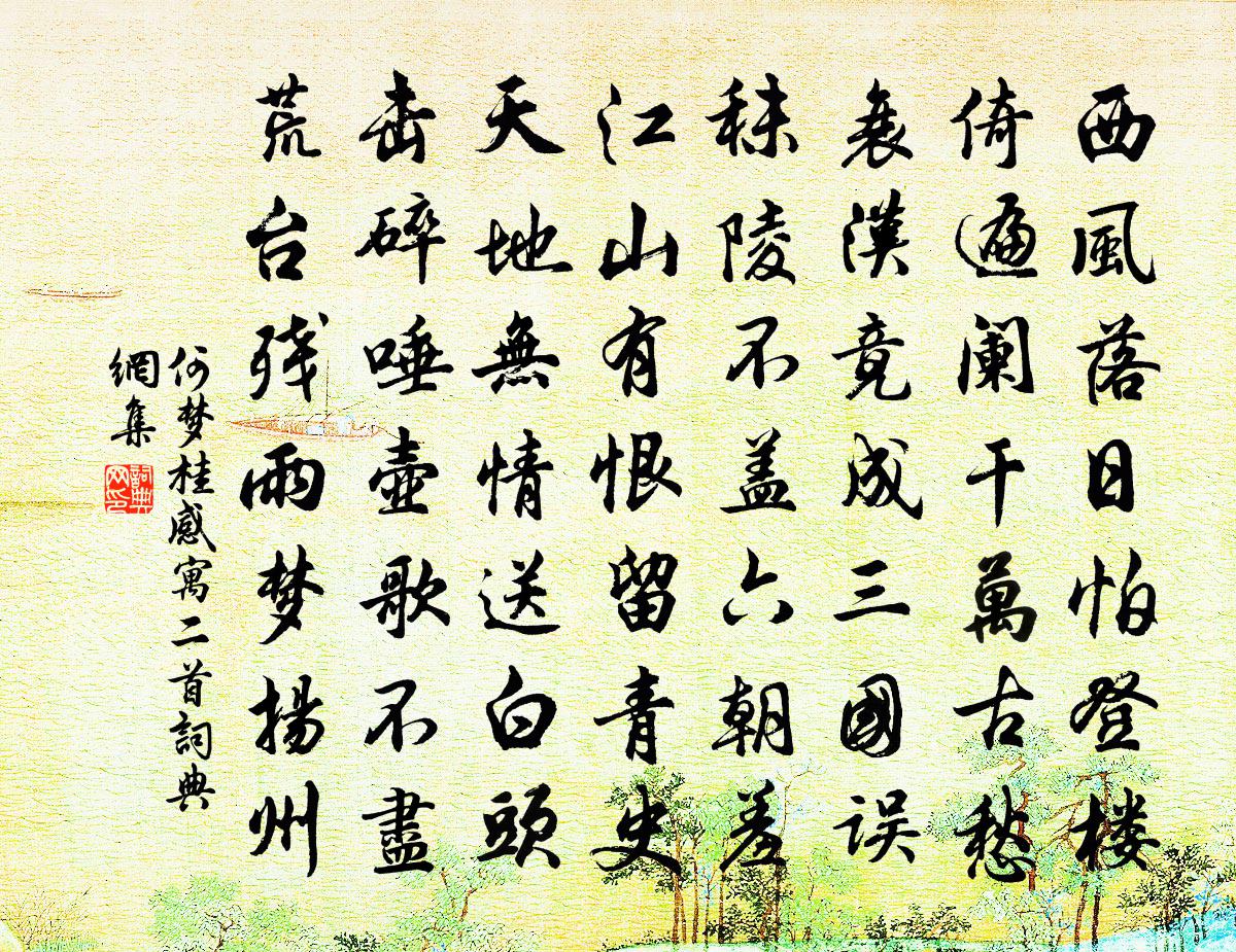 詩詞名句歷史字典書法欣賞書法字典國語詞典說文解字康熙字典古漢語字典標 題 作 者 詩 句 感寓二首作者:何夢桂 朝代:宋代感寓二首原文西風落日怕登樓,倚遍闌乾萬古愁。衰漢竟成三國誤,秣陵不蓋六朝羞。江山有恨留青史,天地無情送白頭。擊碎唾壺歌不盡,荒台殘雨夢揚州。詩詞問答問:感寓二首的作者是誰?答:何夢桂問:感寓二首寫於哪個朝代?答:宋代何夢桂感寓二首書法欣賞感寓二首書法作品詩詞推薦代同舍上黃相生辰三首仲並〔宋代〕列宿東南夜有輝,門弧此際誕英奇。晏嬰儉德人皆仰,召虎中興日可斯。名譽雅為天下望,孤忠自結聖君知。大椿物外釋文珦〔宋代〕物外煙霞古,幽深斷送迎。聵僧唯反聽,啼鳥自春聲。望岳山心靜,臨池水觀成。豈知趨世者,終日但營營。次韻答戴帥初送麴二絕舒岳祥〔宋代〕子云嗜飲苦不給,時有問字人能來。使我得裂醉鄉土,為爾特築黃金台。頌古十六首釋道寧〔宋代〕叢林乍入問來由,吃粥無過洗缽休。有意氣時添意氣,不風流處也風流。脫京口定計難文天祥〔宋代〕南北人人苦泣岐,壯心萬折誓東歸。若非斫案判生死,夜半何人敢突圍。句王大受〔宋代〕有分長為客。憩江寺釋紹嵩〔宋代〕眾岫聳寒色,長溪抱碧岑。波傾三峽急,樹合四時陰。野寺江天豁,禪房花木深。幽簾宜永日,閒坐聽春禽。鷓鴣天李清照〔宋代〕寒日蕭蕭上鎖窗。梧桐應恨夜來霜。酒闌更喜團茶苦,夢斷偏宜瑞腦香。秋已盡,日猶長。仲宣懷遠更淒涼。不如雜劇·崔鶯鶯待月西廂記·張君瑞害相思(第三本)王實甫〔元代〕楔子(旦上,雲)自那夜聽琴後,聞說張生有病,我如今著紅娘去書院裡,看他說甚么。(叫紅科)(紅上,雲)龍洞何炳然〔宋代〕鬍髯抱嵌岩,白雲擁萬里。若弄華陽珠,我欲割左耳。雷陸游〔宋代〕君不桃見,冬月桃雷,深藏桃九地底,桃寂默如寒灰。紛紛槁葉木盡脫,蠢蠢蟄戶蟲爭坯。堅冰積雪一朝盡,風搖菩薩蠻譚處端〔元代〕慧刀揮處人頭落。虹霓萬道沖雲腳。滅盡我人心。何勞向外尋。白蓮生火里。法忍無生死。忍辱兩皆空。龜毛兔角大雪行張舜民〔宋代〕曉辭洛水濱,暮宿河之涘。四野漫漫不見人,竟日止能行數里。渾然天地為一色,渭水南北復何似。五陵鷹犬爭合送程給事知越州虞大熙〔宋代〕標置才謀孰尚公,拜恩新領浙江東。黃扉玉殿官儀貴,皂蓋朱幡使節雄。耕織富饒青嶂里,樓台縹緲翠雲中。到時送春·水淺魚爭躍高駢〔唐代〕水淺魚爭躍,花深鳥競啼。春光看欲盡,判卻醉如泥。送僧歸護國寺錢景臻〔宋代〕天台多勝概,落日亂山青。不似三峰好,樓台入翠屏。乍晴二首張耒〔宋代〕虹長飲雨川無滴,苹末生風沼有波。一掃煙雲不知處,夜天如水瀉銀河。游峴山觀顏魯公窪樽呈谹父李處權〔宋代〕人物如公亦偉哉,窪樽寂寞峴山隈。似聞著履凌風出,不見拿舟弄月回。往事只應君可記,幽期孰謂我能開。留詩吏部舊語佚名〔唐代〕長名以前,選人屬侍郎。長名以後,侍郎屬選人。感悟妄緣,題如上人壁白居易〔唐代〕自從為騃童,直至作衰翁。所好隨年異,為忙終日同。弄沙成佛塔,鏘玉謁王宮。彼此皆兒戲,須臾即色空。有營名句推薦道人善,即是善。人知之,愈思勉。李毓秀《弟子規·泛愛眾》 人棄我取,人取我與。司馬遷《史記·貨殖列傳》 少婦今春意,良人昨夜情。沈佺期《雜詩三首·其三》 逕直夫何細!橋危可免扶?楊萬里《寒食上冢》 去年上巳洛橋邊,今年寒食廬山曲。宋之問《寒食江州滿塘驛》 洞庭春溜滿,平湖錦帆張。陰鏗《渡青草湖》 淚彈不盡臨窗滴。就硯旋研墨。晏幾道《思遠人·紅葉黃花秋意晚》 小人不激不勵,不見利不勸。王通《中說·卷一·王道篇》 東飛伯勞西飛燕,黃姑織女時相見。蕭衍《東飛伯勞歌》 人之忌,在好為人師。孟子《孟子·離婁章句上·第二十三節》