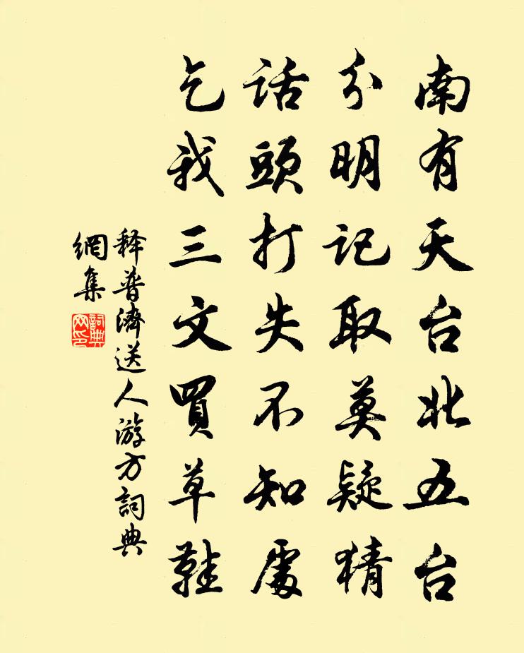 詩詞名句歷史字典書法欣賞書法字典國語詞典說文解字康熙字典古漢語字典標 題 作 者 詩 句 送人遊方作者:釋普濟 朝代:宋代送人遊方原文南有天台北五台,分明記取莫疑猜。話頭打失不知處,乞我三文買草鞋。詩詞問答問:送人遊方的作者是誰?答:釋普濟問:送人遊方寫於哪個朝代?答:宋代釋普濟送人遊方書法欣賞送人遊方書法作品詩詞推薦送楊瓘雁門省親二首黃庭堅〔宋代〕蜀客出衰世,獨升鄒魯堂。蚊虻觀得失,虎豹擅文章。吾子已強學,草玄宜不忘。江河須畎澮,松柏要冰霜。馬策瑤華慢 賦雪凌雲翰〔元代〕喜深驚密,試問滕神,有多少寒力。如圓似瑩,總疑是、滿眼隋珠和璧。五更書幌,早已覺、寒光穿隙。料禽影波嘲趙謙光賀遂涉〔唐代〕員外由來美,郎中望亦優。寧知粉署里,翻作土山頭。寄題悠然閣三絕句張元乾〔宋代〕誰標此閣作悠然,萬事無非信手拈。參得東籬把菊意,不妨老遠引陶潛。浣溪沙毛熙震〔唐代〕春暮黃鶯下砌前,水精簾影露珠懸,綺霞低映晚晴天。弱柳萬條垂翠帶,殘紅滿地碎香鈿,蕙風飄蕩散輕煙。花榭夜飲朝眠曲李賀〔唐代〕觴酣出座東方高,腰橫半解星勞勞。柳苑鴉啼公主醉,薄露壓花蕙蘭氣。玉轉濕絲牽曉水,熱粉生香琅玕紫。夜飲偈頌一百三十六首釋惟一〔宋代〕可祖齊腰立雪,長慶坐破 * 。一人鐵壁覷要透,一人滄海瀝須乾。鐵壁透,滄海乾,出禮三拜依位立,捲起簾來塞垣春吳文英〔宋代〕漏瑟侵瓊管。潤鼓借、烘爐暖。藏鉤怯冷,畫雞臨曉,憐語鶯囀。殢綠窗、細咒浮梅盞。換蜜炬、花心短。夢驚回題尤提舉惠雙蓮二首袁說友〔宋代〕十年蹤跡落修門,剩憶西湖菡萏風。今日江城秋浦上,舞綃依約舊相逢。送人游衡岳齊己〔唐代〕荊楚臘將殘,江湖蒼莽間。孤舟載高興,千里向名山。雪浪來無定,風帆去是閒。石橋僧問我,應寄岳茶還。臨安旅邸答蘇虞叟姜夔〔宋代〕生楊風雨小樓寒,宋玉秋詞不忍看。萬里青山無處隱,可憐投老客長安。寄張仲甫皇甫曾〔唐代〕悲風生舊浦,雲嶺隔東田。伏臘同雞黍,柴門閉雪天。孤村明夜火,稚子候歸船。靜者心相憶,離居畏度年。示黃岡長老二絕胡寅〔宋代〕落日溪橋佇寧時,溪雲歸盡月生遲。溪聲漏泄真訊息,借問溪翁卻不知。柳梢青(茶)李處全〔宋代〕九天圓月。香塵碎玉,素濤翻雪。石乳香甘,松風湯嫩,一時三絕。清宵好盡歡娛,奈明日、扶頭怎說。整頓頹山挽方德潤寶學三首劉克莊〔宋代〕龔勝乘車晚,陽城伏合初。自雲臣語戇,不是上恩疏。黃壤全名節,青編載諫書。始知年與德,造物有乘除。句李師中〔宋代〕兜鍪不勝任,猶可冠貂蟬。壽朱約山八十韻文天祥〔宋代〕翠袖瓊樓八十翁,平安曉宇看孤鴻。五湖圖里添彭祖,南極光中約祝融。日日青山醉春色,年年 * 飽西風。鷹揚無盡橋郭印〔宋代〕園林作佛事,施子不少吝。攜筇渡一溪,華藏愈無盡。送杜十四之江南孟浩然〔唐代〕荊吳相接水為鄉,君去春江正渺茫。日暮征帆泊河處?天涯一望斷人腸。泉南戴復古〔宋代〕南地無冰雪,常疑暖作災。晝昏山霧合,寒變海風來。壠麥銜芒早,梅花帶葉開。客中歸未得,幾事漸相催。名句推薦誰謂傷心畫不成,畫人心逐世人情。韋莊《金陵圖》 論如析薪,貴能破理。劉勰《文心雕龍·論說》 料黛眉重鎖隋堤,芳心還動梁苑。盧祖皋《宴清都·初春》 山下孤煙遠村,天邊獨樹高原。王維《田園樂七首·其五》 前山急雨過溪來,盡洗卻、人間暑氣吳潛《鵲橋仙·扁舟昨泊》 見說五湖供飲馬,滄浪何處著漁舟?陳子龍《秋日雜感(十首選一)》 漢將歸來虜塞空,旌旗初下玉關東。戎昱《塞下曲》 四面歌殘終破楚,八年風味徒思浙。秋瑾《滿江紅·小住京華》 江淮度寒食,京洛縫春衣。王維《送綦毋潛落第還鄉 / 送別》 余凡事喜獨出己見,不屑隨人是非。沈復《浮生六記·浪遊記快》