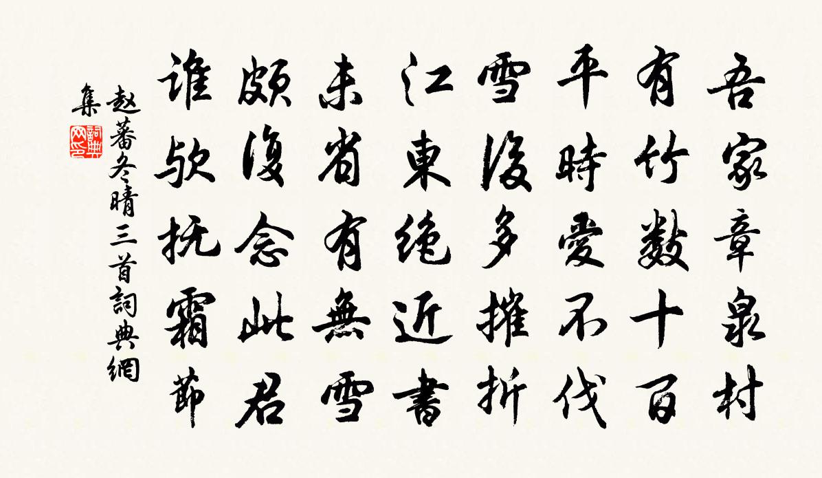 詩詞名句歷史字典書法欣賞書法字典國語詞典說文解字康熙字典古漢語字典標 題 作 者 詩 句 冬晴三首作者:趙蕃 朝代:宋代冬晴三首原文吾家章泉村,有竹數十百。平時愛不伐,雪後多摧折。江東絕近書,未省有無雪。頗復念此君,誰歟撫霜節。詩詞問答問:冬晴三首的作者是誰?答:趙蕃問:冬晴三首寫於哪個朝代?答:宋代趙蕃冬晴三首書法欣賞冬晴三首書法作品詩詞推薦夏日雜題陸游〔宋代〕渚蒲經雨送微馨,野鶴凌風有墮翎。歸入衡門天薄暮,清溝淺浸兩三星。愛玉女洞中水既致兩瓶恐後復取而為使者見紿蘇軾〔宋代〕之調水符欺謾久成俗,關市有契繻。誰知南山下,取水亦置符。古人辨淄澠,皎若鶴與鳧。吾今既謝此,但視符有錢仲庸主簿入京三首裘萬頃〔宋代〕風帆轉眼即長安,好在交遊半達官。既有王陽知貢禹,不妨乘興一彈冠。浮丘道人招魂歌汪元量〔宋代〕有詩有詩吟嘯集,紙上飛蛇歕香汁。杜陵寶吃得開埤親拾,滄海月明老珠泣。天地長留國風什,鬼神護呵六丁立。大漠行(一作胡皓詩)崔湜〔唐代〕單于犯薊壖,驃騎略蕭邊。南山木葉飛下地,北海蓬根亂上天。科斗連營太原道,魚麗合陣武威川。三軍遙倚仗,哭呂衡州八郎中竇鞏〔唐代〕今朝血淚問蒼蒼,不分先悲旅館喪。人送劍來歸隴上,雁飛書去叫衡陽。還家路遠兒童小,埋玉泉深晝夜長。望盡眼兒媚(柳)尹煥〔宋代〕垂楊裊裊蘸清漪。明綠染春絲。市橋系馬,旗亭沽酒,無限相思。雲梳雨洗風前舞,一好百般宜。不知為甚,落花放言王禹偁〔宋代〕人生唯問道如何,得喪升沉總是虛。寧可飛鳥隨四皓,未能魚腹葬三閭。傅岩偶夢誰調鼎,彭澤高歌自荷鋤。不向禪人求贊四首釋宗杲〔宋代〕上無片瓦蓋頭,下無舊錐之地。赤骨{左骨右歷}個渾身,與人爭甚閒氣。些子無明奈何,說甚祖師西來意。南州行徐延壽〔唐代〕搖艇至南國,國門連大江。中洲西邊岸,數步一垂楊。金釧越溪女,羅衣胡粉香。織縑春卷幔,采蕨暝提筐。弄瑟贈黃槐谷趙必象〔宋代〕上下乾坤亂失經,禍淫禍善事冥冥。老天自是無分曉,更向痴人說五星。贈長安趙先生母佚名〔宋代〕牙發重生黑,延齡三事因。至誠遵道友,精謹奉高真。靜意摛猿馬,清心聚氣神。處端聊拜上,稽首壽長人。偶題溫庭筠〔唐代〕孔雀眠高閣,櫻桃拂短檐。畫明金冉冉,箏語玉纖纖。細雨無妨燭,輕寒不隔簾。欲將紅錦段,因夢寄江淹。青玉案元好問〔金代〕落紅吹滿沙頭路。似總為、春將去。花落花開春幾度。多情惟有,畫梁雙燕,知道春歸處。鏡中冉冉韶華暮。欲寫虛飄飄曹勛〔宋代〕虛飄飄,虛飄飄。禹門 * 浪,仙子百花橋,雪霙輕作霰,檐溜凍成條。遊絲千尺綱春色,掣電一抹收遠霄。虛飄三姝媚(櫻桃)王沂孫〔宋代〕紅纓懸翠葆。漸金鈴枝深,瑤階花少。萬顆燕支,贈舊情、爭奈弄珠人老。扇底清歌,還記得、樊姬嬌小。幾度相村居即事六言十首劉克莊〔宋代〕有時散發鬆風,有時一劍秋空。講易白牛谿上,題詩黃鶴樓中。山中三首劉應時〔宋代〕年來世路愈間關,且喜兒童放我閒。百歲光陰無一半,萊衣能得幾時斑。偈頌二十一首釋智愚〔宋代〕老不禁寒,山邊水邊曝日。春歸閬苑,長底短底從新。笙歌叢里賀年朝,錦筵中開壽域。衲僧門下別有條章,每日句程師孟〔宋代〕行吟漸出蕉花嶺,歸夢應先荔子樓。名句推薦江南江北愁思,分付酒螺紅方岳《水調歌頭·平山堂用東坡韻》 心斷新豐酒,銷愁斗幾千。李商隱《風雨》 昨夜更闌酒醒,春愁過卻病。李璟《應天長·一鉤初月臨妝鏡》 吃不了兜著走曹雪芹《紅樓夢·第二十三回》 淮水東邊舊時月,夜深還過女牆來。劉禹錫《金陵五題·石頭城》 短夢依然江表,老淚灑西州。張炎《八聲甘州·記玉關踏雪事清游》 庶人莫與官爭,貴人不結人怨。來俊臣《羅織經·保身卷第七》 貧賤之知不可忘,糟糠之妻不下堂。范曄《後漢書·列傳·伏侯宋蔡馮趙牟韋列傳》 水際輕煙,沙邊微雨。荷花芳草垂楊渡。劉將孫《踏莎行·閒遊》 四百年來成一夢,堪愁。王安石《南鄉子·自古帝王州》