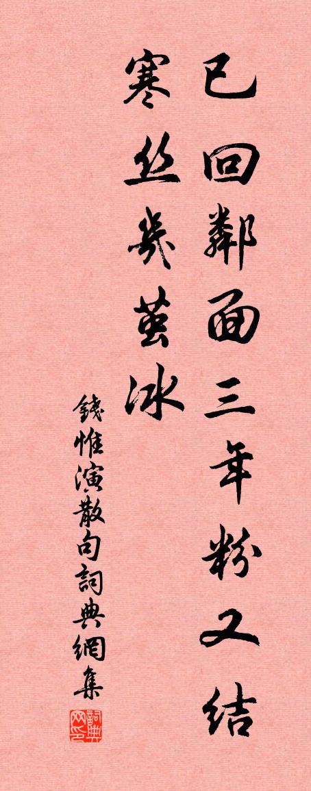 詩詞名句歷史字典書法欣賞書法字典國語詞典說文解字康熙字典古漢語字典標 題 作 者 詩 句 句作者:錢惟演 朝代:宋代句原文已回鄰面三年粉,又結寒絲幾繭冰。詩詞問答問:句的作者是誰?答:錢惟演問:句寫於哪個朝代?答:宋代錢惟演句書法欣賞句書法作品詩詞推薦和答還卷張舜民〔宋代〕屈宋功成道不傳,後來雞犬各登仙。留連光景隨時俗,盜竊聲名至暮年。陷沒李陵因北伐,漂流杜甫為南遷。耒陽拒霜陳與義〔宋代〕拒霜花已吐,吾宇不悽涼。天地雖肅殺,草木有芬芳。道人宴坐處,侍女古時妝。濃露濕丹臉,西風吹綠裳。涌金池董嗣杲〔宋代〕一道香溝壓郭西,粉牆低護石階危。短碑數尺鐫何字,清泰三年鑿此池。橋市浣衣無空處,廟門賣卜有靈時。碧桃頌古二十一首釋鼎需〔宋代〕騎虎頭,把虎尾,霹靂一聲驚萬里。坐觀成敗老將軍,腦後一槌誰敢擬。擬不擬,個個無裩長者子。求黃家紫竹杖蘇轍〔宋代〕曾家紫竹君家種,曾園竹與荒藤共。藤驕竹瘁如畏人,不似君家竹森聳。我來買宅非為宅,愛此風梢時一弄。磨刀千尺泉陳岩〔宋代〕下臨無地上連天,中有飛流涌滿泉。今我不圖今日到,詩成要檄兩龍眠。乞休得旨謝恩諸葛賡〔宋代〕三疏陳情始放歸,蕭蕭白髮解朝衣。未營別業王官谷,先駕扁舟嚴子磯。視草龍螭猶眷戀,還家鷗鷺自光輝。老臣夏夜賈島〔唐代〕原寺偏鄰近,開門物景澄。磬通多葉罅,月離片雲棱。寄宿山中鳥,相尋海畔僧。唯愁秋色至,乍可在炎蒸。應天長(三潭印月)張矩〔宋代〕桂輪逼采,菱沼漾金,潛虬暗動鮫室。水路乍疑霜雪,明眸洗春色。年時事,還記憶。對萬頃,葑痕龜坼。舊遊處送王校理守琅琊司馬光〔宋代〕金門倦鳴玉,千騎出東方。封略依滄海,枌榆近故鄉。秦碑苔蝕字,鄅稻日翻芒。國吏遙應識,當年丞相郎。減字木蘭花(和孔純老別)王之道〔宋代〕離筵暫住。君在龍舒曾是主。今作行人。臥轍何妨借寇恂。清歌妙舞。斷送吟鞭乘醉去。一釂休辭。捧爵佳人玉箸採蓮子·船動湖光灩灩皇甫松〔唐代〕船動湖光灩灩秋,貪看年少信船流。無端隔水拋蓮子,遙被人知半日羞。贈洪善慶興祖和壁閒沈□□韻顧禧〔宋代〕高臥煙蘿欽上地,姓名獨許古人知。我來欲補洪家傳,入坐先尋沈約詩。舒捲閒雲看不厭,參差玉蝶放偏遲。殷勤偈僧某〔宋代〕彌勒真彌勒,分身千百億。時時示世人,世人俱不識。瀑布泉陳沂〔〕雲間瀑布三千尺,天外回峰十二重。滿耳怒雷飛急雨,轉頭紅日在青松。詠史上董仲舒三首陳普〔宋代〕孟軻死後惟董子,道義兩言擴古今。性善七篇何落落,千秋不遇一知音。喜晴趙蕃〔宋代〕梅花已遂凍泥空,留得余香傲晚風。春事十分財入手,只愁病眼眩青紅。贈毛仙翁楊於陵〔唐代〕先生赤松侶,混俗遊人間。昆閬無窮路,何時下故山。千年猶孺質,秘術救塵寰。莫便沖天去,雲雷不可攀。憶君王/憶王孫謝克家〔宋代〕依依宮柳拂宮牆。樓殿無人春晝長。燕子歸來依舊忙。憶君王。月破黃昏人斷腸。右軍墨池劉言史〔唐代〕永嘉人事盡歸空,逸少遺居蔓草中。至今池水涵餘墨,猶共諸泉色不同。名句推薦梅花大庾嶺頭髮,柳絮章台街里飛。李商隱《對雪二首》 滿堂唯有燭花紅,歌且從容,杯且從容。辛棄疾《一剪梅·中秋元月》 日落沙明天倒開,波搖石動水縈迴李白《東魯門泛舟二首》 清水出芙蓉,天然去雕飾。李白《經亂離後天恩流夜郎憶舊遊書懷贈江夏韋太守良宰》 牛群食草莫相觸,官家截爾頭上角。李涉《牧童詞》 以此虧奪民衣食之財,仁者弗為也。墨子《墨子·32章 非樂(上)》 且趁閒身未老,盡放我、些子疏狂。蘇軾《滿庭芳·蝸角虛名》 翹思慕遠人,願欲托遺音。曹植《雜詩六首·其一》 痛飲狂歌空度日,飛揚跋扈為誰雄。杜甫《贈李白》 回首故山千里外,別離心緒向誰言?楊徽之《寒食寄鄭起侍郎》
