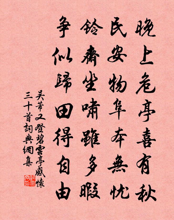 詩詞名句歷史字典書法欣賞書法字典國語詞典說文解字康熙字典古漢語字典標 題 作 者 詩 句 又登碧雲亭感懷三十首作者:吳芾 朝代:宋代又登碧雲亭感懷三十首原文晚上危亭喜有秋,民安物阜本無憂。鈴齋坐嘯雖多暇,爭似歸田得自由。詩詞問答問:又登碧雲亭感懷三十首的作者是誰?答:吳芾問:又登碧雲亭感懷三十首寫於哪個朝代?答:宋代吳芾又登碧雲亭感懷三十首書法欣賞又登碧雲亭感懷三十首書法作品詩詞推薦雜吟 其二王冕〔元代〕出門好山色,況值風日暄。依依楊柳莊,鬱郁桑柘村。行游蹊路曲,如在故林園。白煙橫遠嶼,紅花粲晴原。人生冬夜聞蛩顧逢〔宋代〕尚有一蛩在,悲吟廢草邊。想於深夜裡,自憶早秋前。勝負皆成夢,孤寒似可憐。晚年飄泊老,此況亦同然。次韻李肩吾讀易亭山茶梅魏了翁〔宋代〕梅華鶴羽白,茶華鶴頭紅。拱揖鶴山翁,始授宗人同。山間兩賓主,窮極造化功。易終得未濟,曹未觀豳風。或嗟題時覺寺在在堂十二首舒坦〔宋代〕榛棘叢中舊草堂,千年誰復辯興亡。累累付與張儀印,珍重空中一炷香。搗衣詩柳惲〔南北朝〕孤衾引思緒。獨枕愴憂端。深庭秋草綠。高門白露寒。思君起清夜。促柱奏幽蘭。不怨飛蓬苦。徒傷蕙草殘。行役哭潘德久徐照〔宋代〕不得身為郡,歸來兩鬢青。方言營隱地,豈擬落文星。字有佳人學,琴無野鶴聽。傷心共吟邊,殘墨在窗欞。上冊寶十三首真宗〔宋代〕禮備既備,神保聿歸。洋洋在上,不可度思。神不來兮,肸鄉之隨。神不去兮,休嘉是貽。謝潘端叔惠紅梅樓鑰〔宋代〕歲晚紅英繞凍柯,玉人無那醉顏酡。廣平賦就如逢妝,鐵石心腸可柰何。紹熙四年加上壽聖皇太后尊號八首佚名〔宋代〕懿典大冊,陳備邃深。怡怡愉愉,實坐是臨。重彩儼侍,深展肅心。三宮協慶,永播徽音。朋酒仇遠〔宋代〕朋酒朝朝樂,鄉心夜夜愁。朱雲難作吏,宋玉易悲秋。陵谷何曾改,田園未可求。南來幾鴻雁,亦為稻粱謀。西江月·遣興辛棄疾〔宋代〕醉里且貪歡笑,要愁那得工夫。近來始覺古人書。信著全無是處。(著 通:著)昨夜松邊醉倒,問松我醉何如。送周知監韓繹〔宋代〕蜀土風景信不好,君之所治兼蠻夷。山高地仄江水惡,刀耕火利黎民疲。觀妓人入道二首楊巨源〔唐代〕荀令歌鐘北里亭,翠娥紅粉敞雲屏。舞衣施盡餘香在,今日花前學誦經。碧玉芳年事冠軍,清歌空得隔花聞。春來蕊珠閒趙彥端〔宋代〕浦雲融,梅風斷,碧水無情輕度。有嬌黃上林梢,向春欲舞。綠煙迷晝,淺寒欺暮。不勝小樓凝佇。倦遊處。故人詠史下鍾會陳普〔宋代〕諸葛風流尚未休,山川為斬鄧鍾頭。至今青史憂吳蜀,莫把知人責夏侯。又送杜甫〔唐代〕雙峰寂寂對春台,萬竹青青照客杯。細草留連侵坐軟,殘花悵望近人開。同舟昨日何由得,並馬今朝未擬回。直到梅花白玉蟾〔宋代〕影上酥花峭,枝頭蠟糝清。姮娥約滕六,夜半過江城。贈汪孝子孟益〔宋代〕刻木為親古亦稀,汪生天性自無違。十年奉養如生日,回視丁蘭更有輝。罷徐州,往南京,馬上走筆寄子由五首蘇軾〔宋代〕父老何自來,花枝裊長紅。洗盞拜馬前,請壽使君公。前年無使君,魚鱉化兒童。舉鞭謝父老,正坐使君窮。窮人次韻廣州陳繹諫議和陳薦宋敏求二龍圖二首蘇轍〔宋代〕曾送飛龍白日翔,未應中路許還鄉。鶴歸仍有當年伴,松老知經幾度霜。城下寶坊聊寄榻,朝中振鷺舊成行。相逢名句推薦山映斜陽天接水,芳草無情,更在斜陽外范仲淹《蘇幕遮·懷舊》 青林翠竹,四時俱備。陶弘景《答謝中書書》 雪月最相宜,梅雪都清絕。張孝祥《卜運算元·雪月最相宜》 人有不為也,而後可以有為。孟子《孟子·離婁章句下·第八節》 聞之而不見,雖博必謬;見之而不知,雖識必妄;知之而不行,雖敦必困。荀子《荀子·儒效》 雨落不上天,水覆難再收。李白《妾薄命》 武皇去金閣,英威長寂寞江淹《銅爵妓》 秋江帶雨,寒沙縈水,人瞰畫閣愁獨。史達祖《八歸·秋江帶雨》 客睡何曾著,秋天不肯明杜甫《客夜》 兄弟不睦,則子侄不愛顏之推《顏氏家訓·兄弟篇》