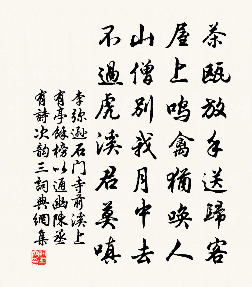 詩詞名句歷史字典書法欣賞書法字典國語詞典說文解字康熙字典古漢語字典標 題 作 者 詩 句 石門寺前溪上有亭余榜以通幽陳丞有詩次韻三作者:李彌遜 朝代:宋代原文茶甌放手送歸客,屋上鳴禽猶喚人。山僧別我月中去,不過虎溪君莫嗔。詩詞問答問:《石門寺前溪上有亭余榜以通幽陳丞有詩次韻三》的作者是誰?答:李彌遜問:該詩寫於哪個朝代?答:宋代書法欣賞石門寺前溪上有亭余榜以通幽陳丞有詩次韻三書法作品詩文賞析【原題】:石門寺前溪上有亭余榜以通幽陳丞有詩次韻三首詩詞推薦人日飯昭覺陸游〔宋代〕天涯羈旅逢人日,病起消搖集寶坊。雪水初融錦江漲,梅花半落綠苔香。家山松桂年年長,幕府文書日日忙。自笑方運使輓詞樓鑰〔宋代〕聖主一見決,孤忠自致身。籌邊滿軀膽,處事掇皮真。氣直老彌壯,言高用未伸。留屯十二事,公論付淮民。偈頌一百零九首釋可湘〔宋代〕清明前,寒食後,處處掃松,家愛插柳。祖意甚分明,茫然不知有。三皇冢上絕人游,芳草連天髑髏吼。飲散夜歸贈諸客白居易〔唐代〕鞍馬夜紛紛,香街起暗塵。回鞭招飲妓,分火送歸人。風月應堪惜,杯觴莫厭頻。明朝三月盡,忍不送殘春。雨後散步後園陸游〔宋代〕淡日輕雲未快晴,涓涓溝水去無聲。為憐一徑新 * ,別就牆陰取路行。高南仲自雲間歸退軒蓋明府以四詩送之末章專孫應時〔宋代〕麗澤存相益,和羹忌敬同。別懷長耿耿,見日苦匆匆。經派懲燕說,詞源味國風。平生子陳了,一瓣記南豐。招楊德逢王安石〔宋代〕山林投老倦紛紛,獨臥看雲卻憶君。雲尚無心能出岫,不應君更懶於雲。刑賞忠厚之至論蘇軾〔宋代〕堯、舜、禹、湯、文、武、成、康之際,何其愛民之深,憂民之切,而待天下以君子長者之道也。有一善,從而賞折丹桂程大昌〔宋代〕童年未曉君恩重。教得能趨拱。重親帶笑酌天杯,聽祝語、殷勤捧。青衫得掛尤光寵。桂是蟾宮種。詩書濃處便生寄職方劉郎中韋應物〔唐代〕相聞二十載,不得展平生。一夕南宮遇,聊用寫中情。端服光朝次,群烈慕英聲。歸來坐粉闈,揮筆乃縱橫。始陪偈頌五首釋文禮〔宋代〕七尺單前,一 * 地。橫亘十方,豎窮三際。隴上行王涯〔唐代〕負羽到邊州,鳴笳度隴頭。雲黃知塞近,草白見邊秋。送才上人還雪竇寄達觀禪師梅堯臣〔宋代〕春雪滿蓑笠,海邊先燕歸。千林新改葉,百衲舊來衣。溪水從何至,山雲自解飛。報言岩下客,齋缽筍應肥。望遠行佚名〔宋代〕當時雲雨夢,不負楚王期。翠峰中、高樓十二掩瑤扉。盡人間歡會,只有兩心自知。漸玉困花柔香汗揮。歌聲翻別香林峰陳岩〔宋代〕幾許山花照夕陽,不栽不植自芬芳。林梢一點風微起,吹作人間百合香。次韻子都寄示和大監叔西湖早春李洪〔宋代〕白蓮尋淨社,紫氣覘幽關。吏隱無公事,鷗盟俯碧灣。泉聲雜鳥哢,雲臥愛僧閒。更欲支筇去,過溪多好山。誡子吟邵雍〔宋代〕有過不能改,知賢不肯親。雖生人世上,未得謂之人。謝葺芷和韻鄭清之〔宋代〕無詩不言酒,作賦真誑腹。未破公子慳,況與佳人目。壯心思擊壺,聖杯賡啄木。袖想胡旋雙,妝記搖手獨。賓筵馬斃三首仇遠〔宋代〕苦無馳驟但加餐,馬性由來不耐閒。官滿馬亡歸去好,且騎白犢看青山。和蔣發運蘇軾〔宋代〕夜語翻千偈,書來又一言。此身真佛祖,何處不羲軒。船穩江吹坐,樓空月入樽。遙知思我處,醉墨在頹垣。名句推薦斜陽外,寒鴉萬點,流水繞孤村。秦觀《滿庭芳·山抹微雲》 萬里歸船弄長笛,此心吾與白鷗盟。黃庭堅《登快閣》 行人悵望蘇台柳,曾與吳王掃落花。姜夔《姑蘇懷古》 去年夜半橫江夢,倚危檣,參差曾賦劉辰翁《桂枝香· * 人去》 事非宜,勿輕諾。苟輕諾,進退錯。李毓秀《弟子規·信》 兵務 神速,事貴合機。令狐德棻《周書·列傳·卷二十五》 驪山四顧,阿房一炬,當時奢侈今何處?張養浩《山坡羊·驪山懷古》 不讓則不和,不和不可以遠征。左丘明《左傳·定公·定公五年》 怕相思,已相思,輪到相思沒處辭,眉間露一絲。俞彥《長相思·折花枝》 望君煙水闊,揮手淚沾巾。劉長卿《餞別王十一南遊》