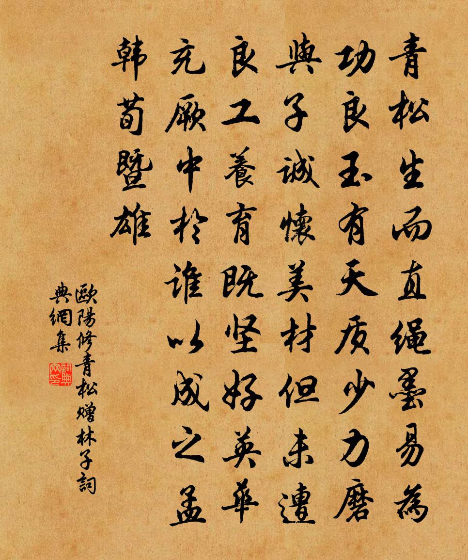 詩詞名句歷史字典書法欣賞書法字典國語詞典說文解字康熙字典古漢語字典標 題 作 者 詩 句 青松贈林子作者:歐陽修 朝代:宋代青松贈林子原文青松生而直,繩墨易為功。良玉有天質,少力磨與◇。子誠懷美材,但未遭良工。養育既堅好,英華充厥中。於誰以成之,孟韓荀暨雄。詩詞問答問:青松贈林子的作者是誰?答:歐陽修問:青松贈林子寫於哪個朝代?答:宋代問:歐陽修的名句有哪些?答:歐陽修名句大全歐陽修青松贈林子書法欣賞青松贈林子書法作品詩詞推薦征南謠楊維楨〔元代〕錢塘江頭點行軍,大嫂金鼓聲殷殷。千里萬里雞犬絕,杳杳南國深蠻雲。蠻邦父母若不仁,九重天子深無聞。草間天涯李商隱〔唐代〕春日在天涯,天涯日又斜。鶯啼如有淚,為濕最高花。荊溪道中厲鶚〔清代〕如畫雲嵐西復西,梁溪幾折入荊溪?舟師失道隔煙問,山鳥畏人穿竹啼。閉戶丘葵〔宋代〕芝蘭豈是為人香,濁世紛紛貴自藏。閉戶不求如意事,讀書自得養心方。卓然有見如參倚,操則常存勿助忘。但使送黃叔寓赴平江教授王之望〔宋代〕人生水中萍,泛泛隨波瀾。偶然成聚散,誰使為悲歡。伊余從君游,兩見歲履端。相得恨不早,相見常苦難。今又寄長沙燕守度鄭獬〔宋代〕魏都南館相逢日,鬧向春風倒一尊。連夜花開駐歸騎,即時席上插降旛。雲藏夢澤煙蒲老,秋卷湘江雪浪翻。聞道老人松方信孺〔宋代〕上古輪囷說壽樗,何人玉斧劚霜腴。有知定見非凡物,盍作堂堂五大夫。醉歸陸游〔宋代〕夜分飲散酒家壚,歸路迢迢月滿湖。小豎竊言翁未醉,入門猶記露菖蒲。新荷詹初〔宋代〕青荷小小初凌水,梗直中虛不著塵。為道人心本然處,直虛原與物為同。冬蚊劉克莊〔宋代〕南州時令舛,冬月有蚊飛。豈是為飢崇,因而觸禍機。照尤嫌畫燭,驅尚入羅幃。吾母音容遠,何妨用扇揮。九日吟釋文珦〔宋代〕又過一番秋。秋應笑白頭。任教花自笑,其奈我忘憂。未死聊遊戲,才亡即罷休。應知皆是幻,盡底付悠悠。自雲門之陶山肩輿者失道行亂山中有茅舍小塘陸游〔宋代〕陂池幽處有茅堂,井臼蕭絛草樹荒。小鴨怯波時聚散,病蔬傷蠹半青黃。童兒沖雨收魚網,婢子聞鐘上佛香。我亦傷翁外甥黃滔〔唐代〕江頭去時路,歸客幾紛紛。獨在異鄉歿,若為慈母聞。青春成大夜,新雨壞孤墳。應作芝蘭出,泉台月桂分。寄周洪道參政陸游〔宋代〕菱舟煙雨久思歸,貪戀明時未拂衣。乞與一城教睡足,猶能覓句寄黃扉。園中雜詠陸游〔宋代〕珍禽下上鳴,迨及清潤時;豈惟侑我觴,亦以起我詩。白練一團雪,來與紅練俱。魚虎飛照水,意若愛翠裾。過下梅楊萬里〔宋代〕不特山盤水亦回,溪山信美暇徘徊。行人自趁斜陽急,關得歸鴉更苦催。蝶戀花(稼軒坐間作,首句用丘六書中語)楊炎正〔宋代〕點檢笙歌多釀酒。不放東風,獨自迷楊柳。院院翠陰停永晝。曲欄隋處堪垂手。昨日解酲今夕又。消得情懷,長被離相院丘葵〔宋代〕一夕僧留宿,翛然萬慮空。草分仙掌綠,芬發御袍紅。白鳥松梢雪,玄談塵尾風。因悲人世上,終日業塵中。偈頌六十五首釋普濟〔宋代〕迦葉首傳,龍潭只滅。一燈一燈,燈燈不絕。偈頌一百四十一首釋師範〔宋代〕一年十二月,只余此一月。此月極盡處,又見明年月。循環既無端,何勞強分別。名句推薦獨立雕欄,誰憐枉度華年。王沂孫《高陽台·殘萼梅酸》 北極朝廷終不改,西山寇盜莫相侵。杜甫《登樓》 非知之難也,處知則難也。韓非及後人《韓非子·說難》 人悄悄,簾外月朧明。岳飛《小重山·昨夜寒蛩不住鳴》 儉則傷事,侈則傷貨管仲《管子·乘馬》 馬毛帶雪汗氣蒸,五花連錢旋作冰,幕中草檄硯水凝。岑參《走馬川行奉送出師西征 / 走馬川行奉送封大夫出師西征》 君不肖,則國危而民亂,君賢聖則國安而民治,禍福在君不在天時。姜子牙《六韜·文韜·盈虛》 一尺深紅勝麴塵,天生舊物不如新。溫庭筠《南歌子詞二首 / 新添聲楊柳枝詞》 枯枝無醜葉,涸水吐清泉李白《長歌行》 日暮秋煙起,蕭蕭楓樹林。戴叔倫《過三閭廟》